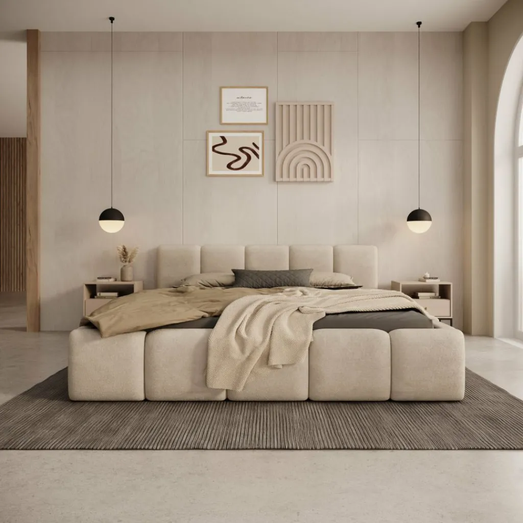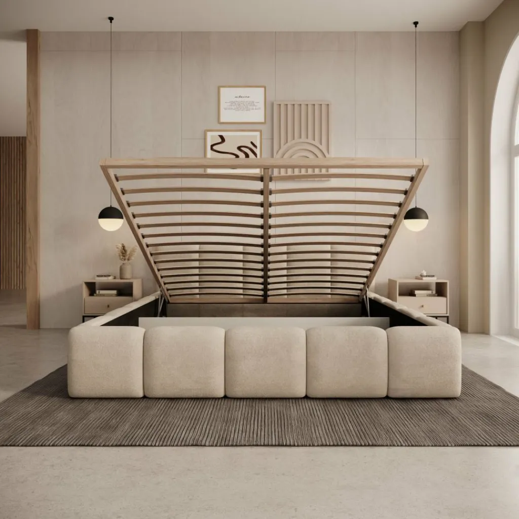 Tweepersoonsbed Karisma is een gestoffeerd bed met opbergruimte, uitgevoerd in beige teddystof en geschikt voor een matras van 160×200 cm. Het bed heeft een lage, brede vormgeving met een strak opgebouwd hoofdbord en een volledig rondom beklede bedombouw. De teddystof zorgt voor een gelijkmatige afwerking en sluit goed aan bij moderne slaapkamers.
