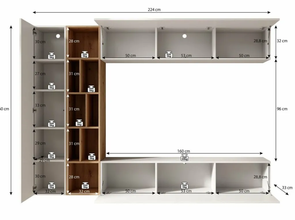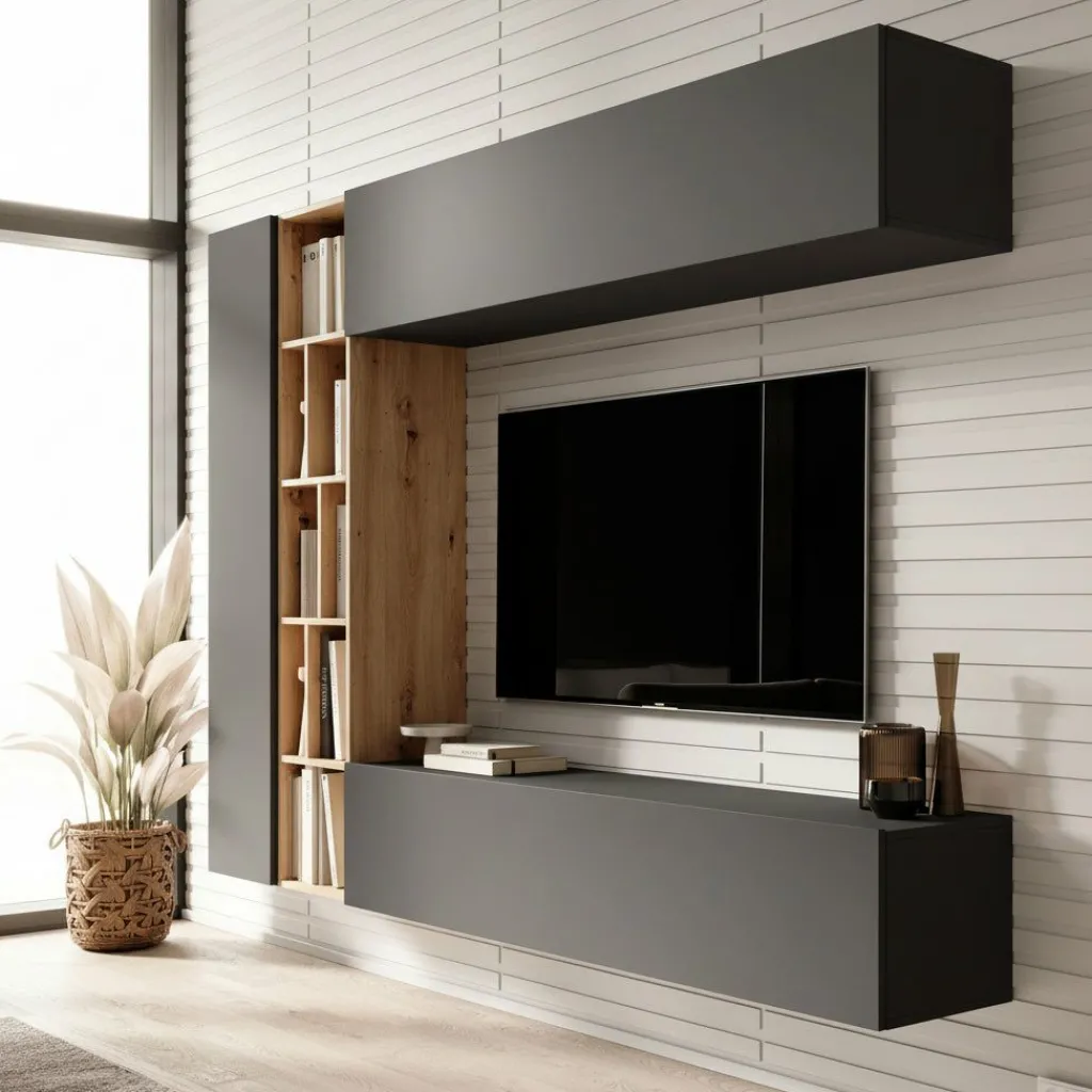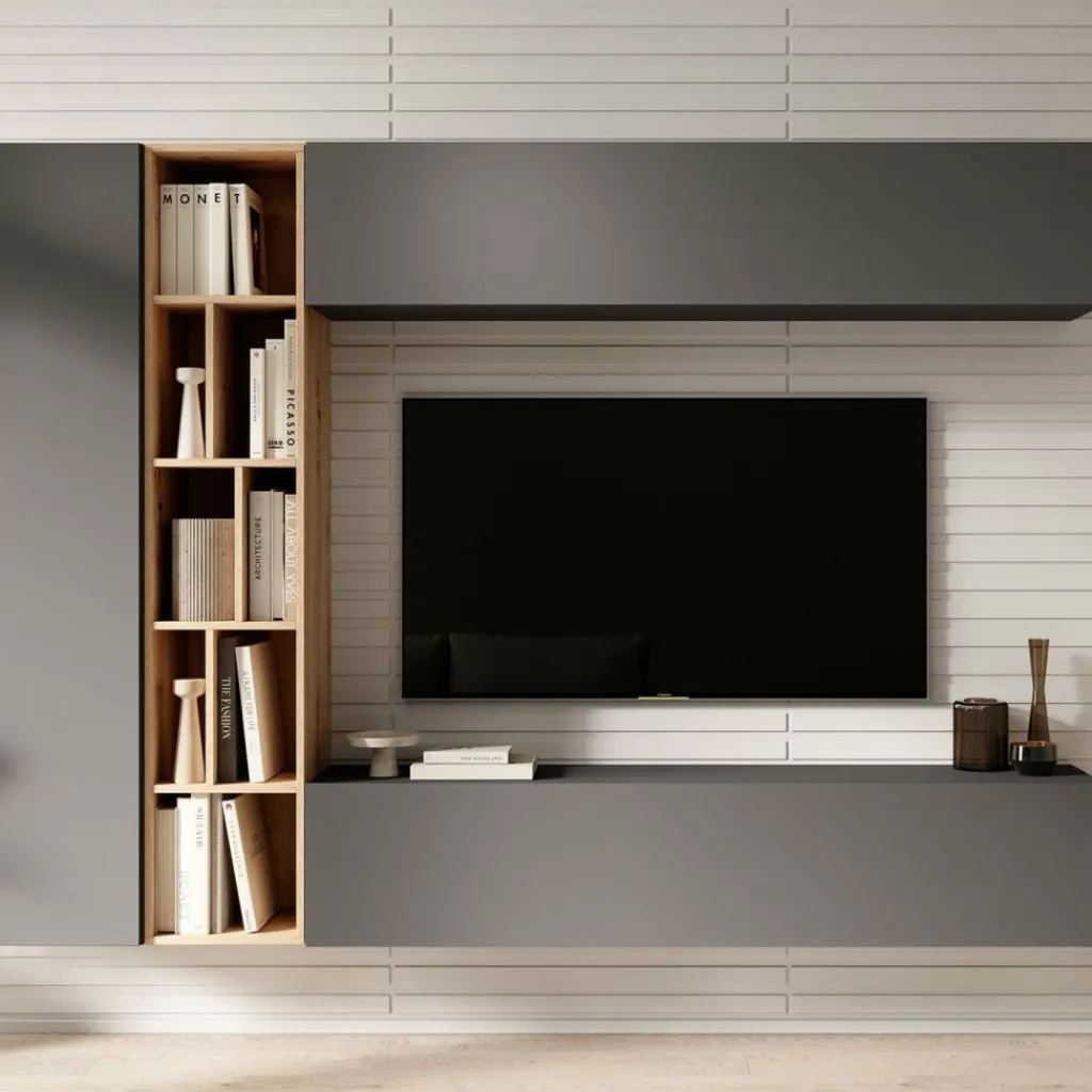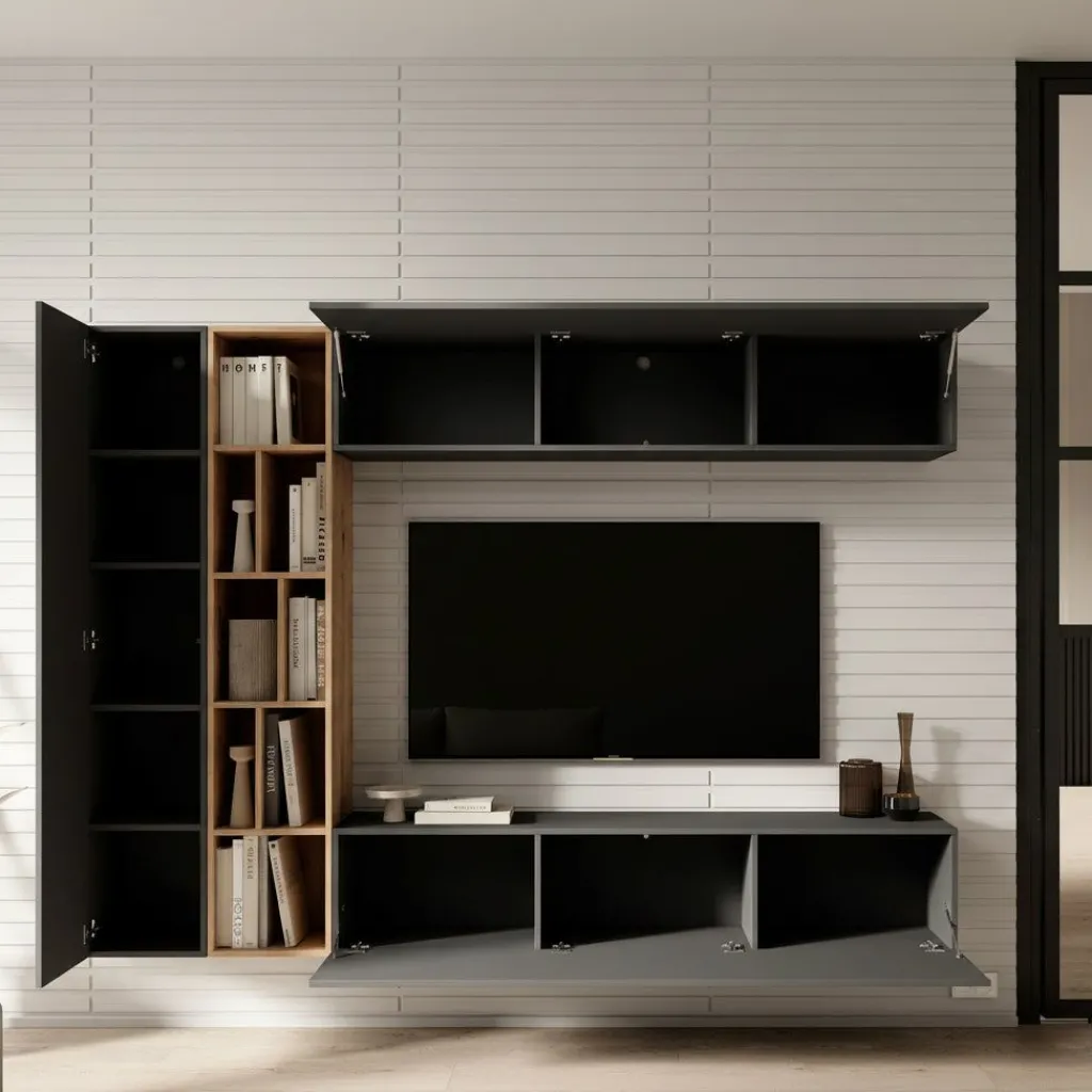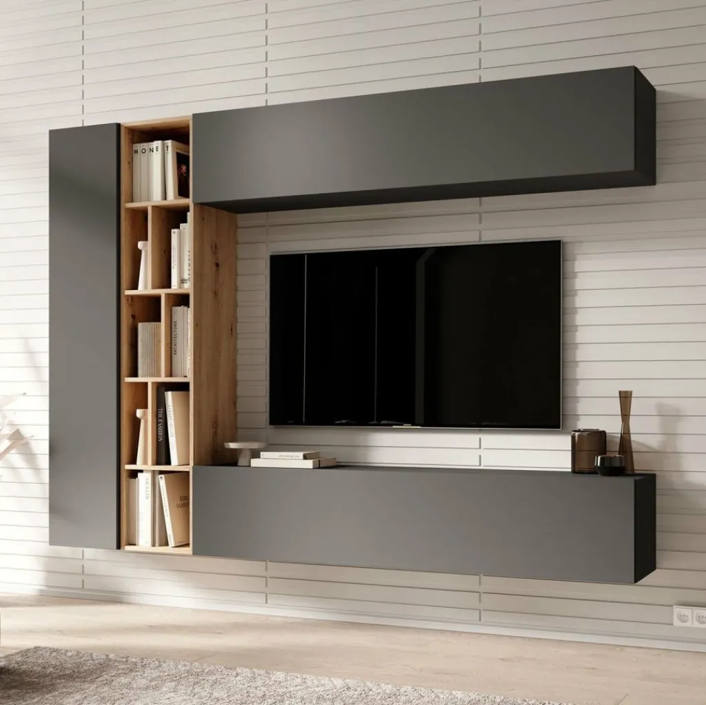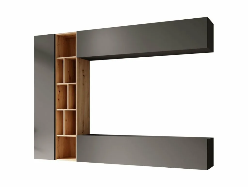 Wandmeubel Kastila is een set van verschillende meubels met ruime opbergmogelijkheden, uitgevoerd in spaanplaat met een imitatieprint (melamine coating) in grijze en eiken kleur. De set bestaat uit een tv-meubel, twee opbergkasten en wandkast. De meubels zijn als een volledig wandmeubel samengesteld. Het tv-meubel beschikt over een klepdeur met daarachter opbergruimte. In de achterwand zit een uitsparing om bekabeling weg te werken van apparatuur. De linker opbergkast is afgesloten door een deur. In het midden bevindt zich een open boekenkast in eiken kleur. De wandkast heeft een klepdeur met nog eens drie opbergvakken. Ruimte genoeg om je spullen op te kunnen bergen. De meubels zijn ook individueel van elkaar op te hangen.