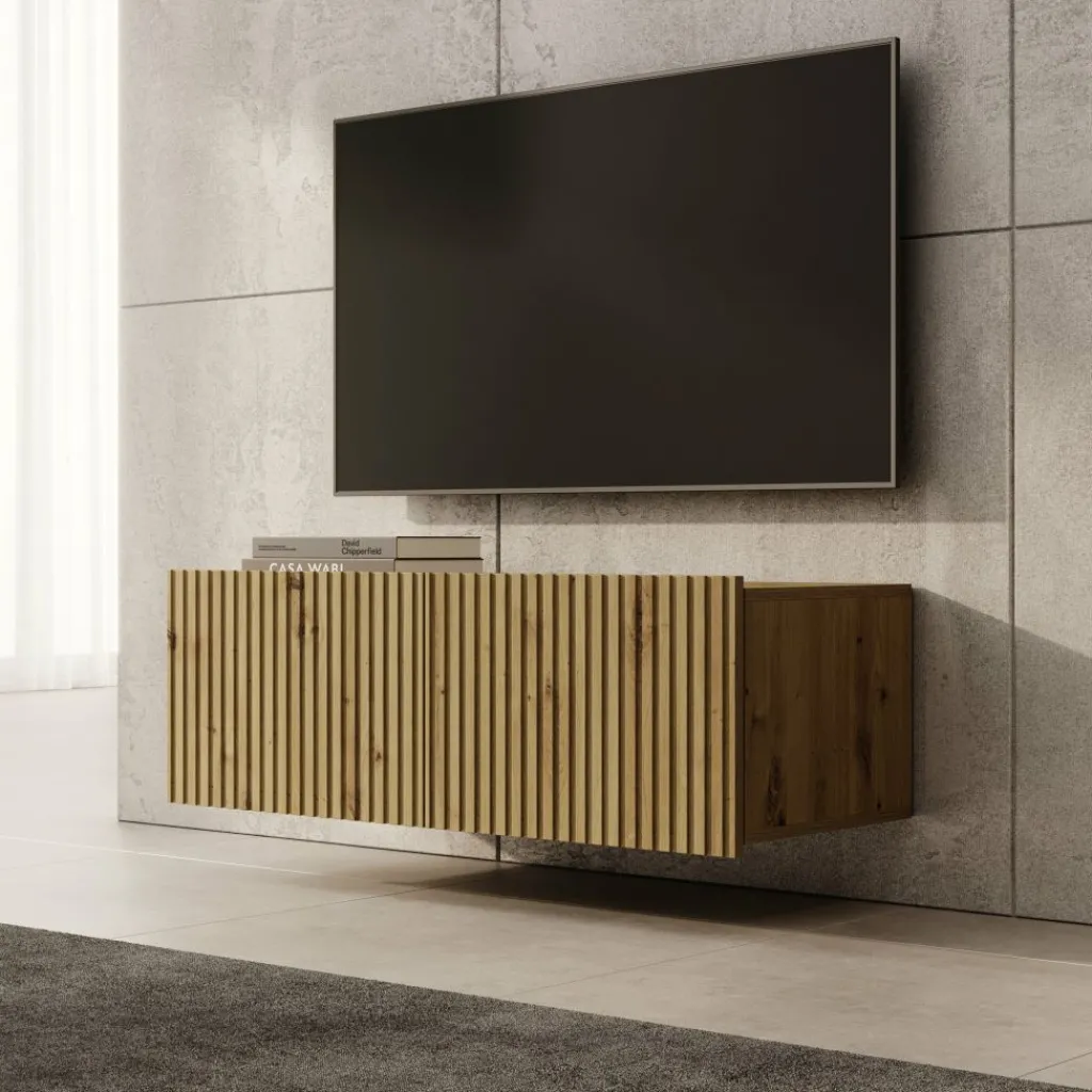 TV-Meubel Kenderes is een opbergkast voor onder de tv in moderne stijl, afgewerkt in een eikenhouten kleur. Het model beschikt over 2 deuren met daarachter 2 opbergvakken. De deuren zijn greeploos en via de boven- of onderkant te openen.