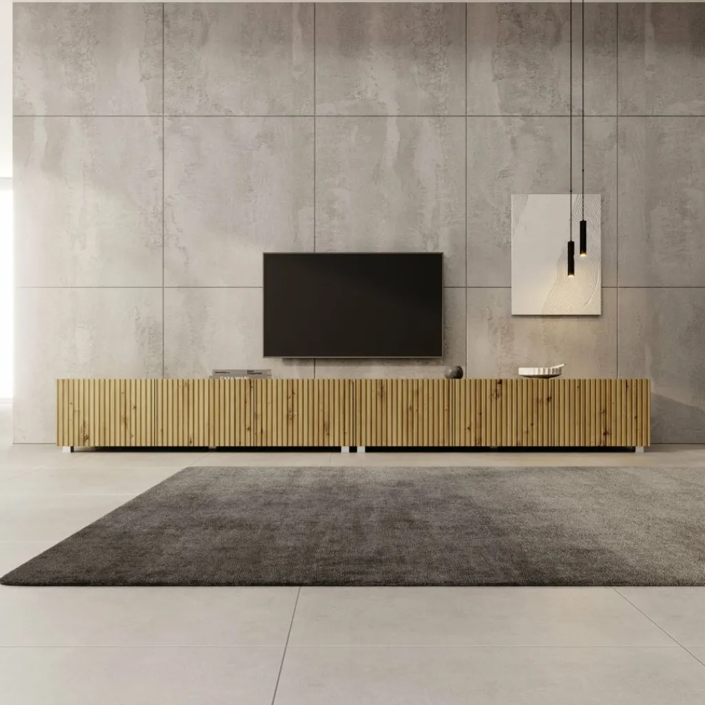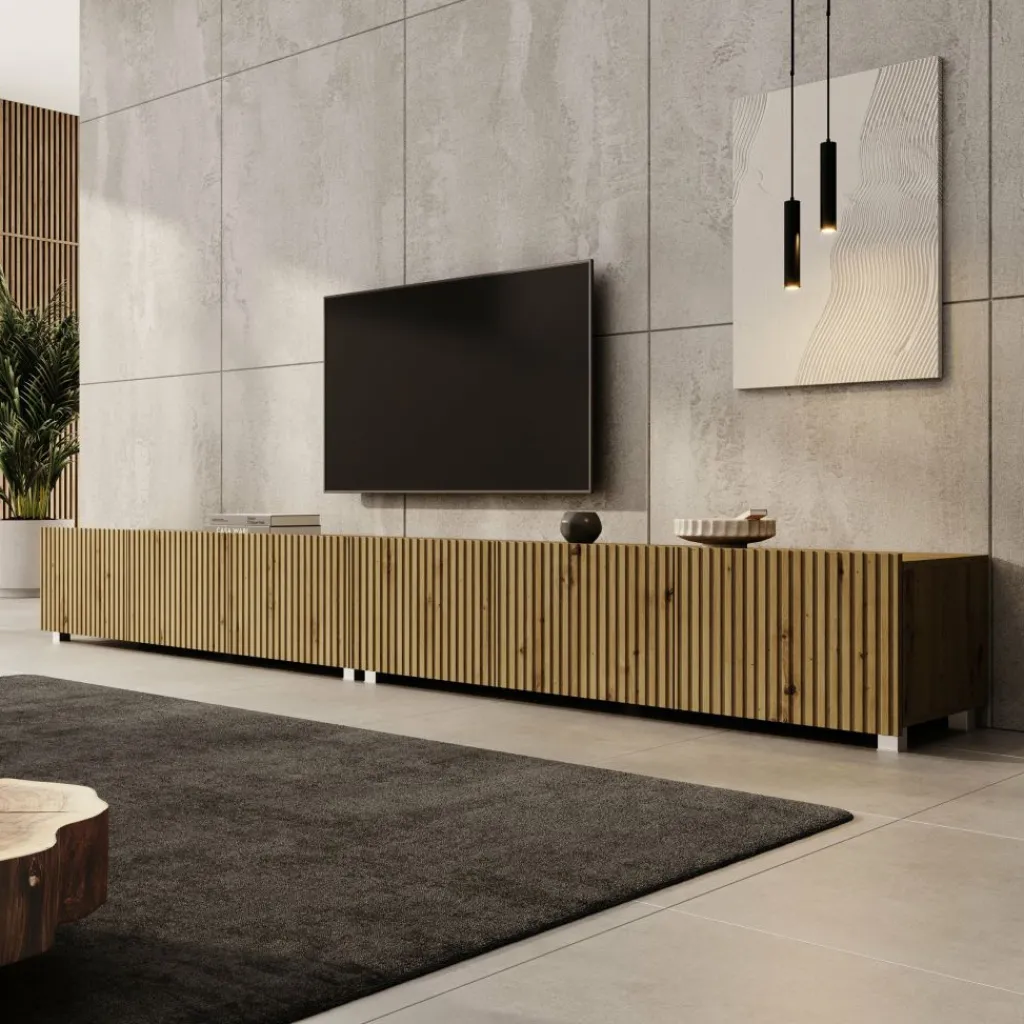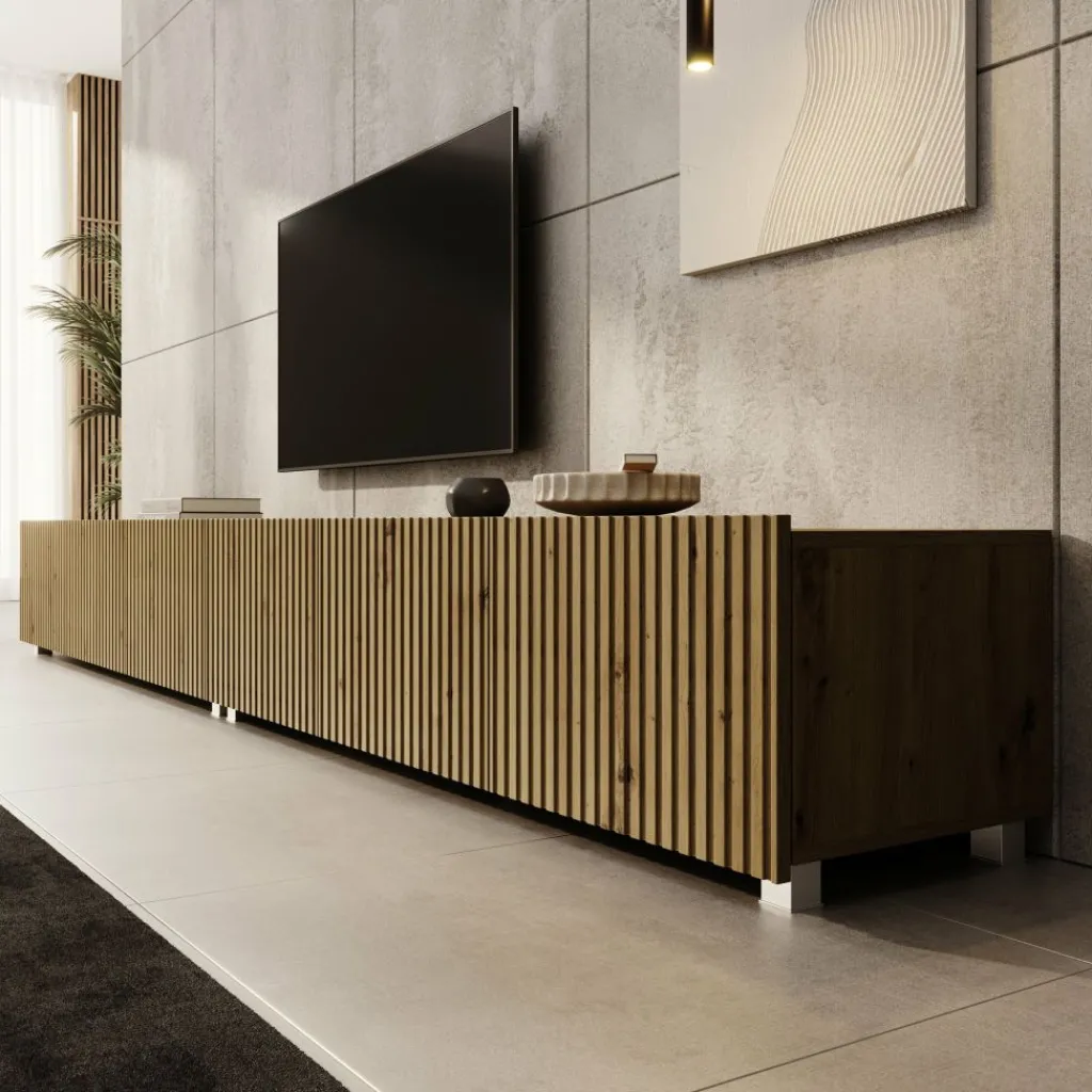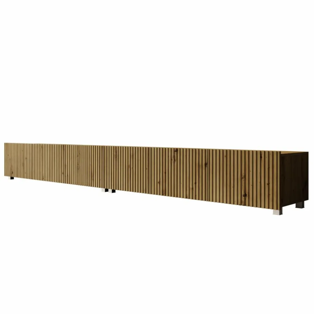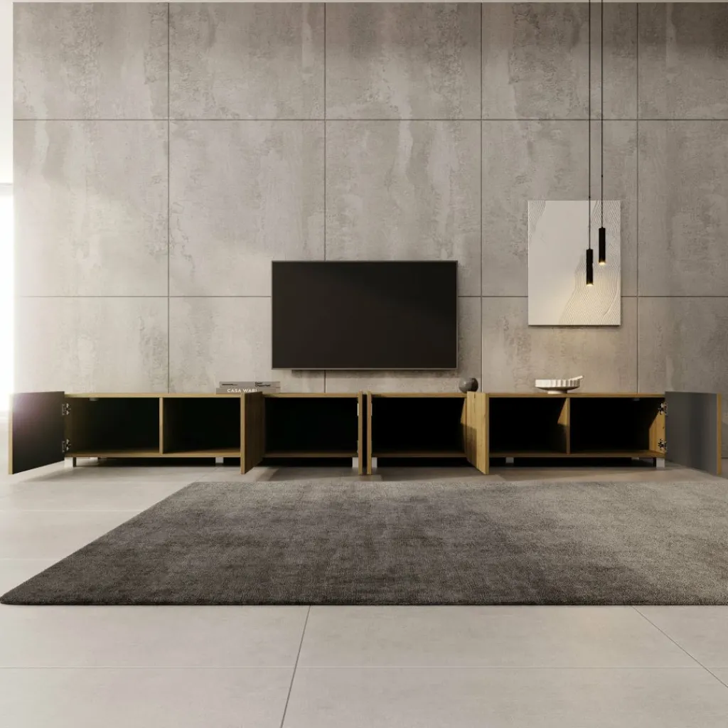 TV-Meubel Kenderes is een opbergkast voor onder de tv in moderne stijl, afgewerkt in een eikenhouten kleur. Deze TV kast bestaat uit 2 elementen van 150 cm. Ieder element beschikt over 3 deuren met daarachter 3 opbergvakken. De deuren zijn greeploos en via de boven- of onderkant te openen.