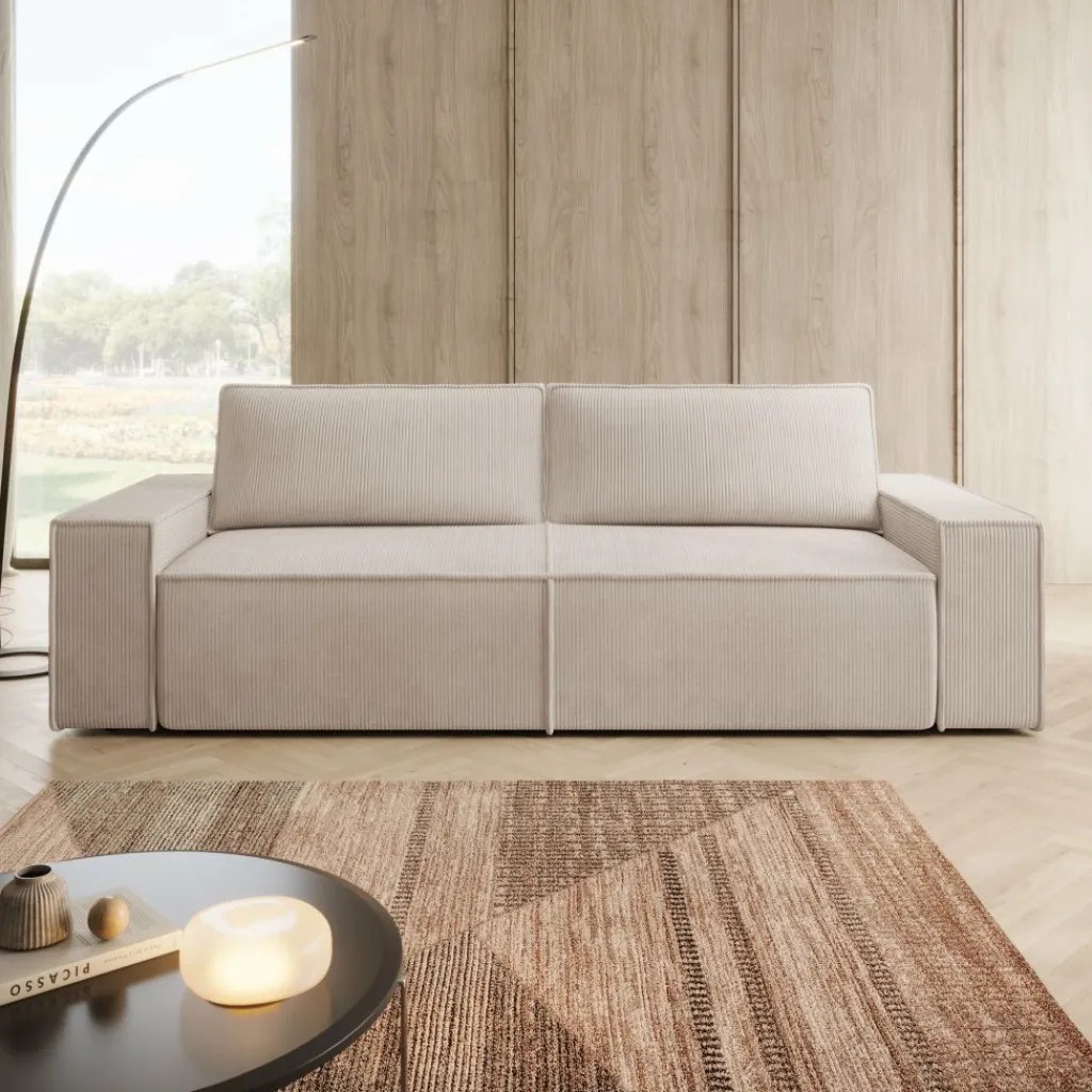 De Khaos 3-zitsbank in beige ribstof is een stijlvolle en comfortabele toevoeging aan elk interieur. Het tijdloze ontwerp en de zachte, duurzame ribstof geven de bank een warme en uitnodigende uitstraling. Dankzij de ruime afmetingen van 245x90x82 cm is er genoeg plek om heerlijk te ontspannen, of het nu is om samen een film te kijken of een moment voor jezelf te nemen.