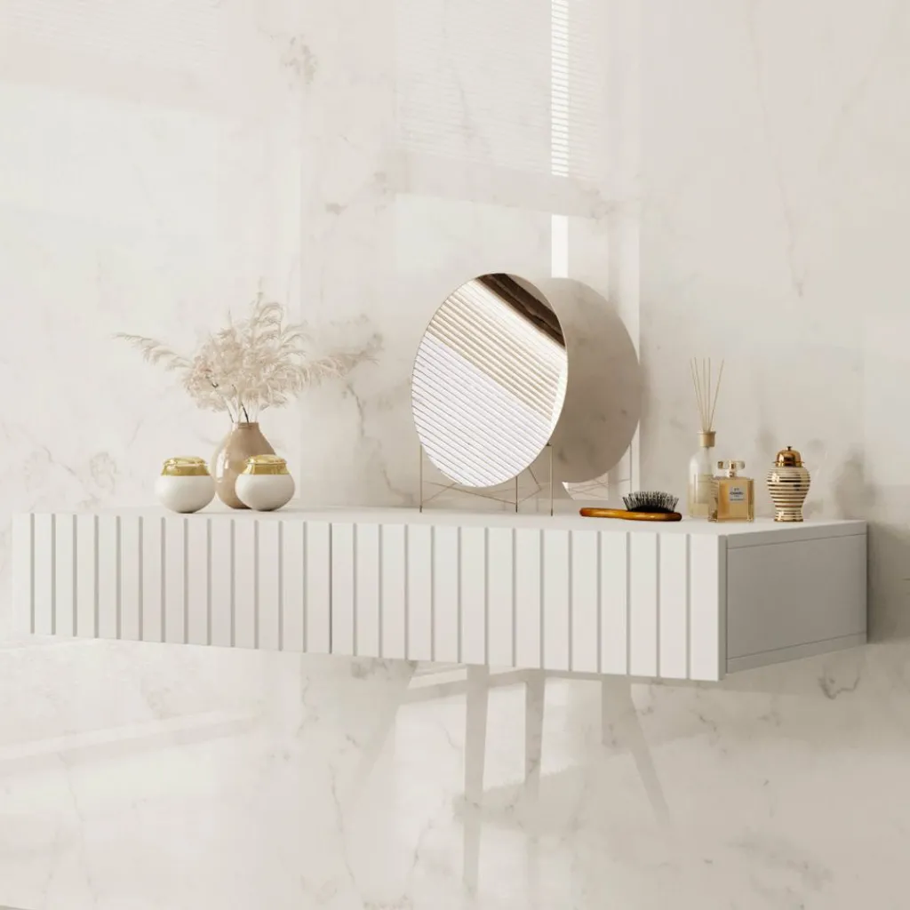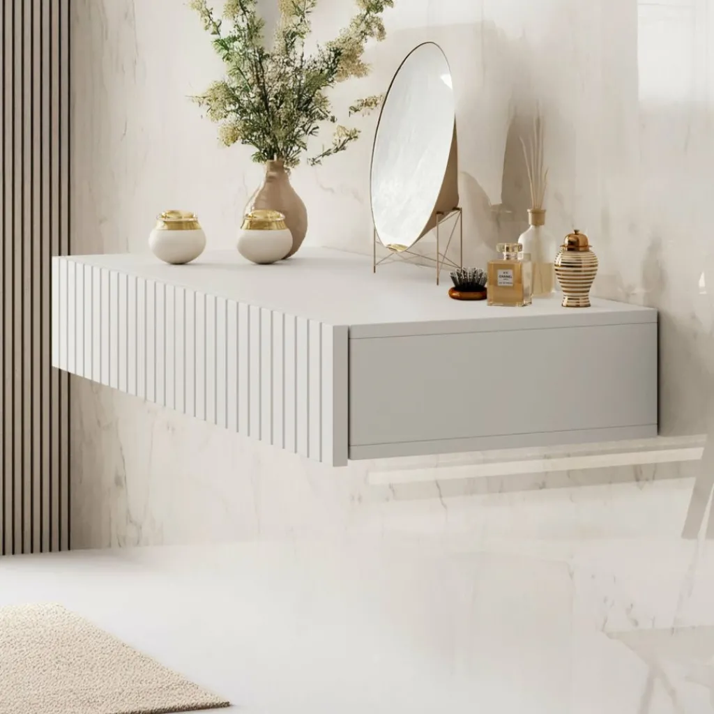 De kaptafel beschikt over 2 greeploze opberglades. Het blad is 100×41 cm en biedt daardoor genoeg plek voor alle make-up, sieraden en accessoires. Dit model is aan de muur op te hangen en bespaard hierdoor een hoop ruimte in jouw slaapkamer.