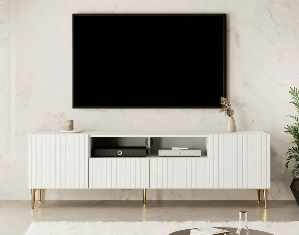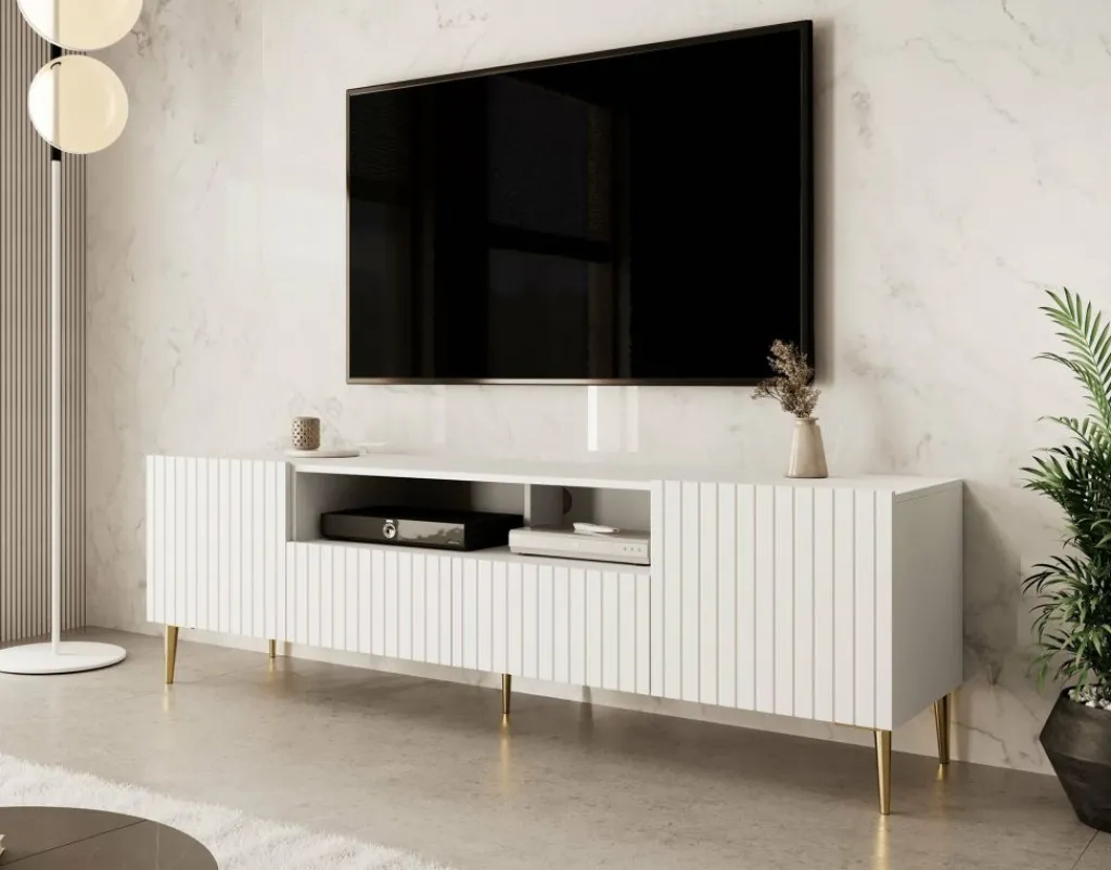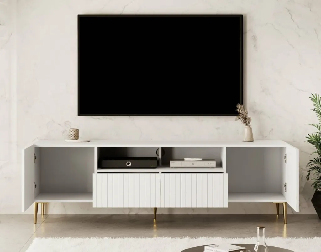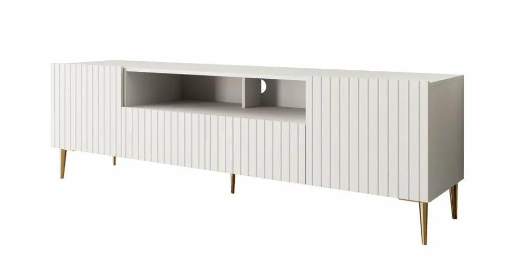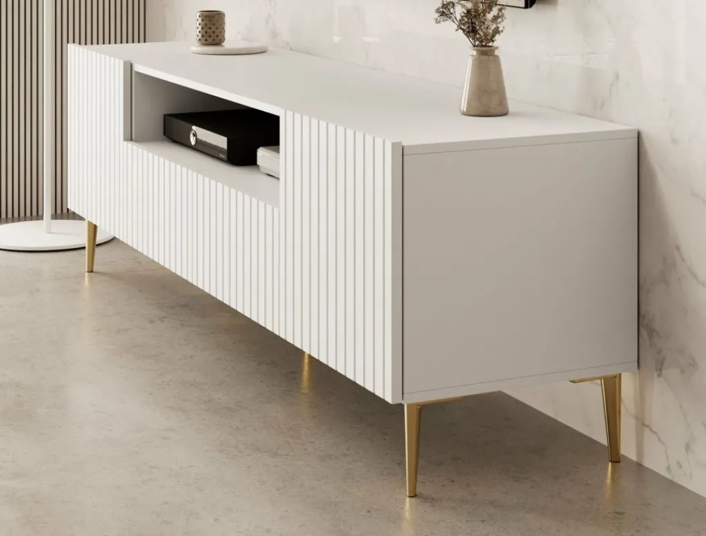 De King heeft greeploze deuren en lades waardoor het model strak oogt. Op de deurtjes en lades zit een latten patroon. Het tv-meubel staat op hoge, goudkleurige pootjes.