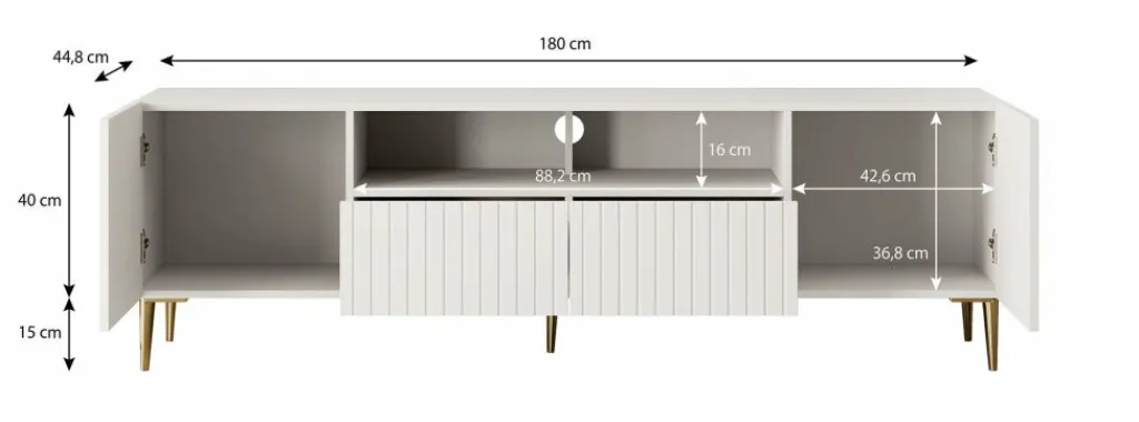 TV-Meubel King heeft 2 deuren met daarachter een opbergvak. In het midden bevinden zich 2 handige opberglades en 2 open vakken. Achter de open vakken zit een uitsparing voor bekabeling van je apparatuur.