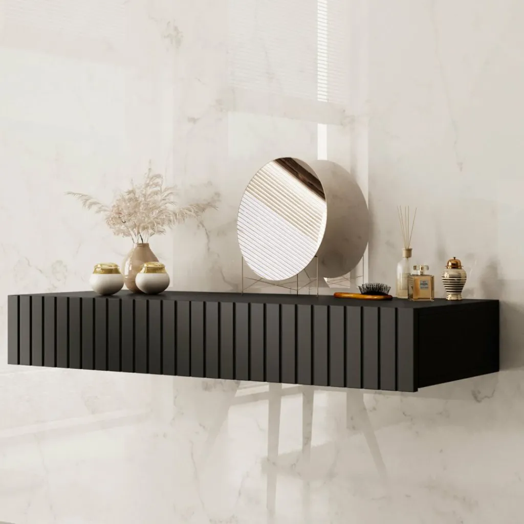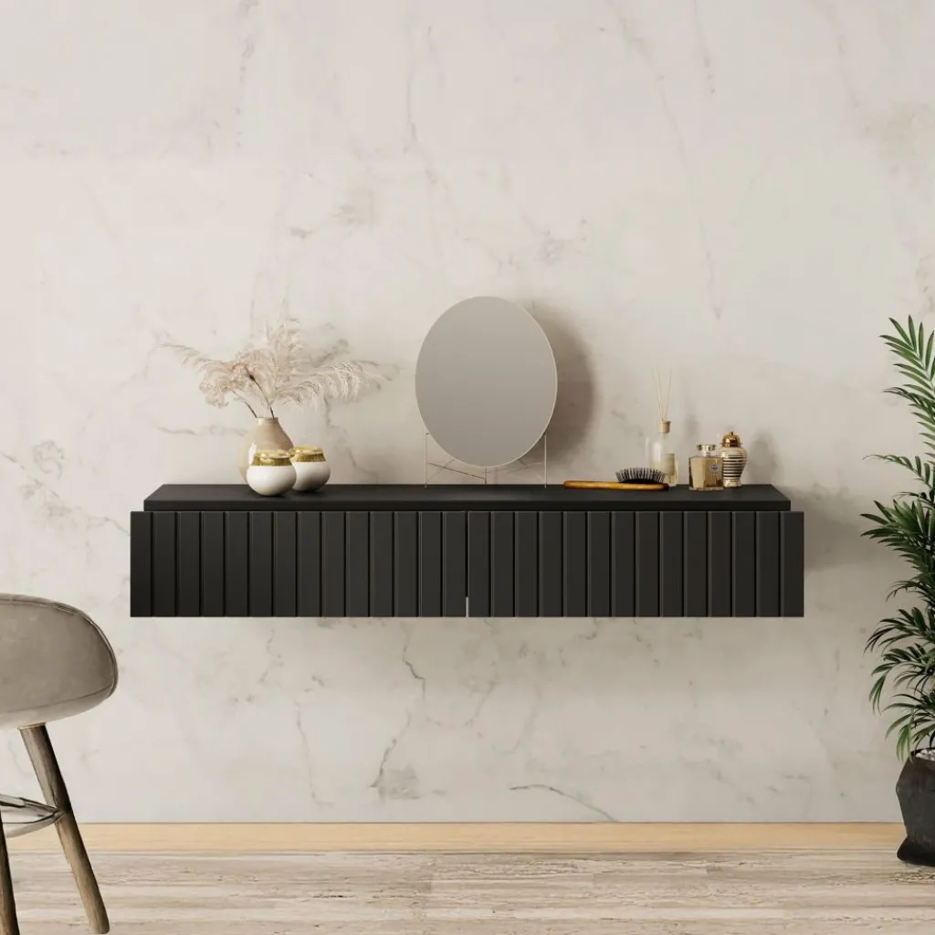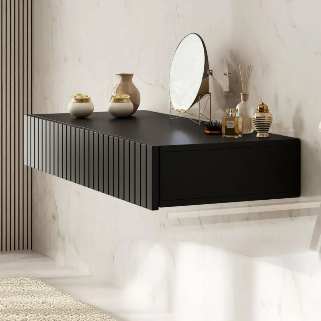De kaptafel beschikt over 2 greeploze opberglades. Het blad is 100×41 cm en biedt daardoor genoeg plek voor alle make-up, sieraden en accessoires. Dit model is aan de muur op te hangen en bespaard hierdoor een hoop ruimte in jouw slaapkamer.