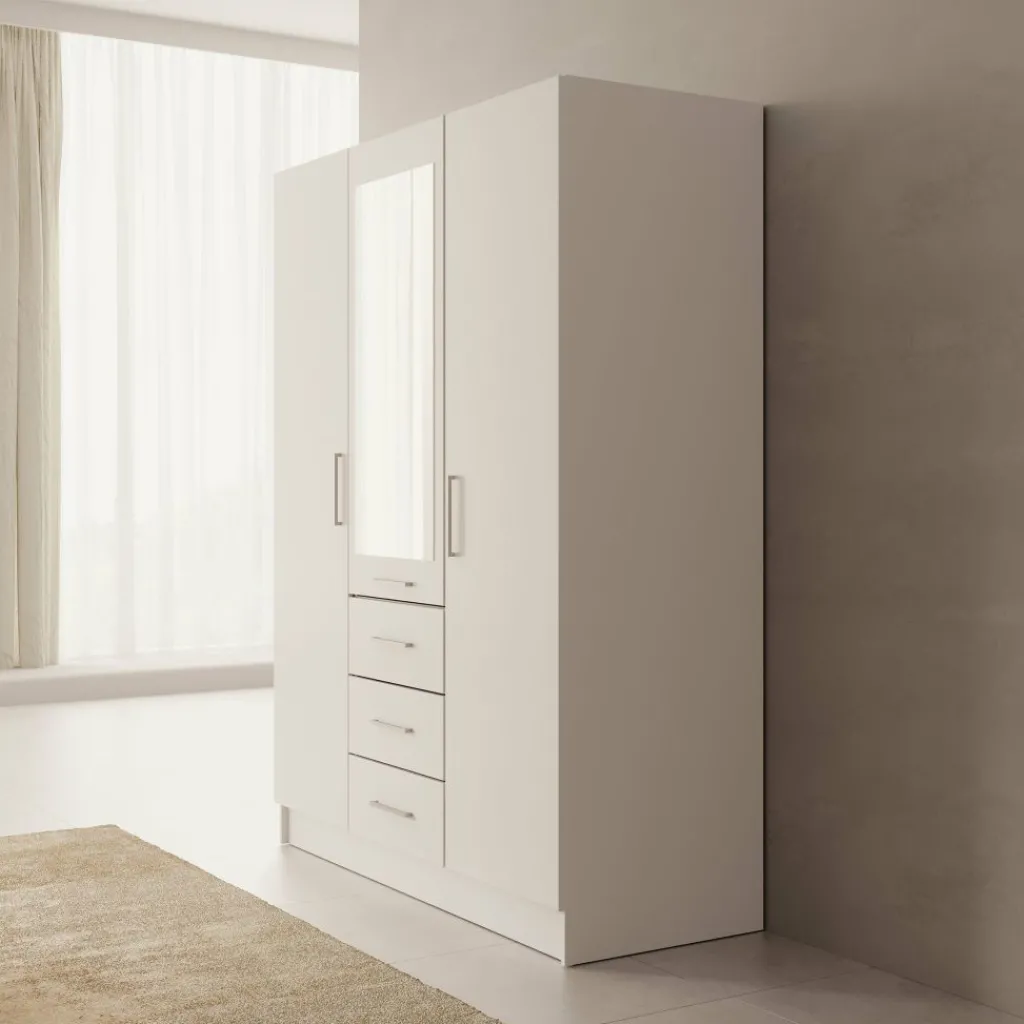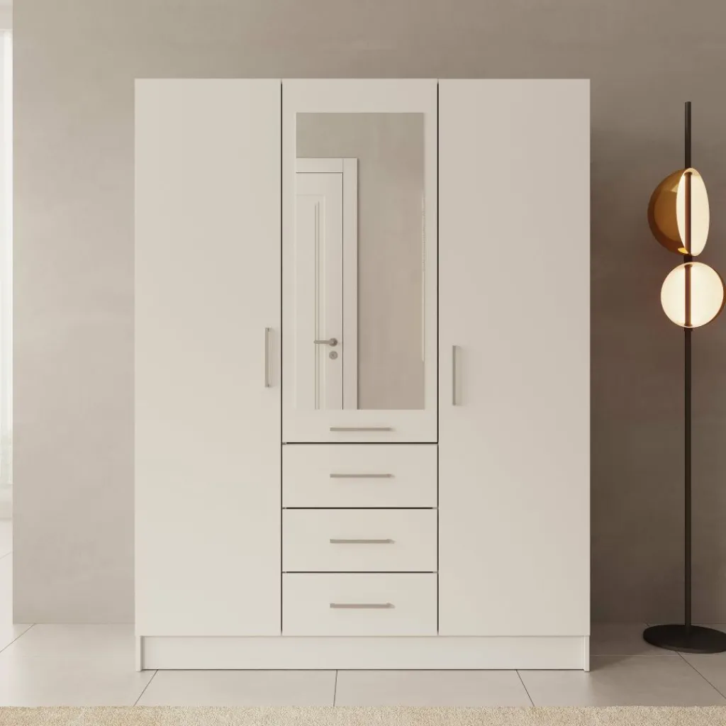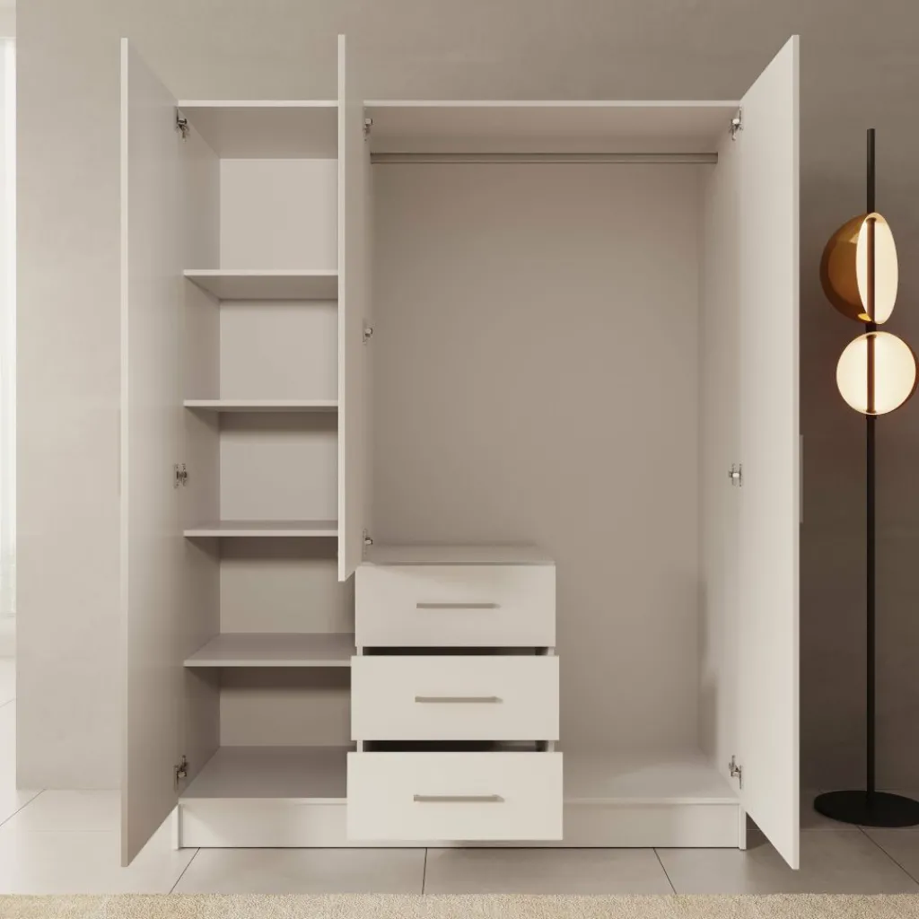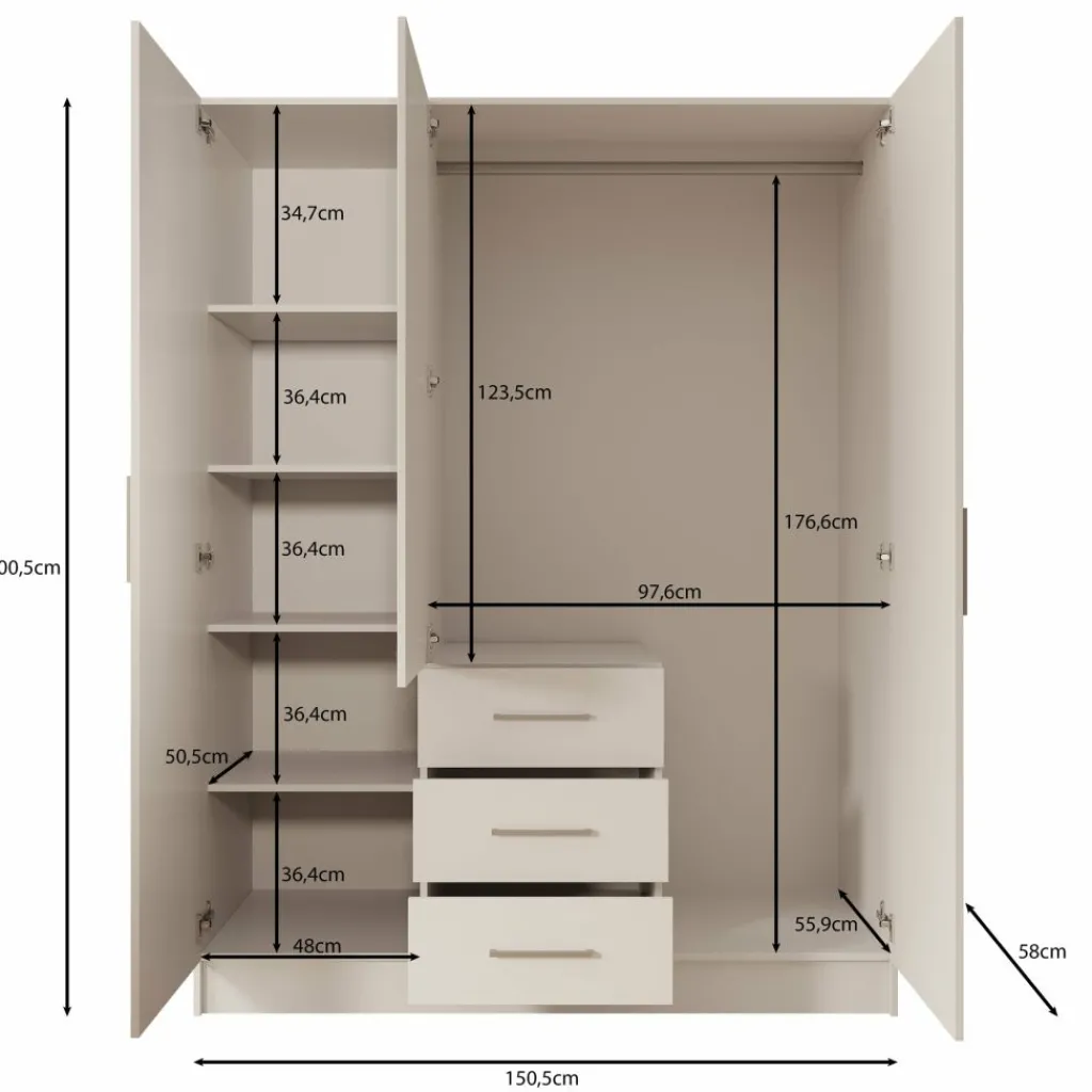 De Komodo kledingkast met 3 deuren in beige biedt veel opbergruimte en een overzichtelijke indeling. De kast heeft een breed hanggedeelte en vier lades voor gevouwen kleding of accessoires. Dankzij de afmetingen van 151x61x201 cm is dit een praktisch meubel voor de slaapkamer. De metalen handgrepen zorgen voor een strak en functioneel ontwerp.