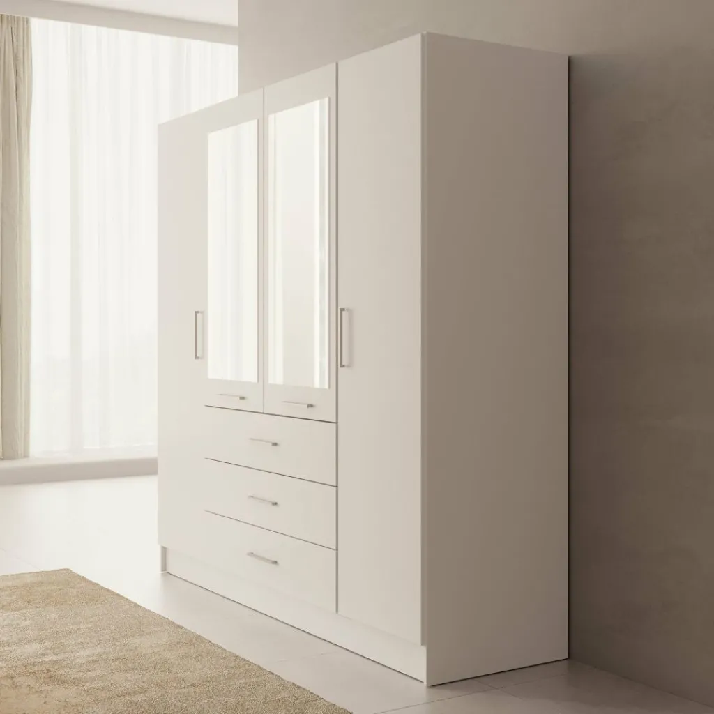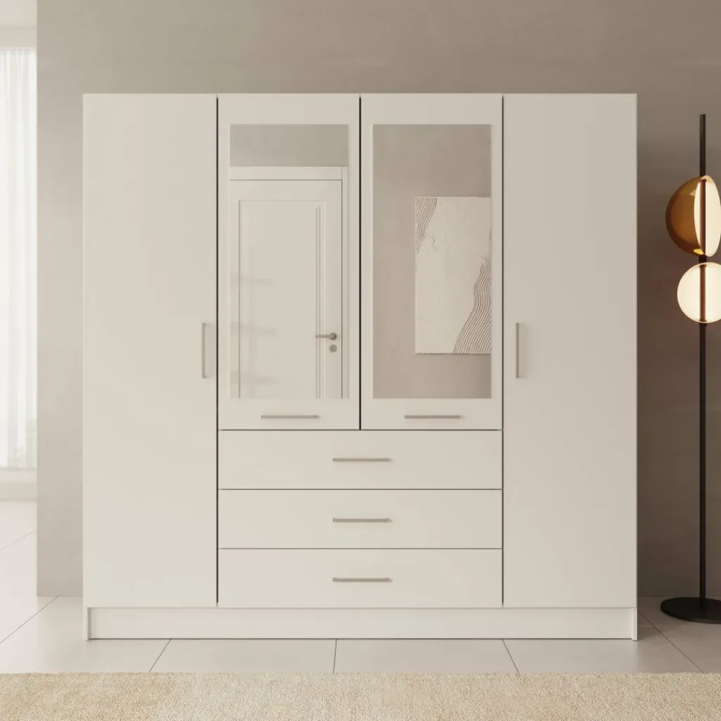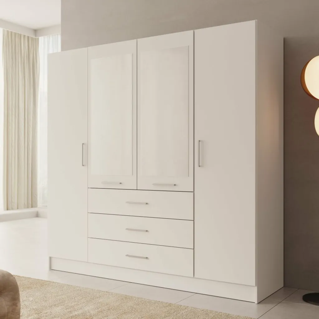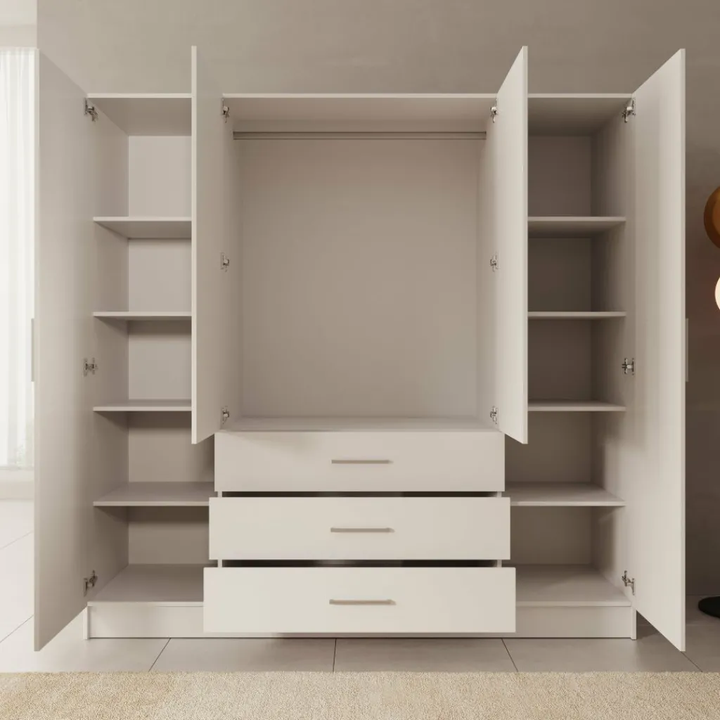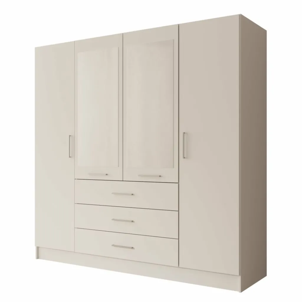 De Komodo kledingkast met 4 deuren in beige biedt ruime opbergmogelijkheden voor kleding en accessoires. De kast heeft twee brede hanggedeeltes en vier lades voor gevouwen kleding. Met een afmeting van 200x61x201 cm is dit een praktische en overzichtelijke kast voor grotere slaapkamers. De metalen handgrepen zorgen voor een eenvoudig en strak uiterlijk.