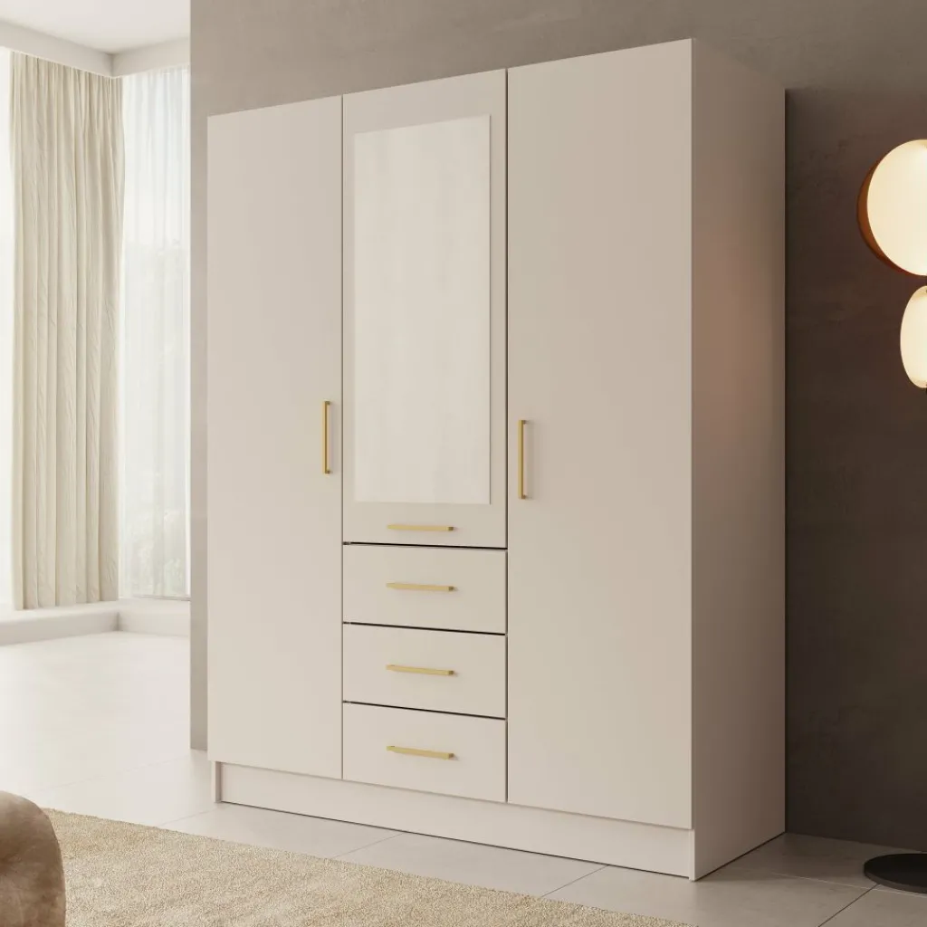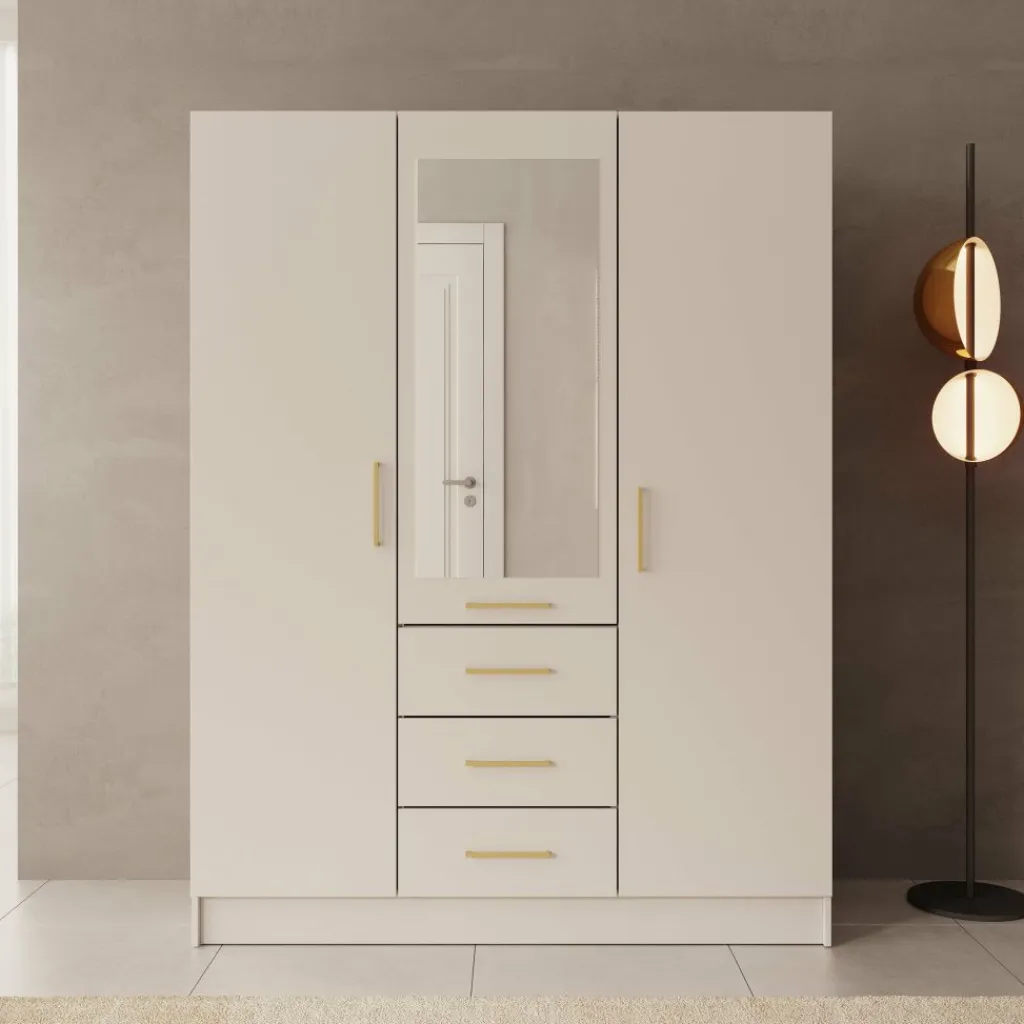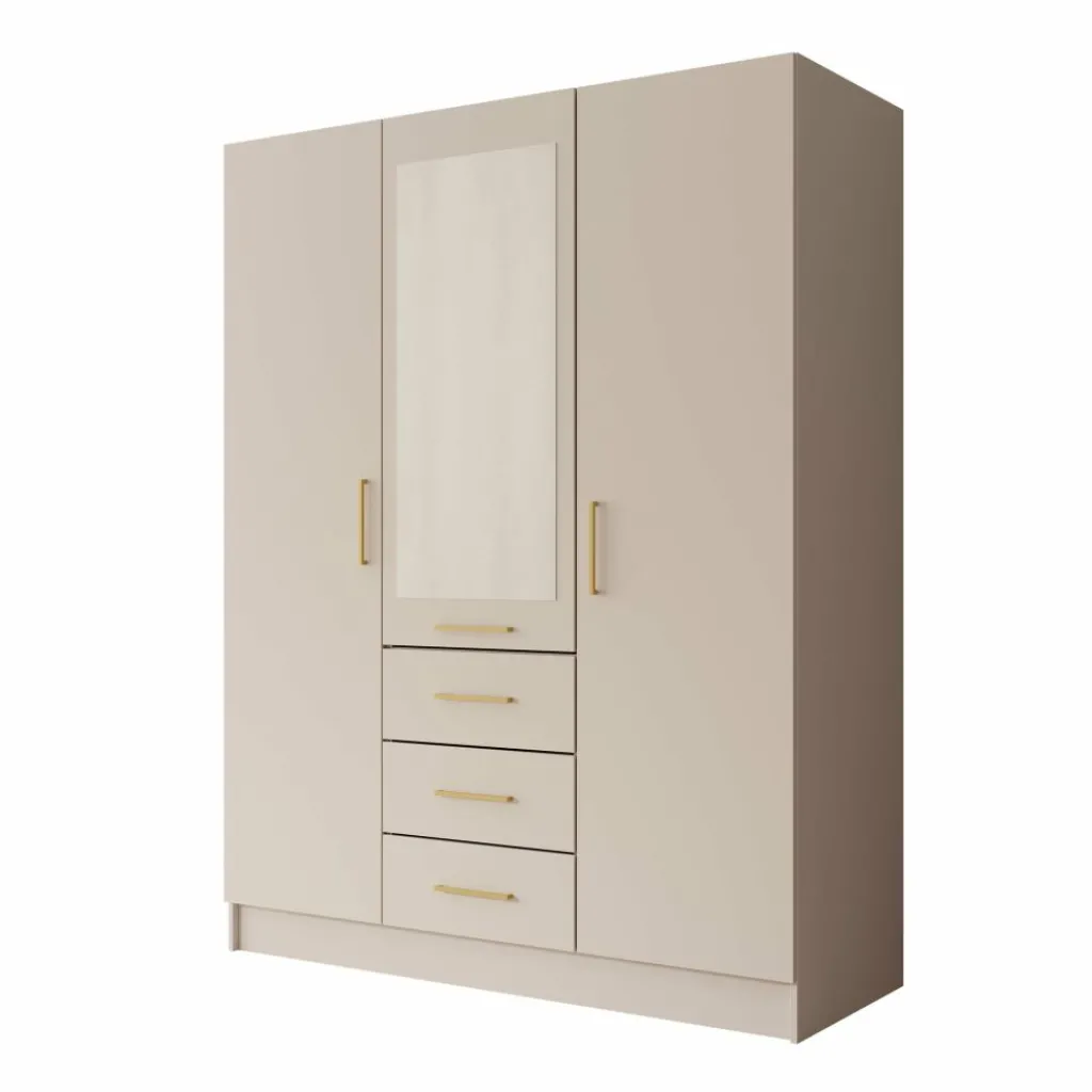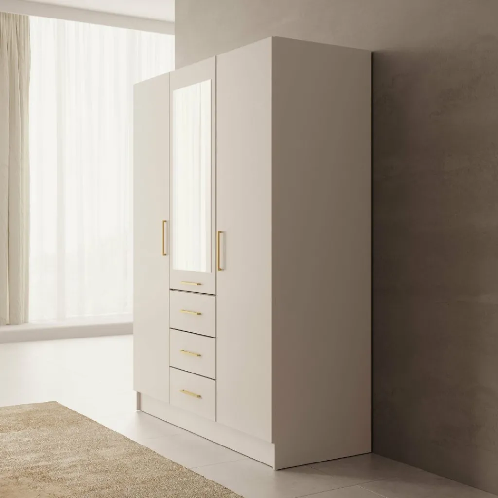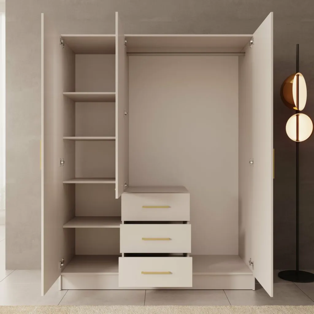 De Komodo kledingkast met 3 deuren in wit biedt veel opbergruimte en een overzichtelijke indeling. De kast heeft een breed hanggedeelte en vier lades voor gevouwen kleding of accessoires. Dankzij de afmetingen van 151x61x201 cm is dit een praktisch meubel voor de slaapkamer. De metalen handgrepen zorgen voor een strak en functioneel ontwerp.