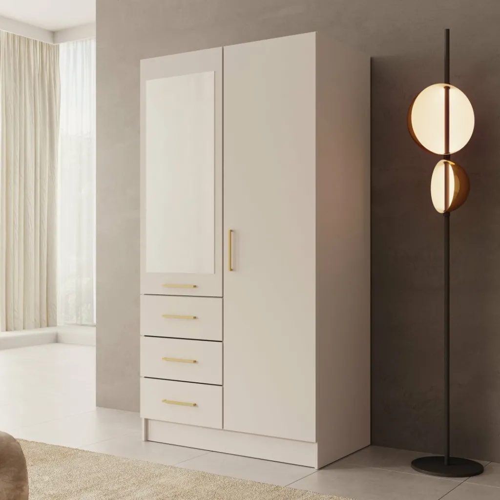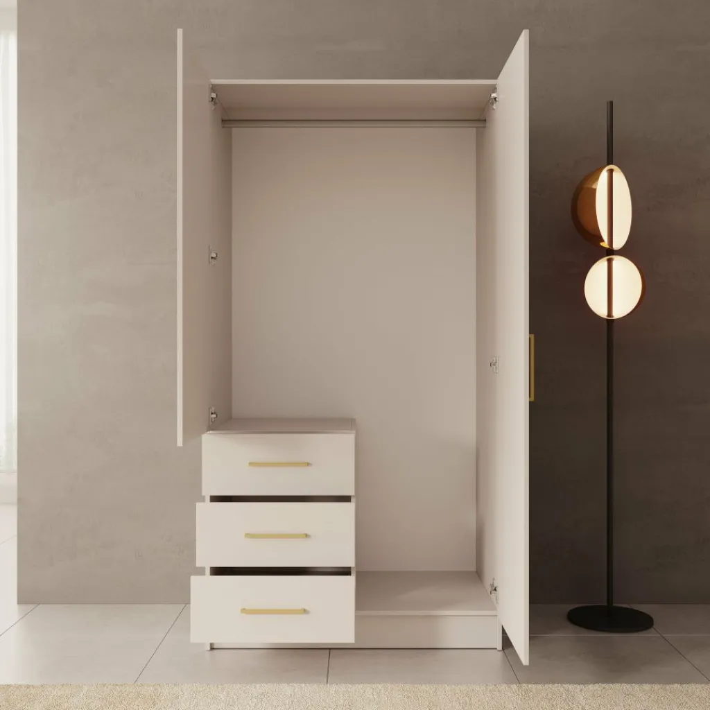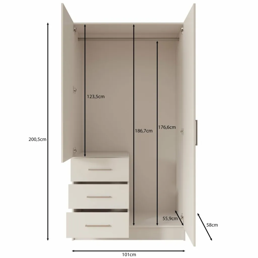 De Komodo kledingkast met 2 deuren in wit heeft een praktische indeling met een hanggedeelte en vier lades. De kast biedt voldoende ruimte voor kleding en accessoires. Met een afmeting van 101x61x201 cm past dit model goed in slaapkamers of bergruimtes. De handgrepen zorgen voor eenvoudig gebruik en de kast heeft een neutrale uitstraling.