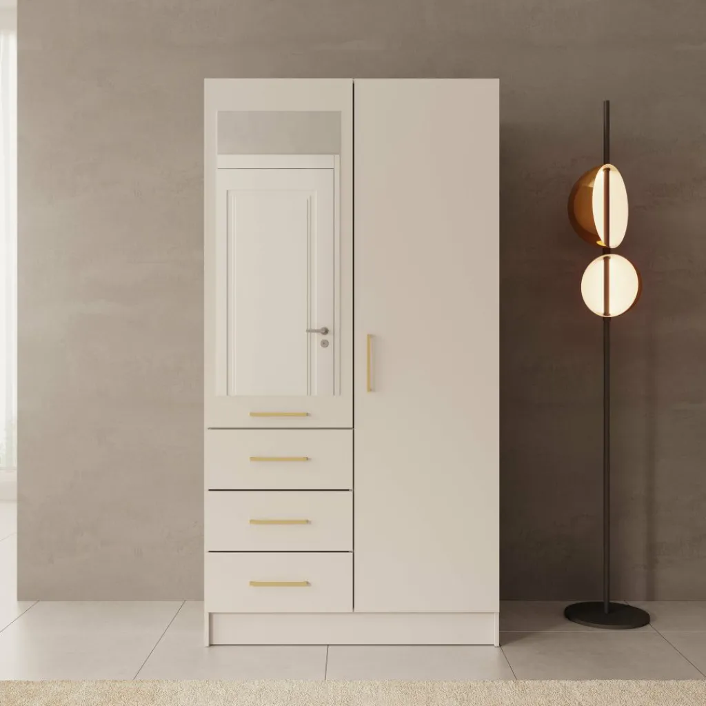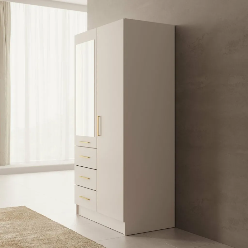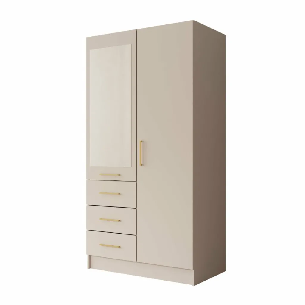De Komodo kledingkast met 2 deuren in wit heeft een praktische indeling met een hanggedeelte en vier lades. De kast biedt voldoende ruimte voor kleding en accessoires. Met een afmeting van 101x61x201 cm past dit model goed in slaapkamers of bergruimtes. De handgrepen zorgen voor eenvoudig gebruik en de kast heeft een neutrale uitstraling.