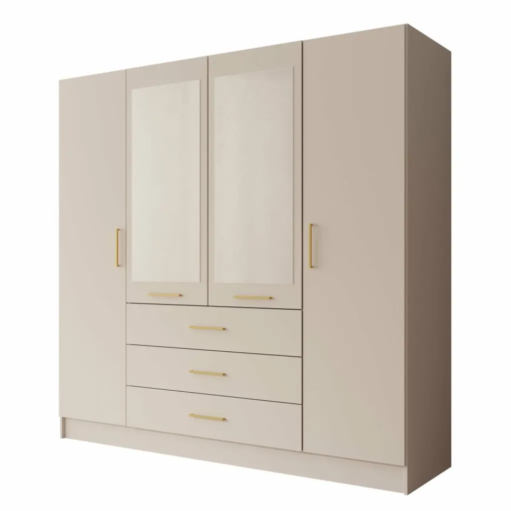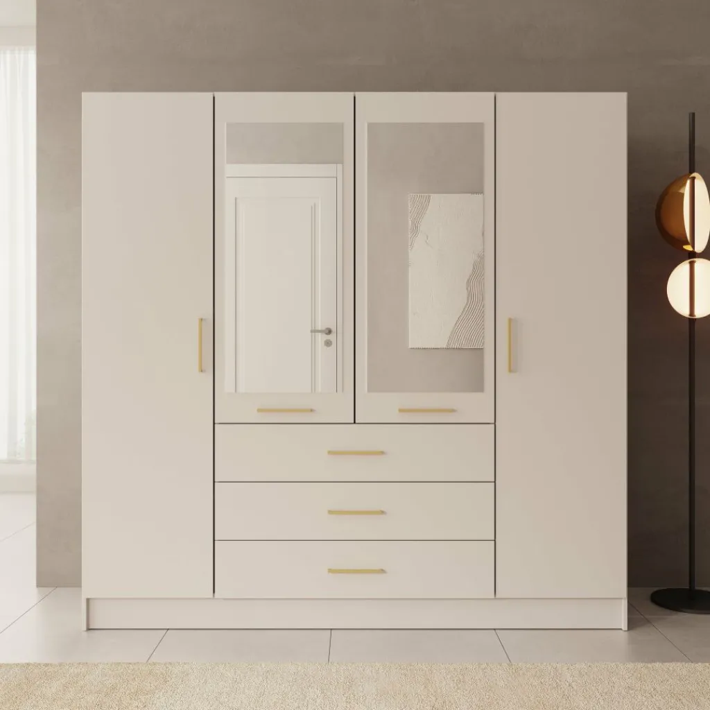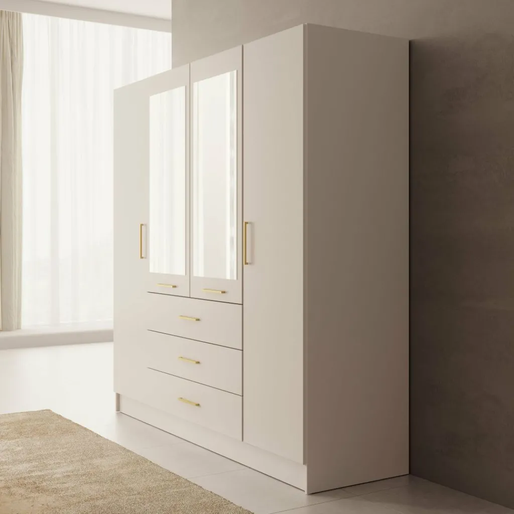 De Komodo kledingkast met 4 deuren in wit biedt ruime opbergmogelijkheden voor kleding en accessoires. De kast heeft twee brede hanggedeeltes en vier lades voor gevouwen kleding. Met een afmeting van 200x61x201 cm is dit een praktische en overzichtelijke kast voor grotere slaapkamers. De metalen handgrepen zorgen voor een eenvoudig en strak uiterlijk.