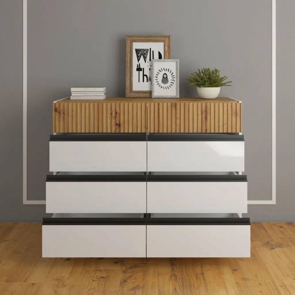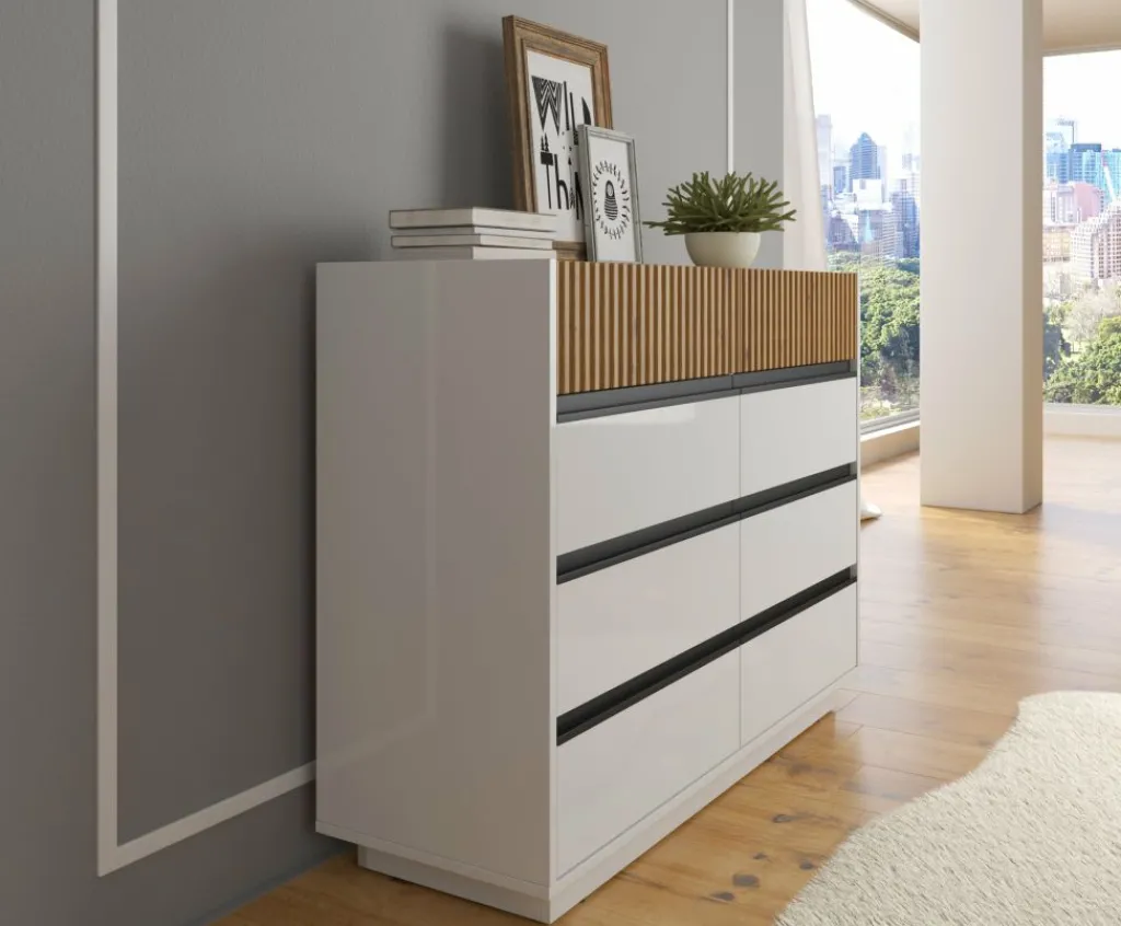 Ladekast Madeline is een opbergkast in een moderne stijl en beschikt over 8 greeploze lades. De bovenste 2 lades hebben op de voorkant een latten patroon. Het meubel is uitgevoerd in de kleuren wit met eiken. De voorkant van de onderste 6 lades zijn afgewerkt in een hoogglans witte kleur.