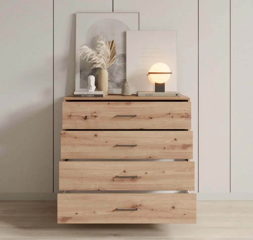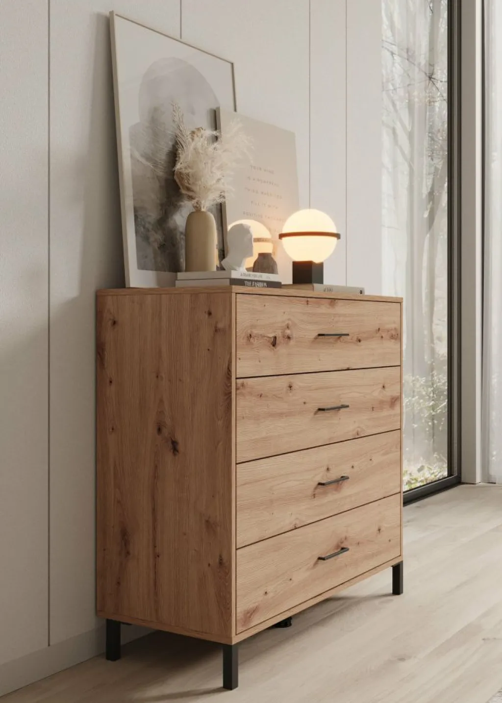 Ladekast Vidor is een opbergkast in een moderne stijl. De kast beschikt over 4 lades die openen met zwarte handgrepen. Het meubel is uitgevoerd in de kleur eiken met zwarte poten.
