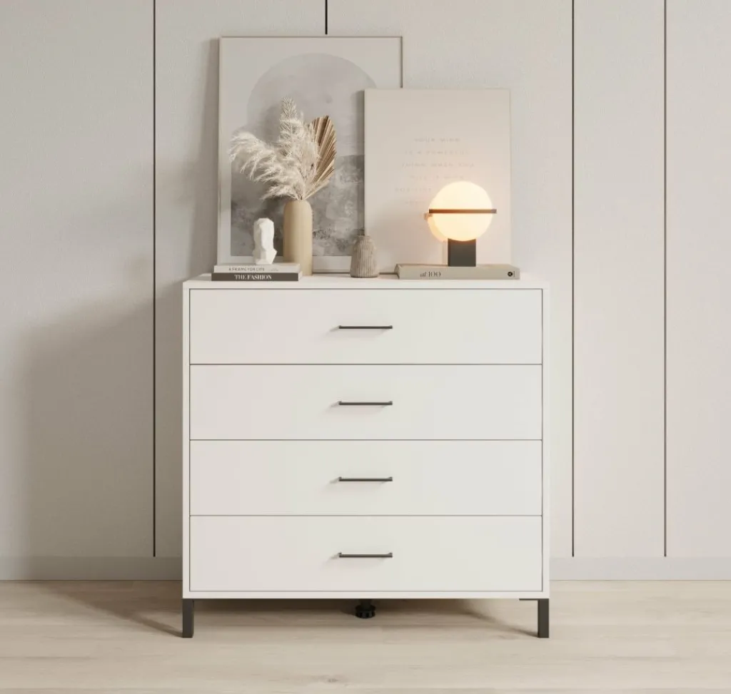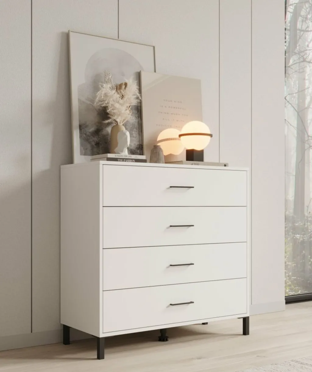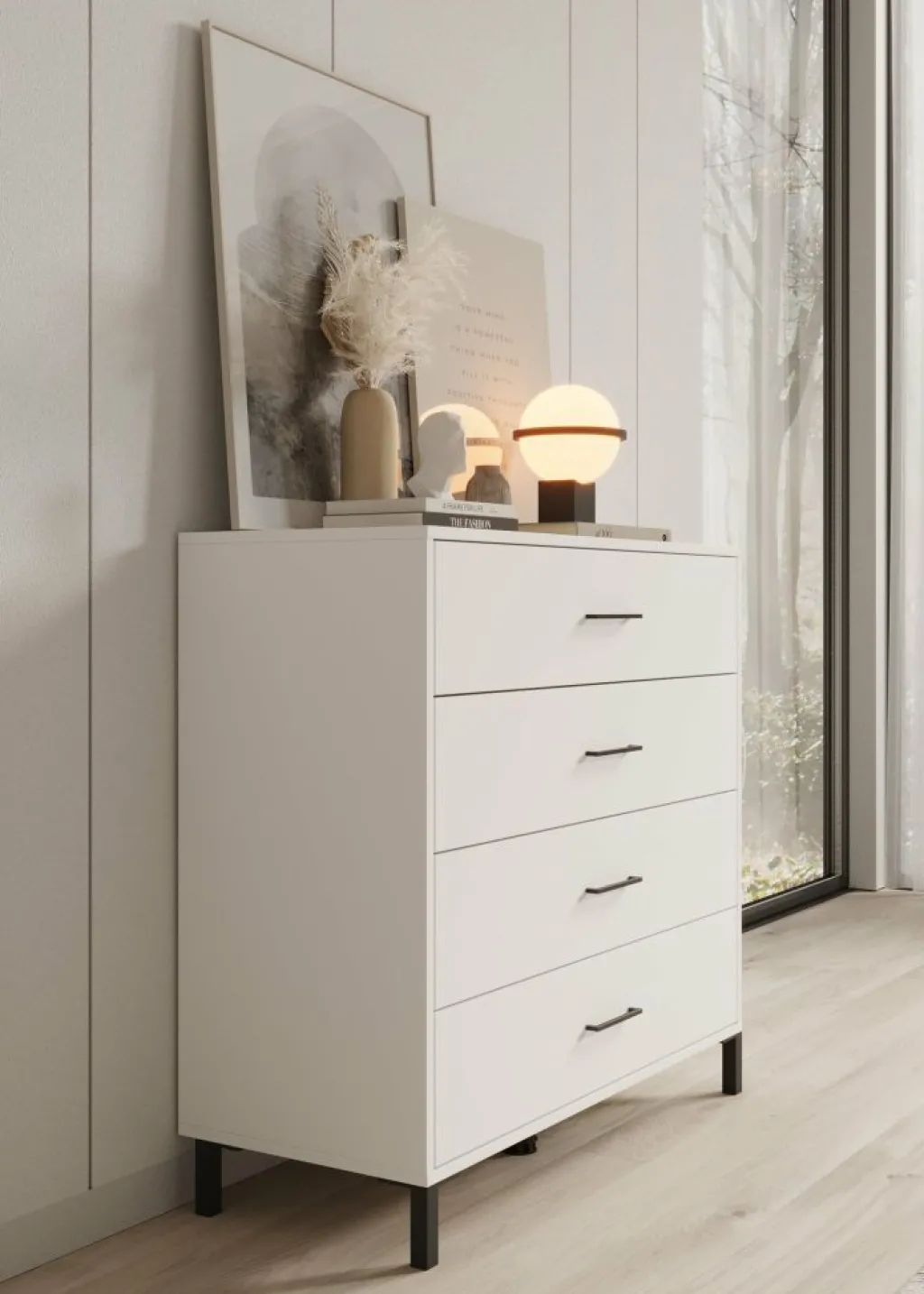 Ladekast Vidor is een opbergkast in een moderne stijl. De kast beschikt over 4 lades die openen met zwarte handgrepen. Het meubel is uitgevoerd in de kleur wit met zwarte poten.