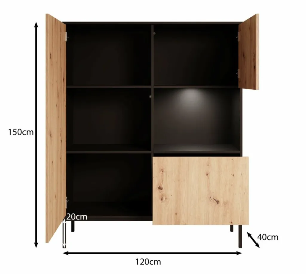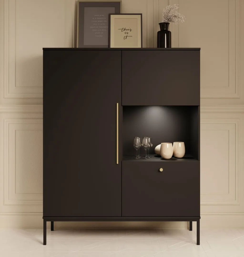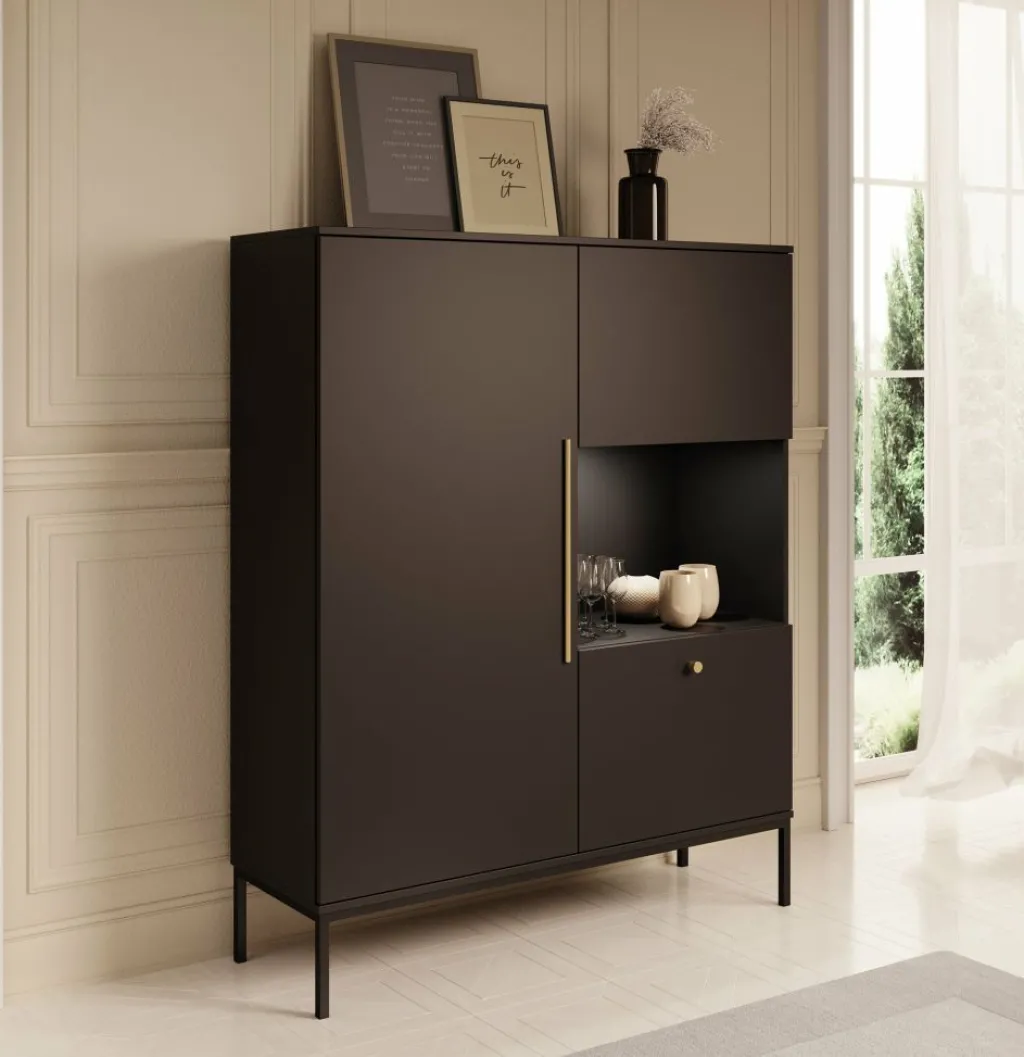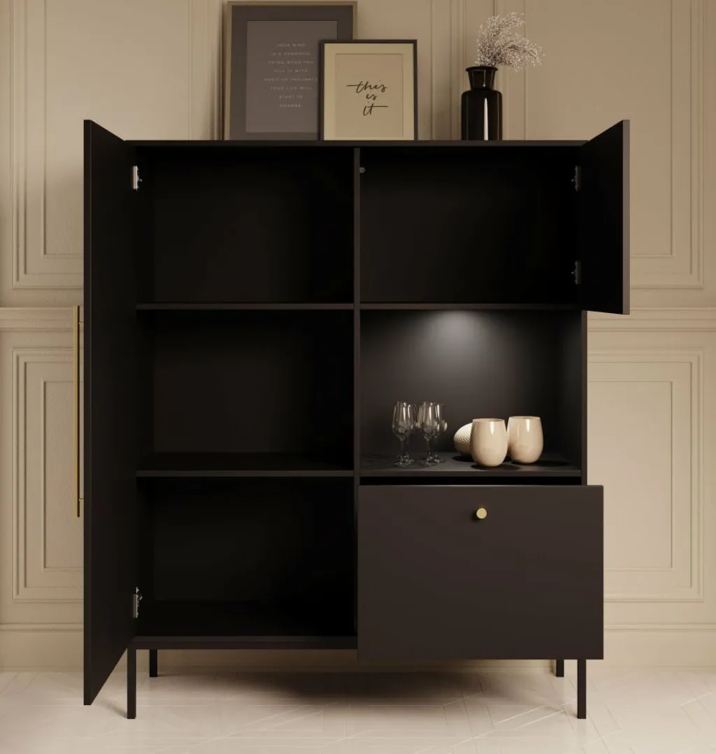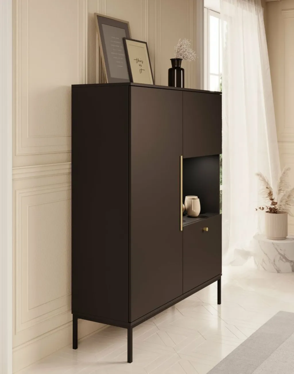 Vitrinekast Lagos beschikt over 2 deuren, 1 lade en 1 open vak. De linkerdeur opent met een grote handgreep, de lade met een knop. Beide in de kleur goud. De rechterdeur opent met het push to open systeem. Achter de deuren zitten nog 4 extra opbergvakken. Het meubel is volledig uitgevoerd in zwart. De opbergkast staat op metalen poten.