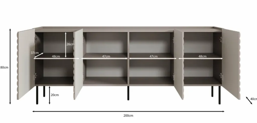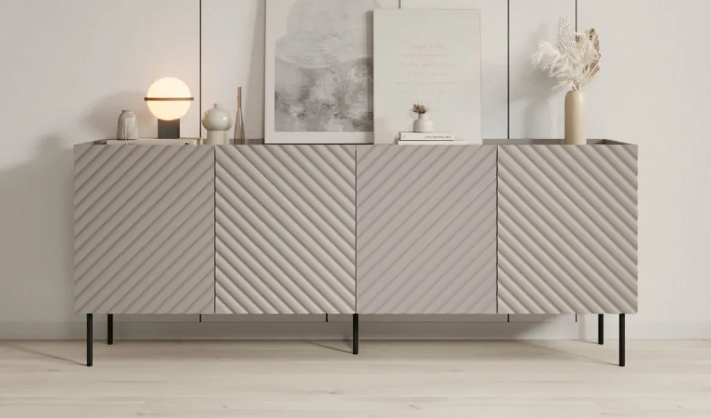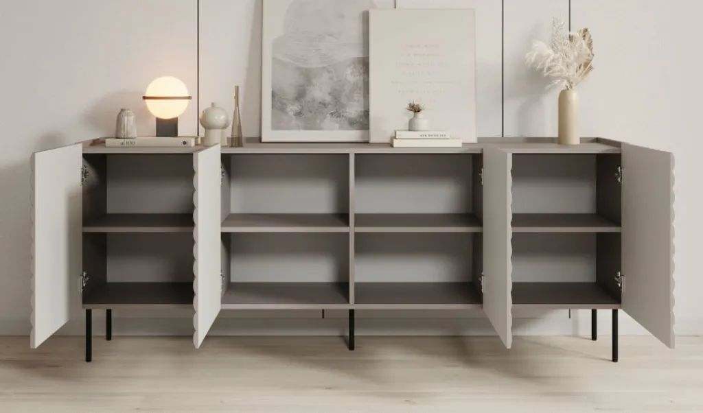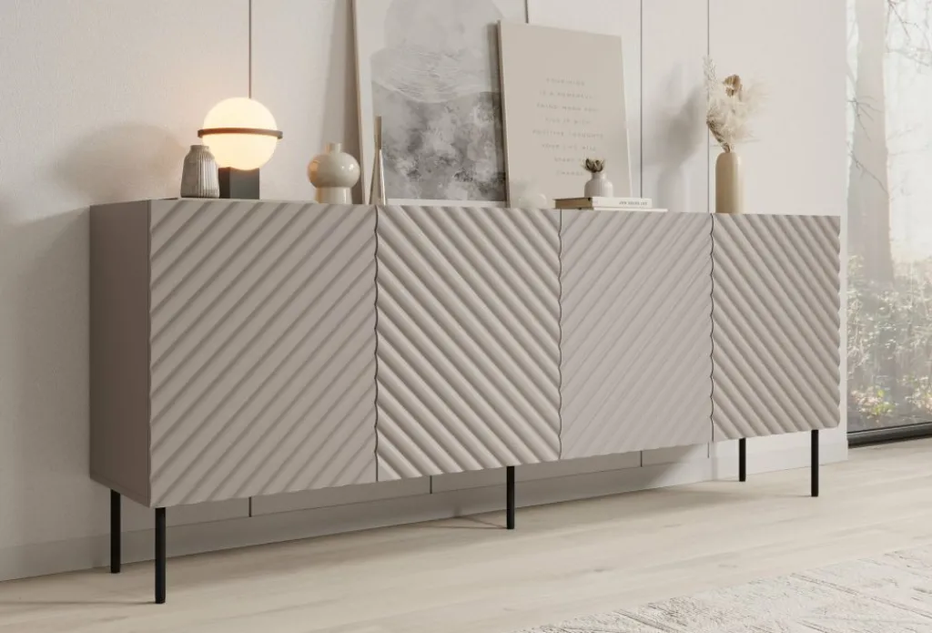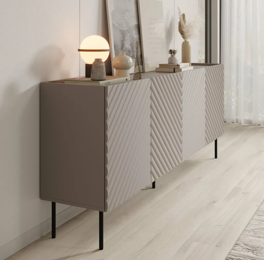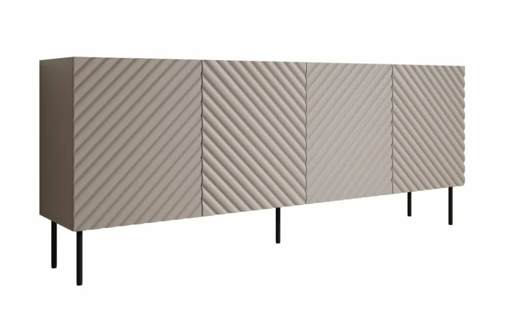 Dressoir Laguna is een opbergkast in een modern, hotel chique stijl. De kast beschikt over 4 deuren waarachter 8 opbergvakken zitten. De voorkant van deze deuren hebben een sierlijk patroon. De Laguna staat op metalen pootjes in de kleur zwart. Verder is het meubel volledig uitgevoerd in beige.