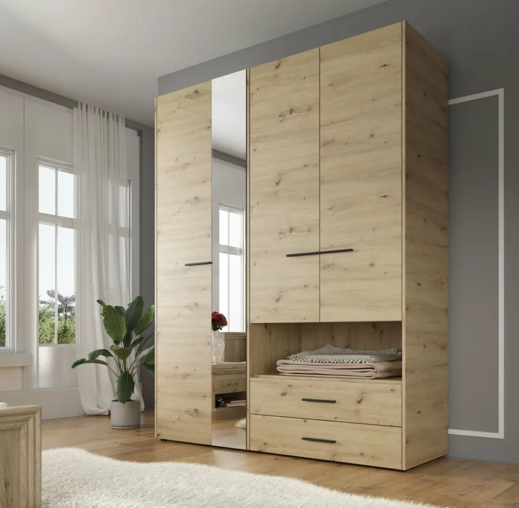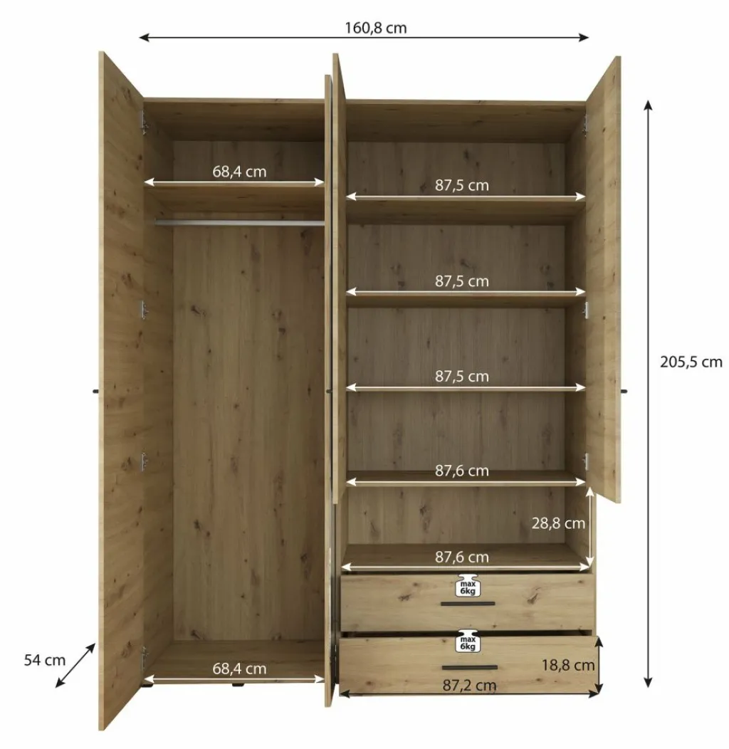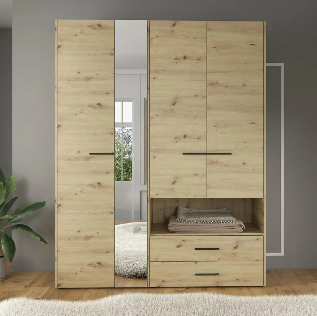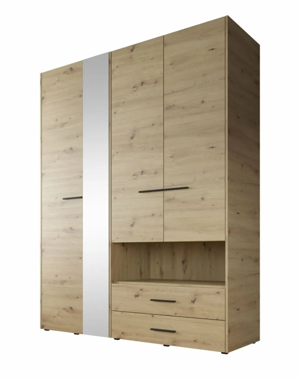 Kledingkast Laura is een garderobekast met ruime opbergmogelijkheden. Dit model is voorzien van 4 deuren, 2 brede lades en een open schap. Eén deur is volledig voorzien van een handige spiegel. Het binnenwerk bestaat uit legplanken en een ruimte met stang om kleding aan op te hangen. Dit model is afgewerkt in eiken kleur met zwarte details.