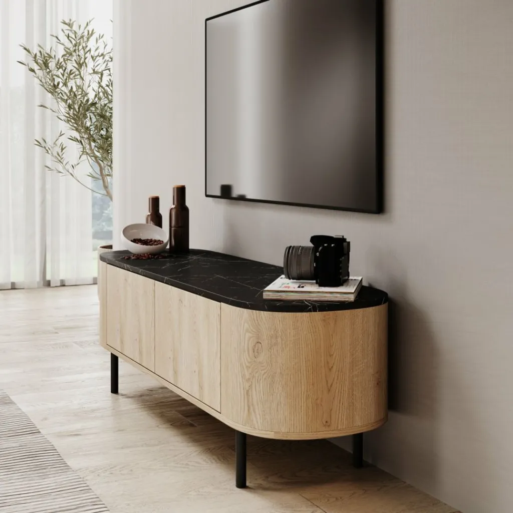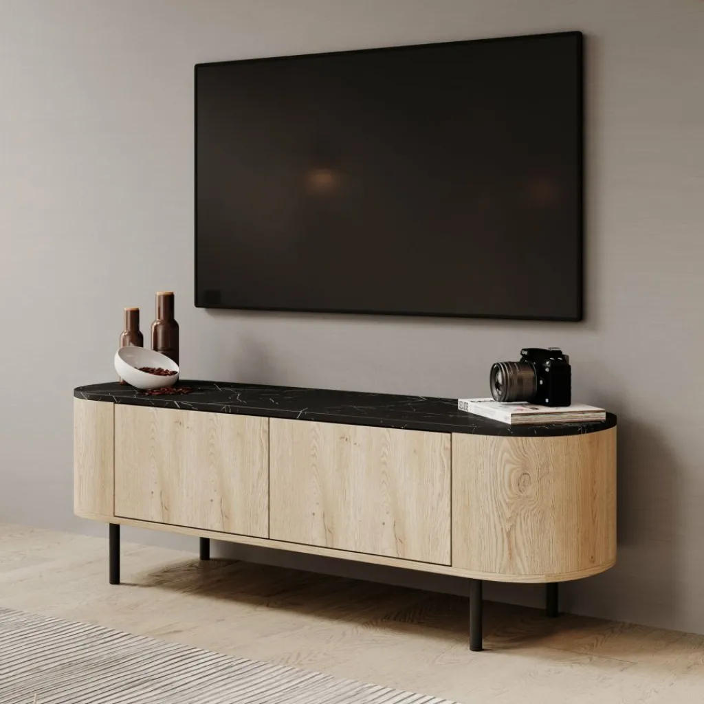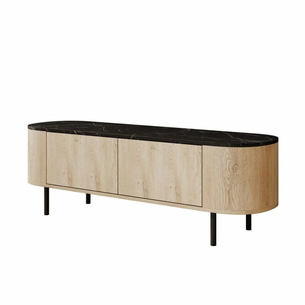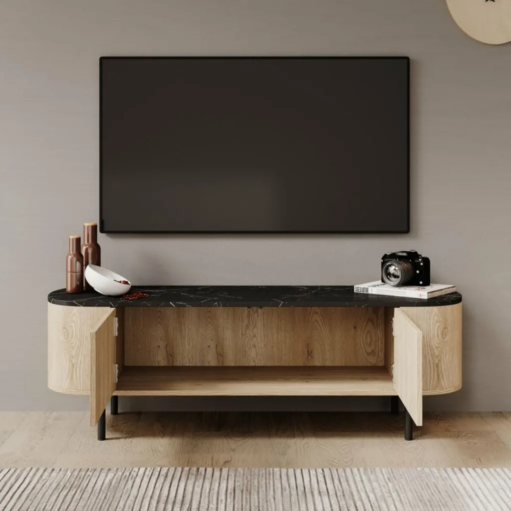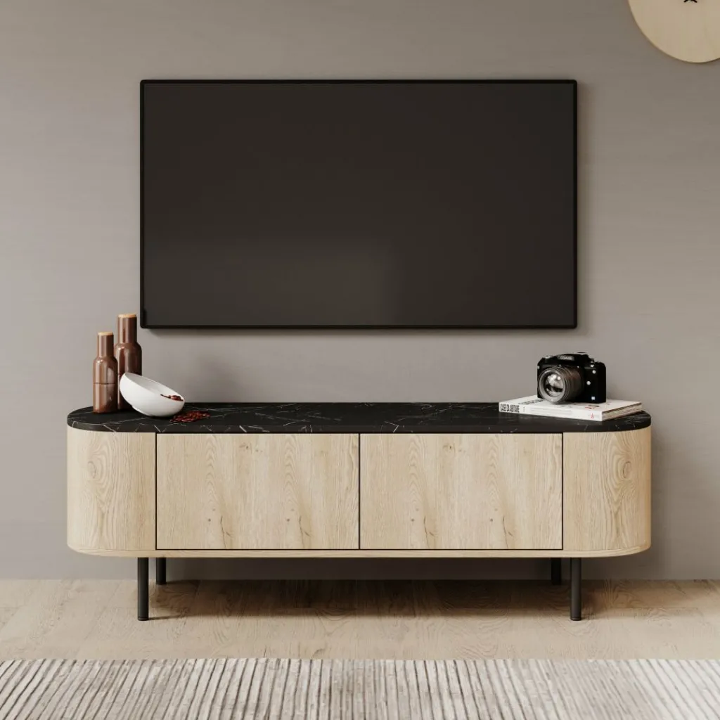 Het Lauran tv-meubel van Meubella is uitgevoerd met een eiken patroon en een zwart marmerlook bovenblad en heeft een afmeting van 140 × 40 × 45 centimeter. Het meubel is voorzien van afgeronde zijkanten en staat op metalen poten. De deuren zijn vlak afgewerkt zonder zichtbare handgrepen, wat zorgt voor een rustige en strakke voorzijde.