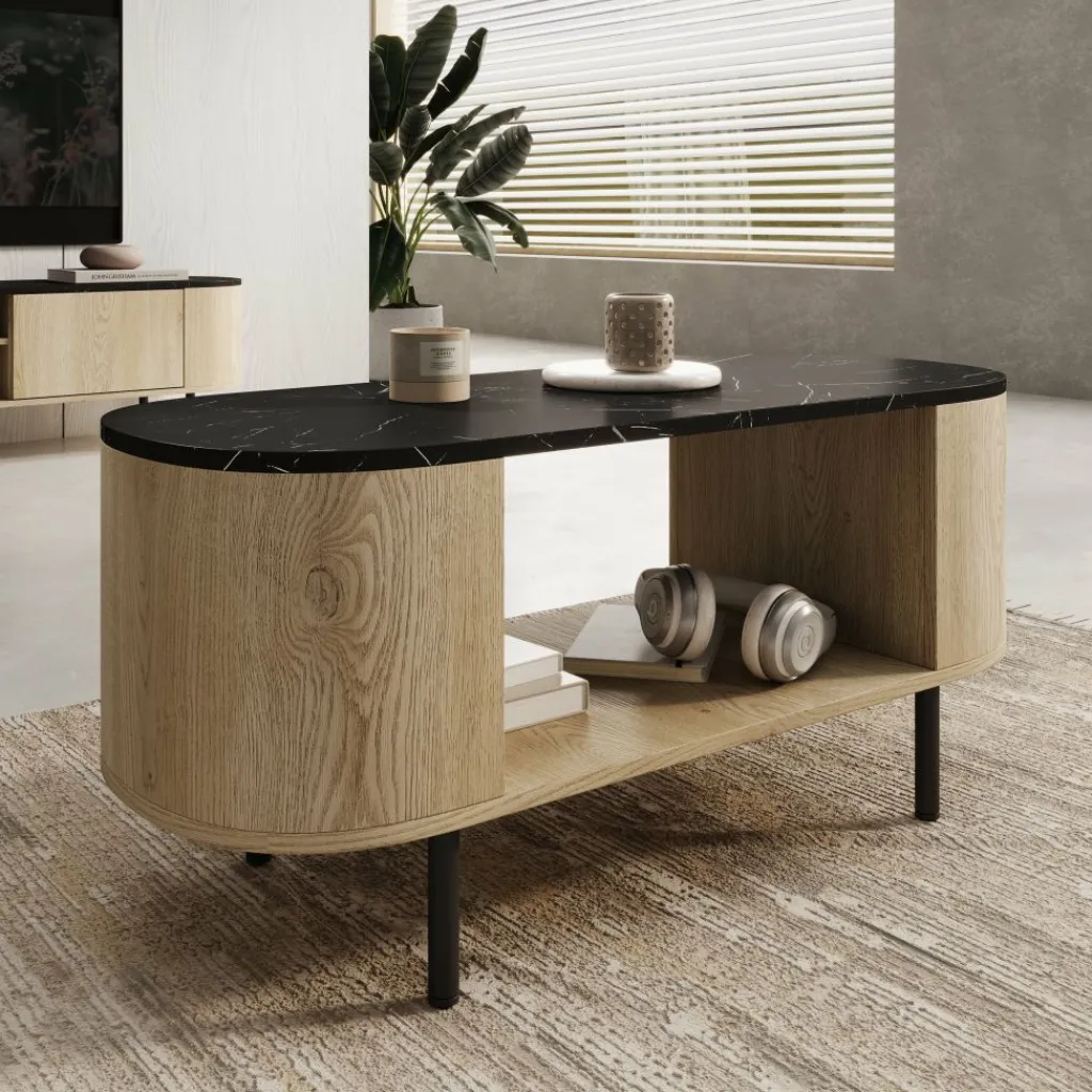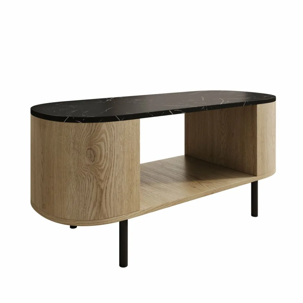 De Lauran salontafel van Meubella is uitgevoerd in eikenlook met een zwart marmerlook tafelblad en heeft een afmeting van 100 x 51 x 45 centimeter. De tafel heeft afgeronde hoeken en een open opbergvak onder het blad. Het tafelblad heeft een zwart marmerlook afwerking en het onderstel bestaat uit metalen poten.