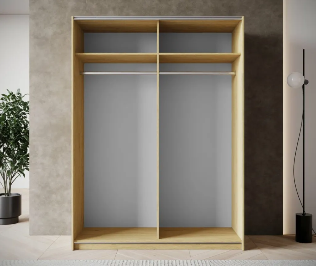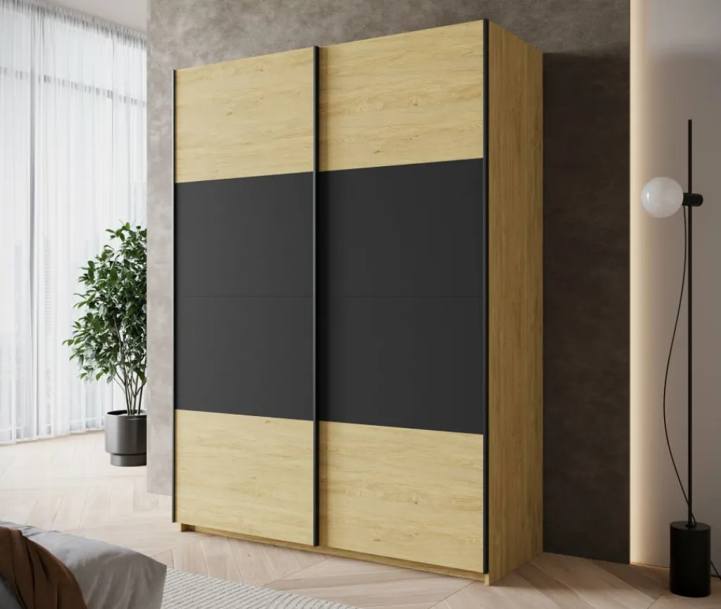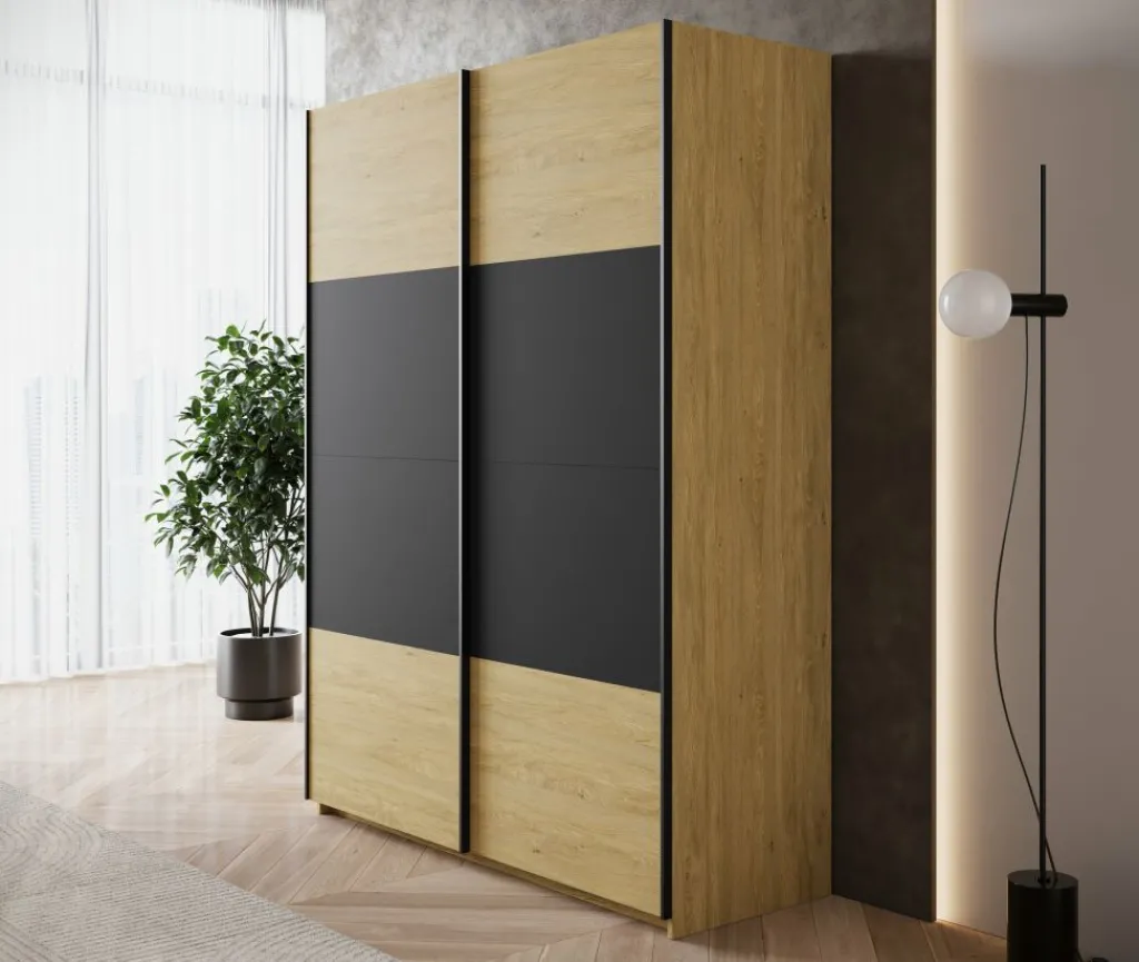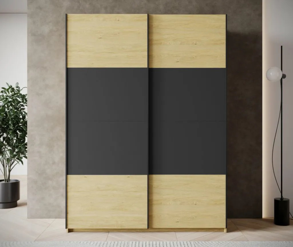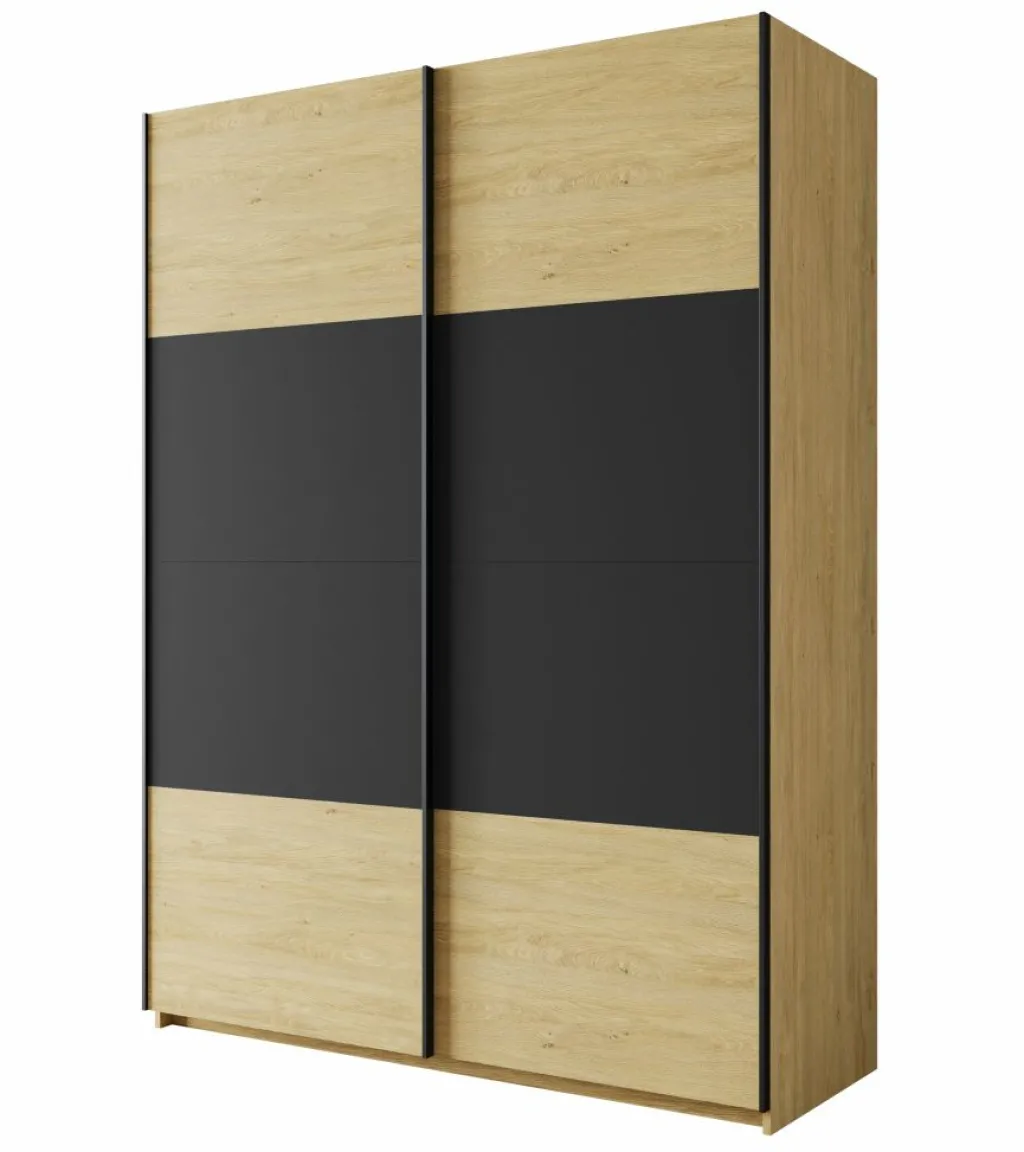 De kledingkast Lawson (150 cm breed) biedt een praktische opbergoplossing met een moderne uitstraling. De kast is uitgevoerd in eikenhout-look met strakke zwarte accenten en is voorzien van twee schuifdeuren. Achter elke deur bevindt zich een vak met een legplank bovenin en een roede over de volle hoogte.