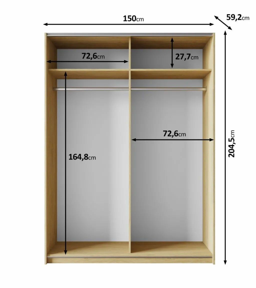 De totale afmetingen van de kast zijn 204,5 × 150 × 59,2 cm (h×b×d). De binnenindeling bestaat uit twee compartimenten van elk 72,6 cm breed. De hoogte van de hangruimte bedraagt 164,8 cm, de legplanken zijn elk 27,7 cm hoog.