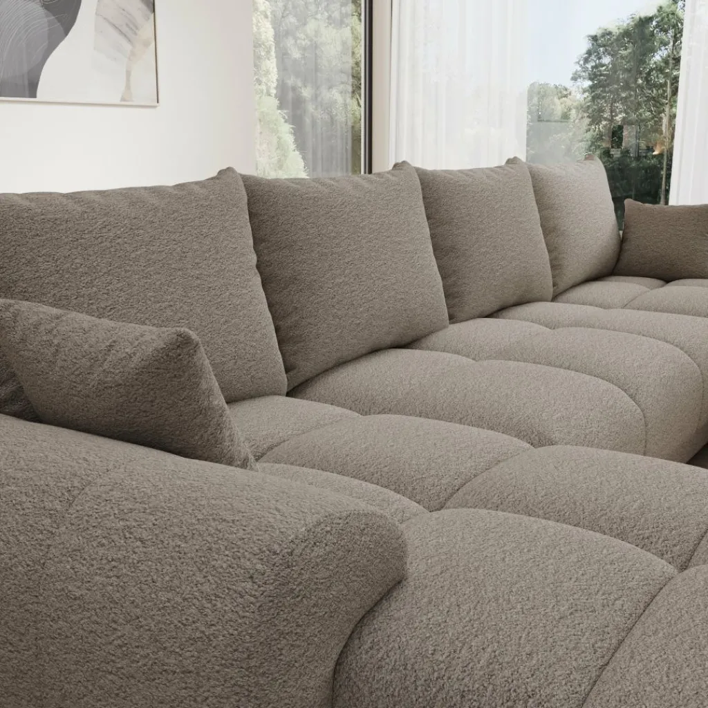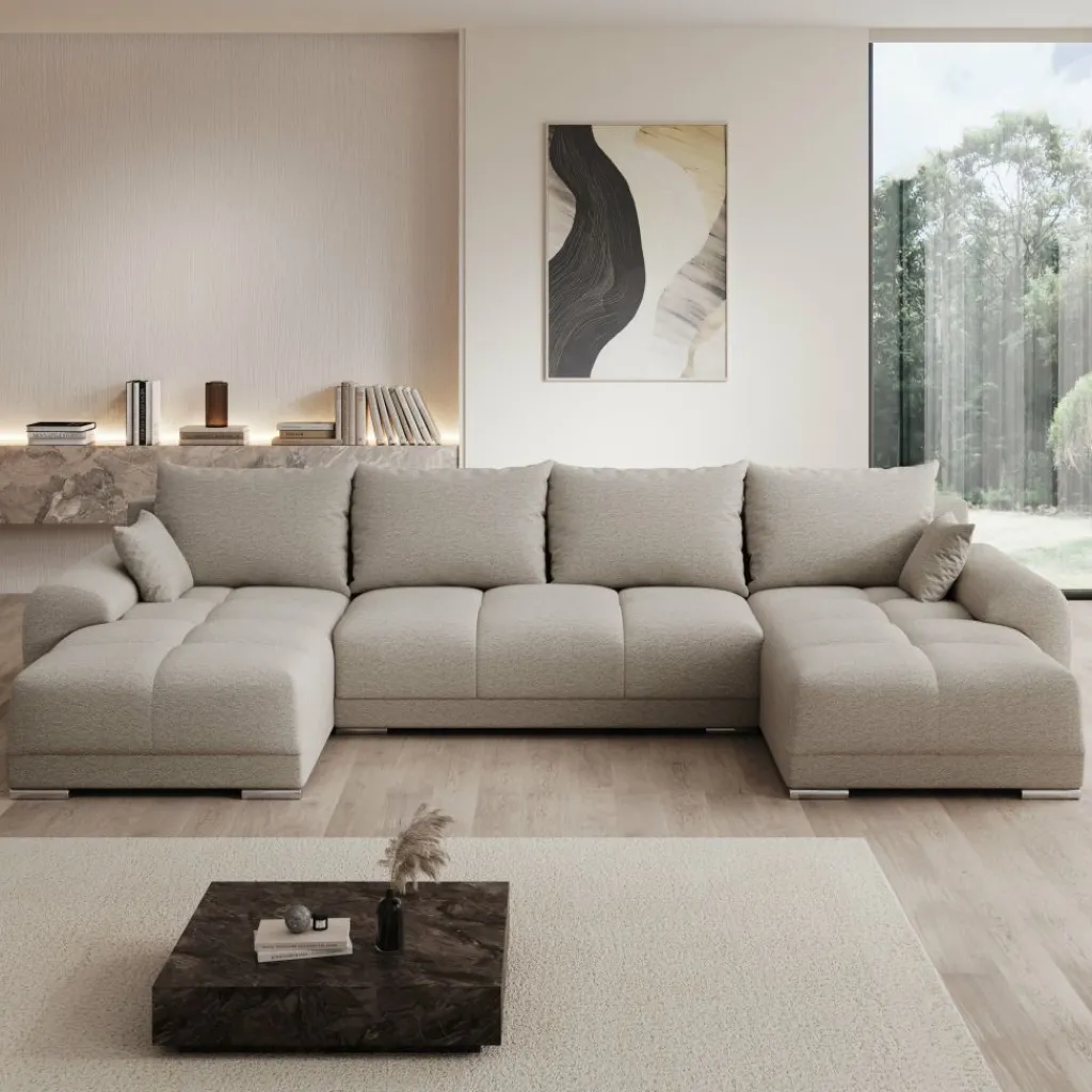 Hoekbank Layana U is een symmetrische hoekbank in U-vorm geschikt voor 4 tot 6 personen. De bank bestaat uit twee chaise-longues met in het midden een 2-zitter. De Layana U is bekleed met een zachte stof in beige kleur. De bank staat op cilindervormige pootjes.