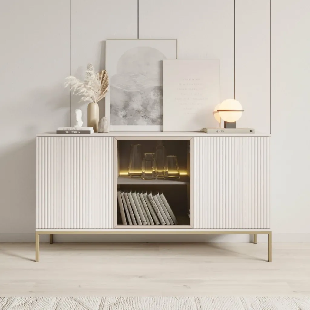 De kast heeft drie deuren met daarachter zes opbergvakken. De deuren zijn greeploos. De buitenste deuren hebben een latten patroon. De deur in het midden beschikt over getint glas. Achter het glas zit een plank welke wordt verlicht door de meegeleverde LED-verlichting.