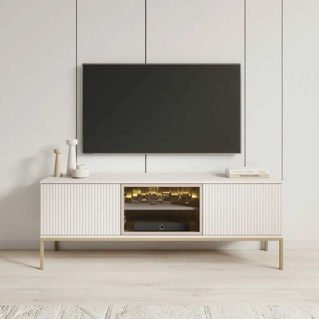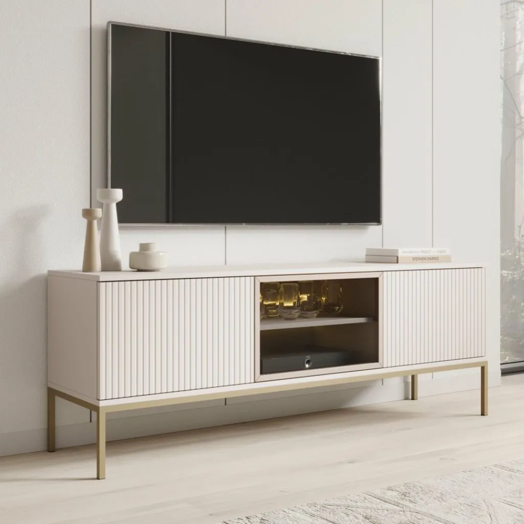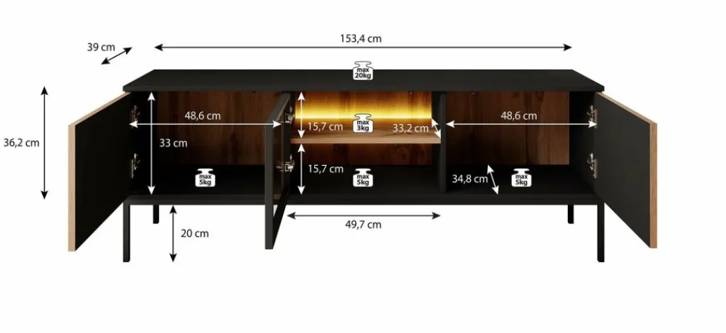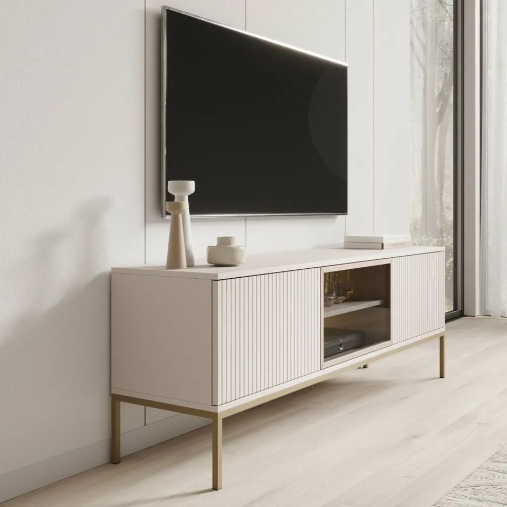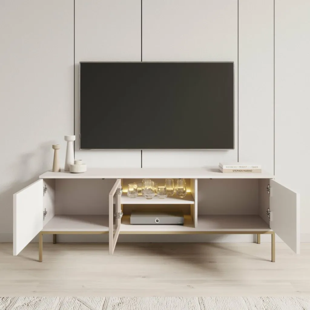 De Legend TV-meubel van 154 cm breed biedt een praktische en overzichtelijke opbergoplossing voor de woonkamer. Met drie ruime deuren is er voldoende plaats om media-apparatuur, kabels en accessoires uit het zicht te houden.