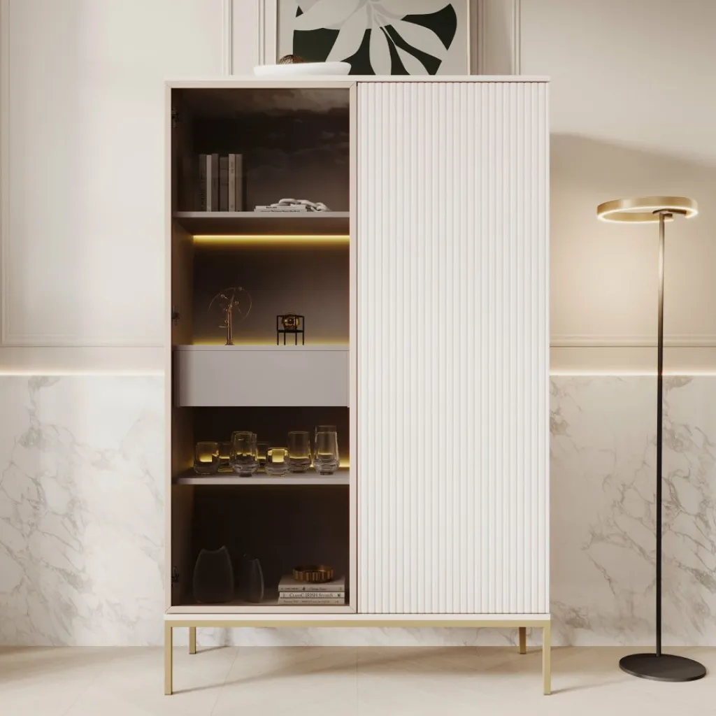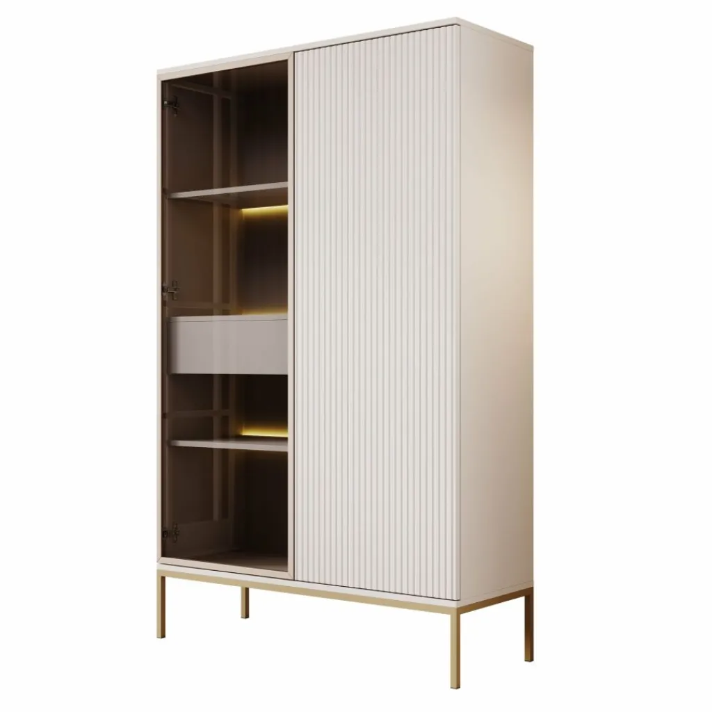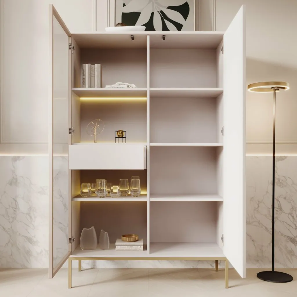 De Legend vitrinekast biedt een combinatie van presentatie- en opbergruimte. Links bevindt zich een glazen deur met geïntegreerde LED-verlichting en legplanken, verdeeld in meerdere compartimenten die geschikt zijn voor het uitstallen van servies, glaswerk of decoratieve items.