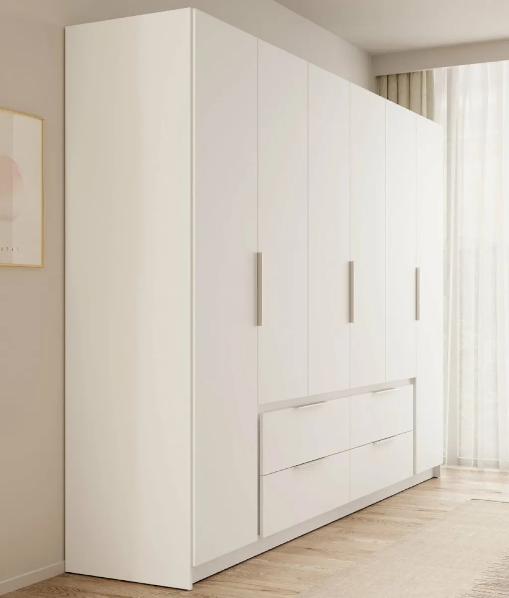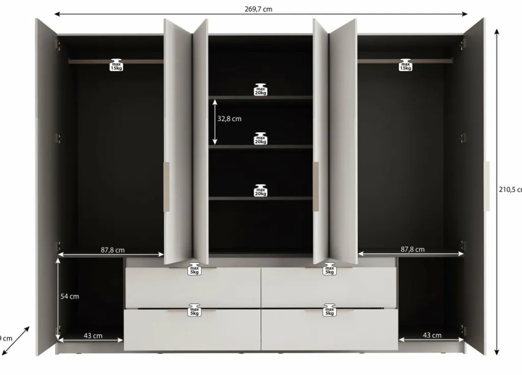 De binnenkant van de kledingkast is voorzien van 2 kledingroedes en 6 opbergvakken, zodat je al je kleding netjes kunt opbergen en organiseren.