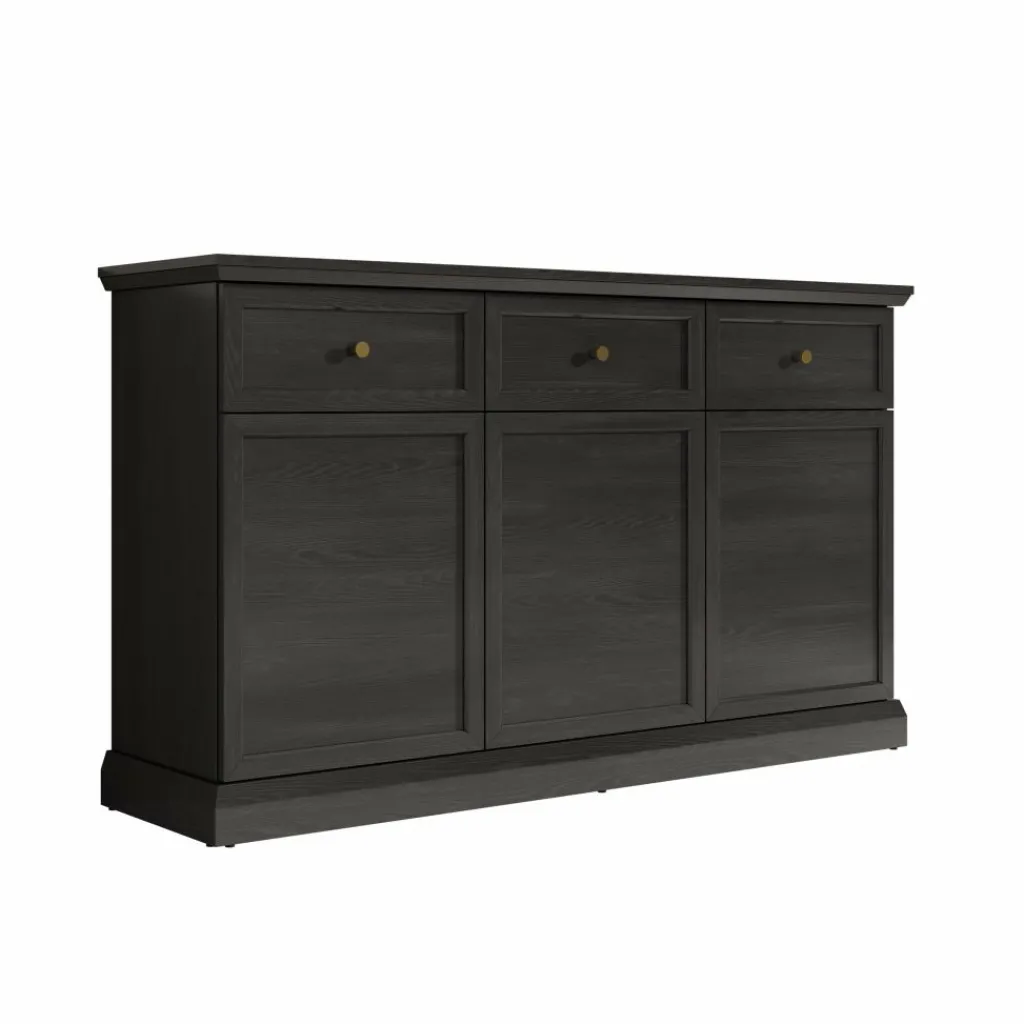 Dressoir Leroy is een opbergkast in een landelijke stijl. De kast beschikt over 3 deuren en 3 lades die openen met goudkleurige knoppen. Achter de deuren zijn nog 6 opbergvakken te vinden. Het meubel is volledig uitgevoerd in een zwart eiken kleur.