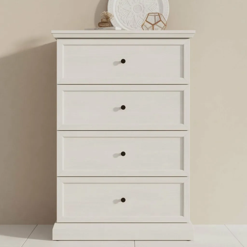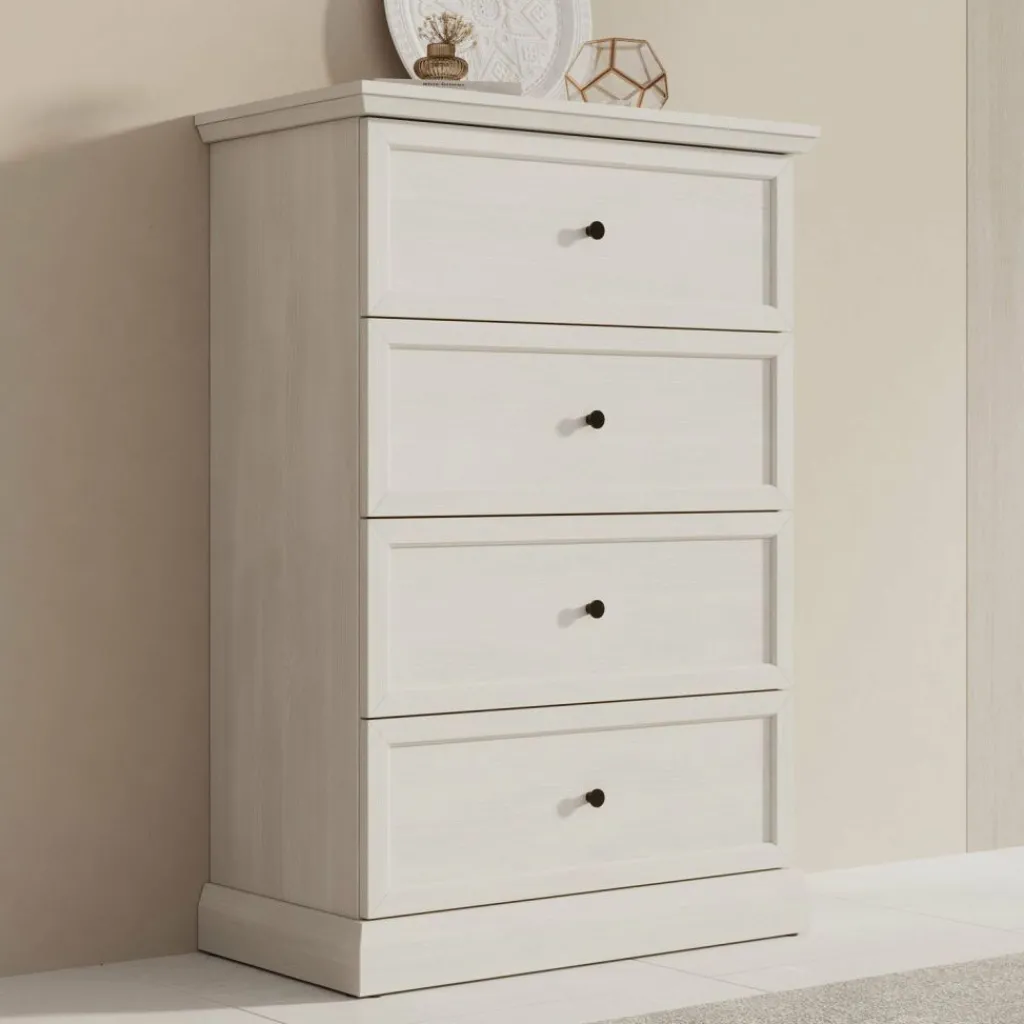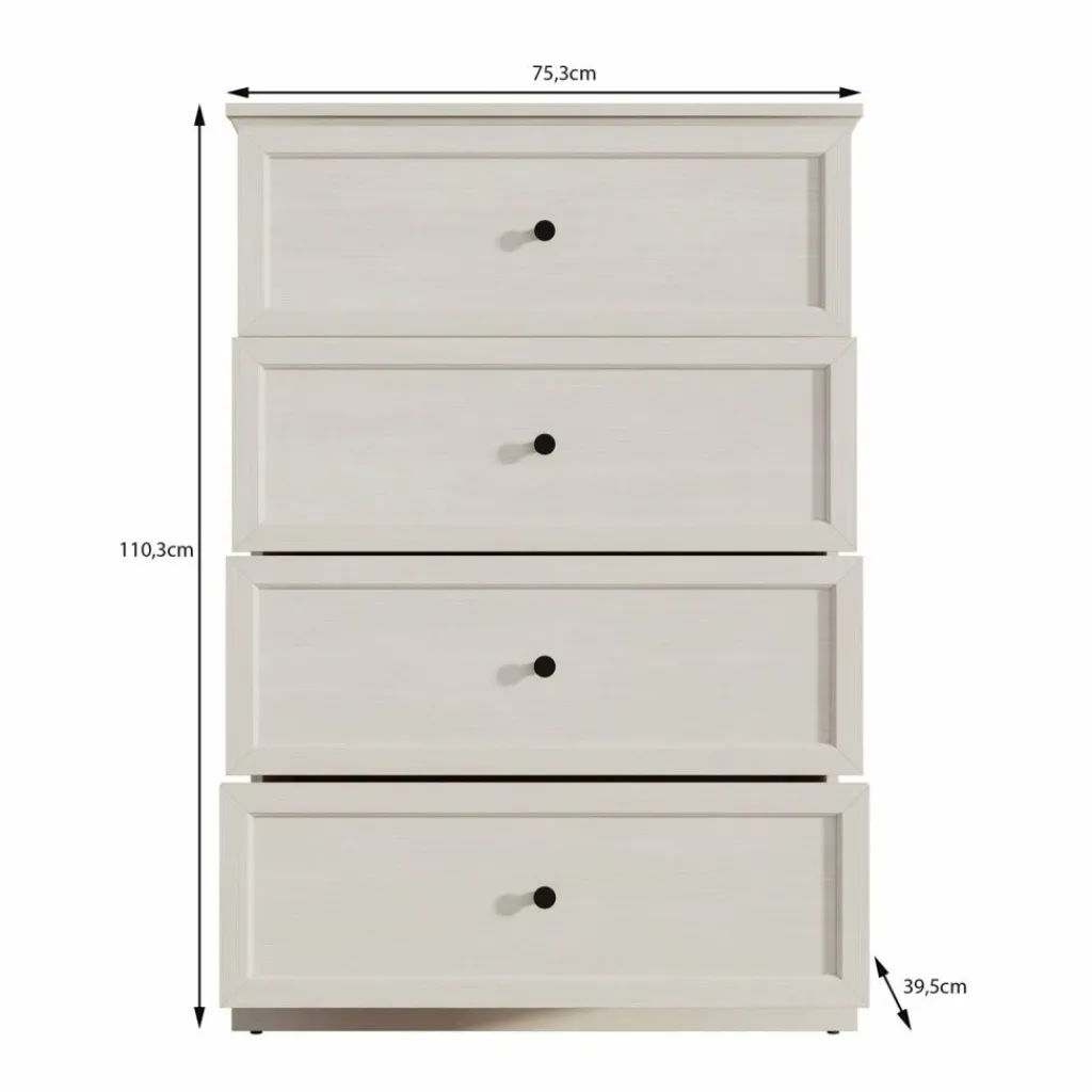 Ladekast Leroy is een opbergkast in een landelijke stijl. De opbergkast beschikt over 4 lades die openen met zwarte knoppen. Het meubel is volledig uitgevoerd in een wit eiken kleur.