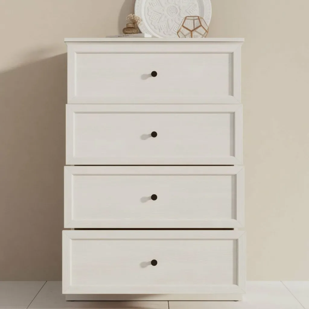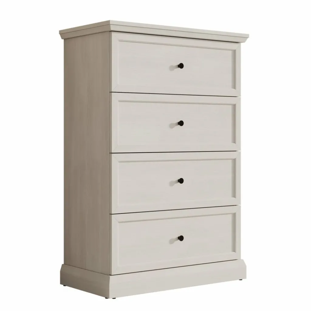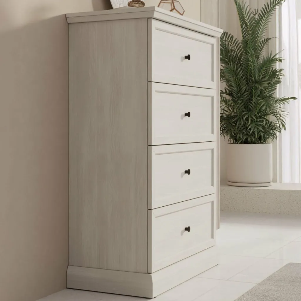 Ladekast Leroy is een opbergkast in een landelijke stijl. De opbergkast beschikt over 4 lades die openen met zwarte knoppen. Het meubel is volledig uitgevoerd in een wit eiken kleur.