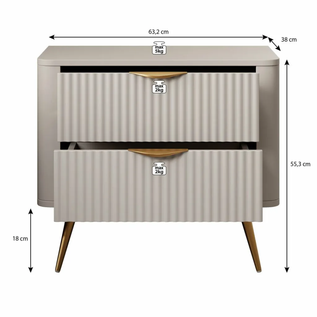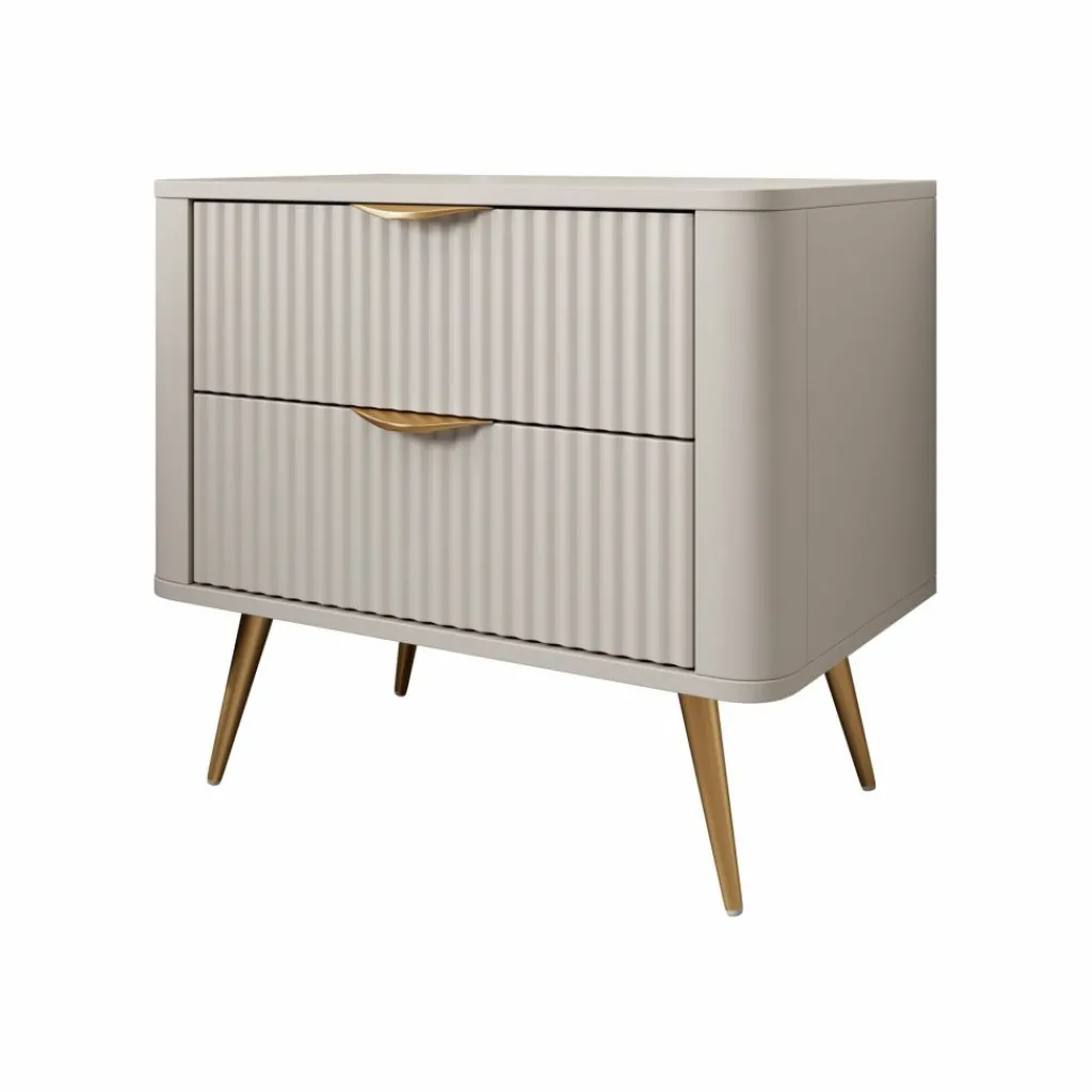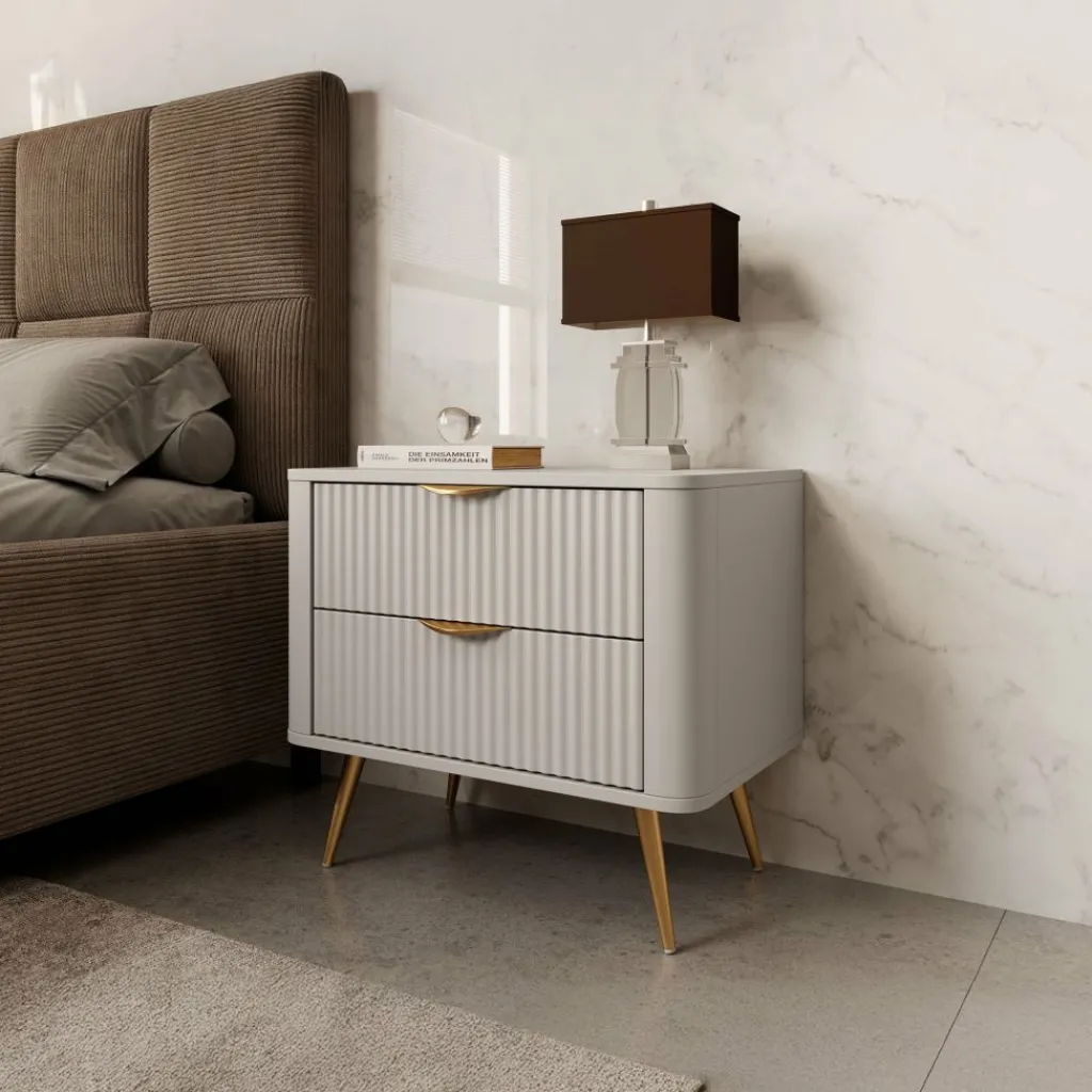 Nachtkastje Lima is een opbergkastje voor naast het bed. De Lima beschikt over 2 lades die met een goudkleurige handgreep te openen zijn. De voorkant van de lades hebben een latten patroon. Het nachtkastje staat op goudkleurige pootjes die gemaakt zijn van metaal.