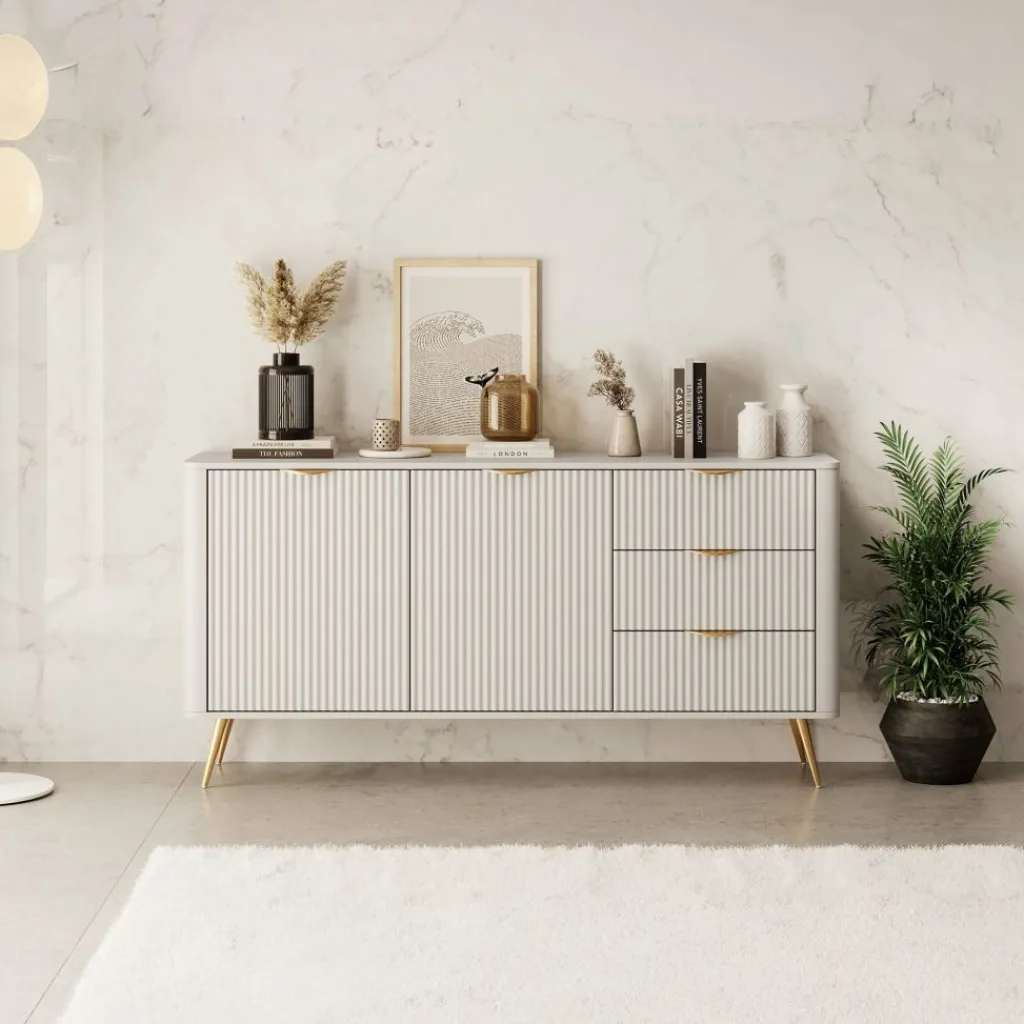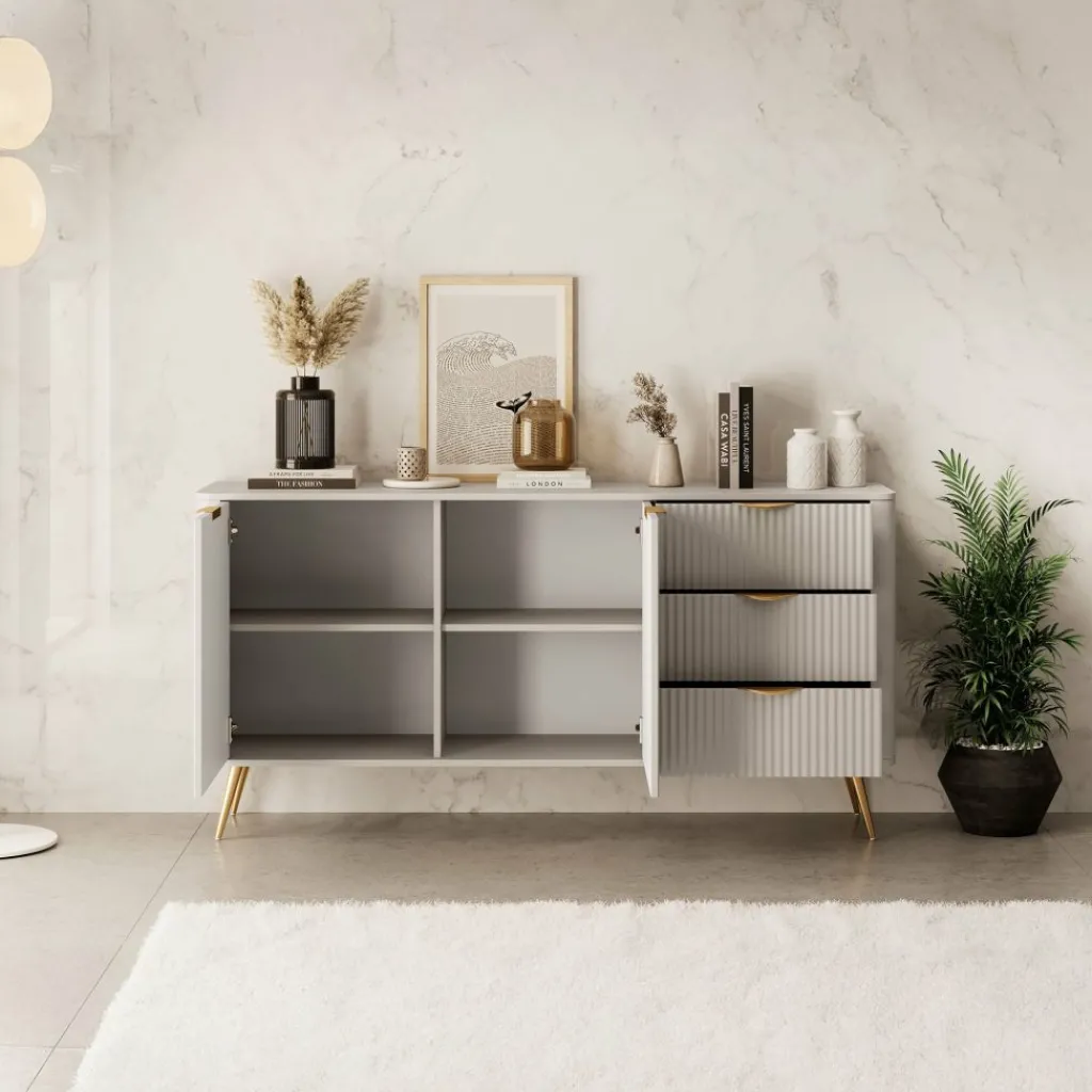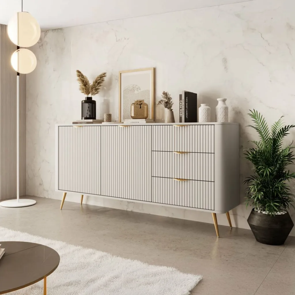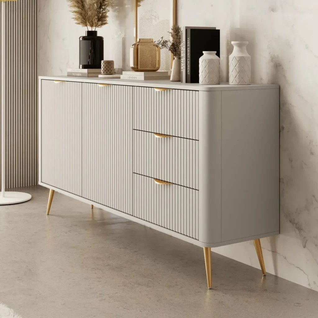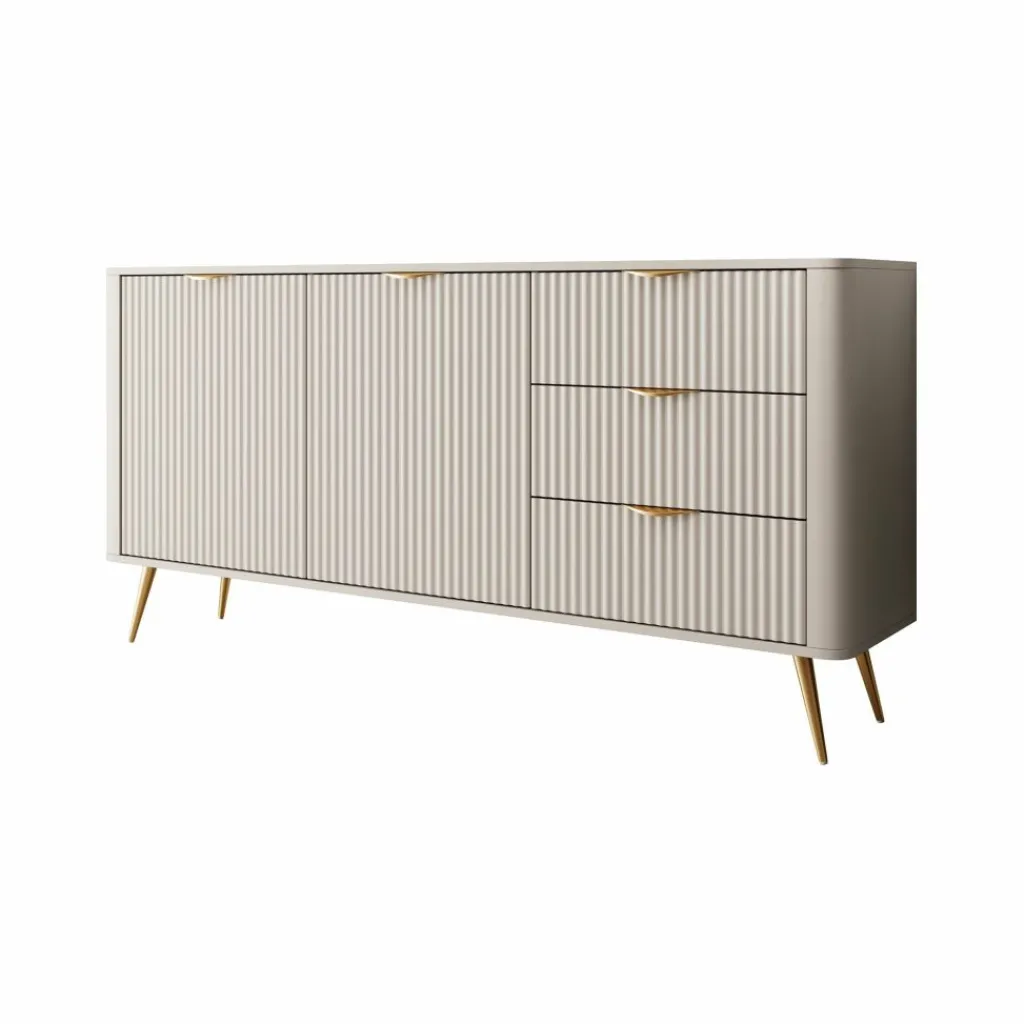 Dressoir Lima is een opbergkast in een hotel chique stijl. Het dressoir staat op metalen poten in de kleur goud. De kast heeft 3 lades en 2 deuren die openen met goudkleurige handgrepen. Achter de deuren bevinden zich 4 opbergvakken. De voorkant heeft een latten patroon wat de kast een unieke uitstraling geeft.