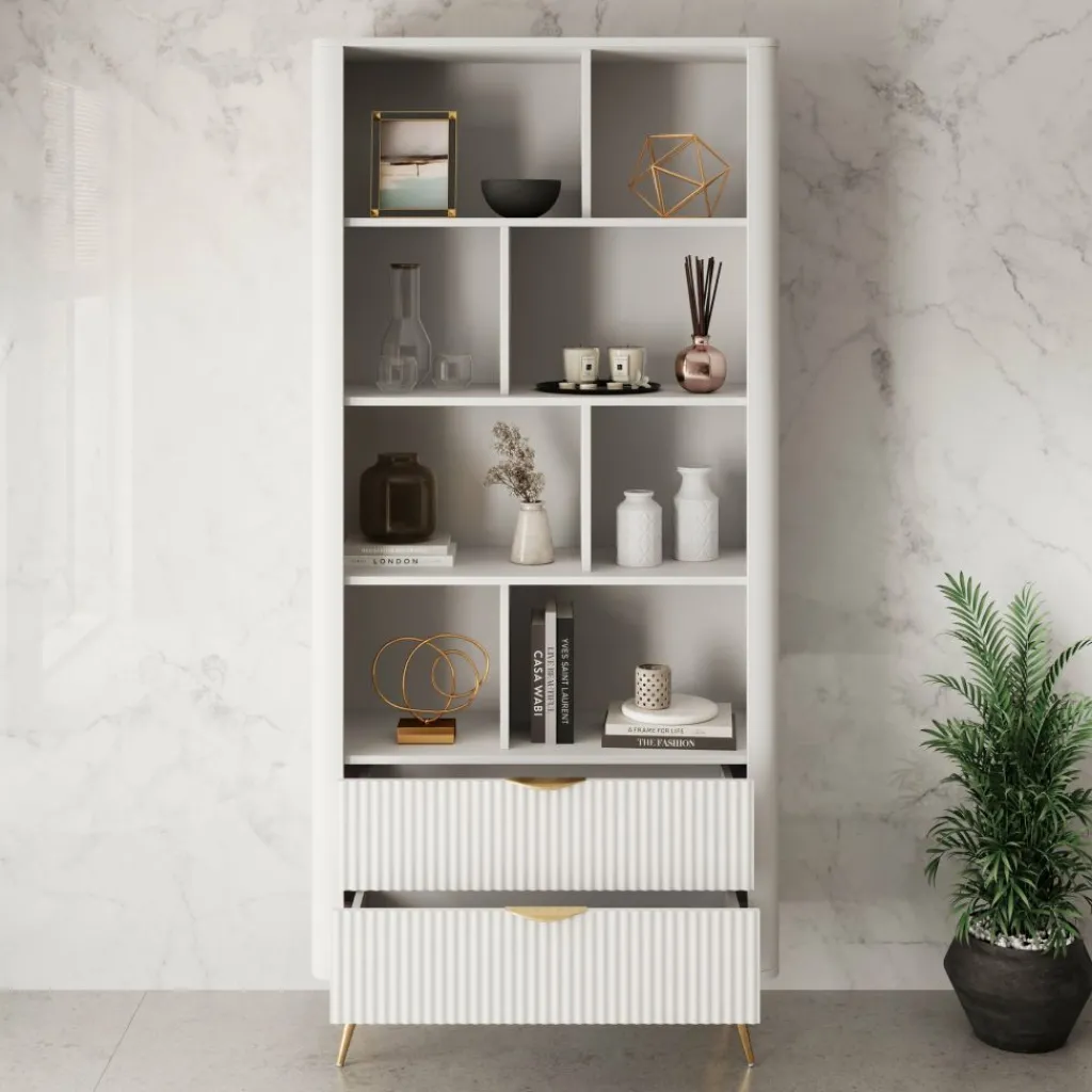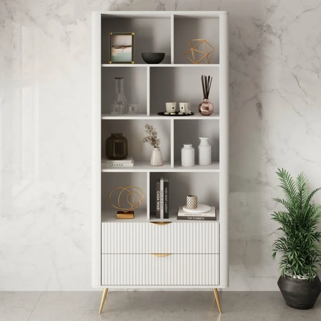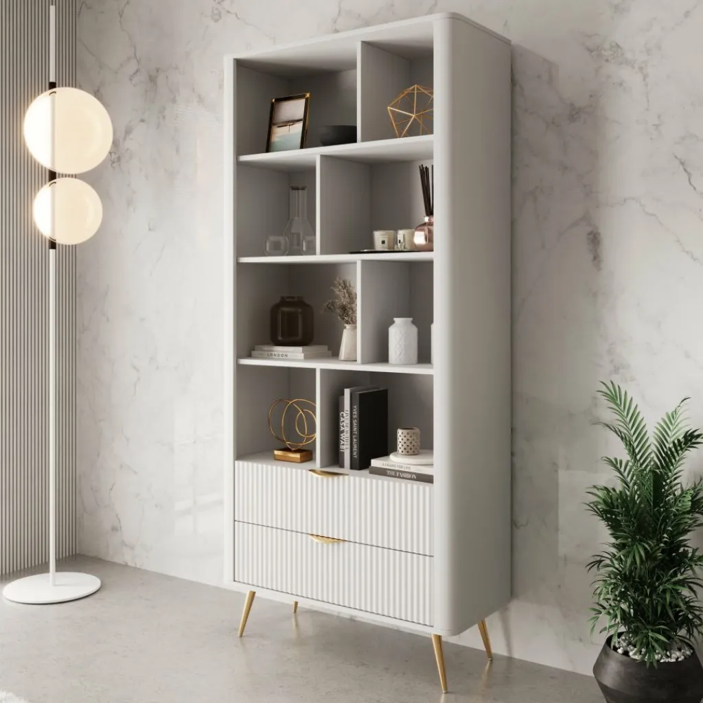 De Lima boekenkast in wit heeft een modern ontwerp met een lichte en elegante uitstraling. De afgeronde hoeken, verticale lijnen op de lades en goudkleurige accenten zorgen voor een verfijnde afwerking.