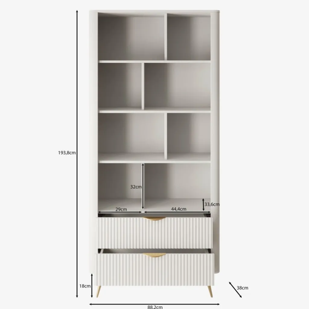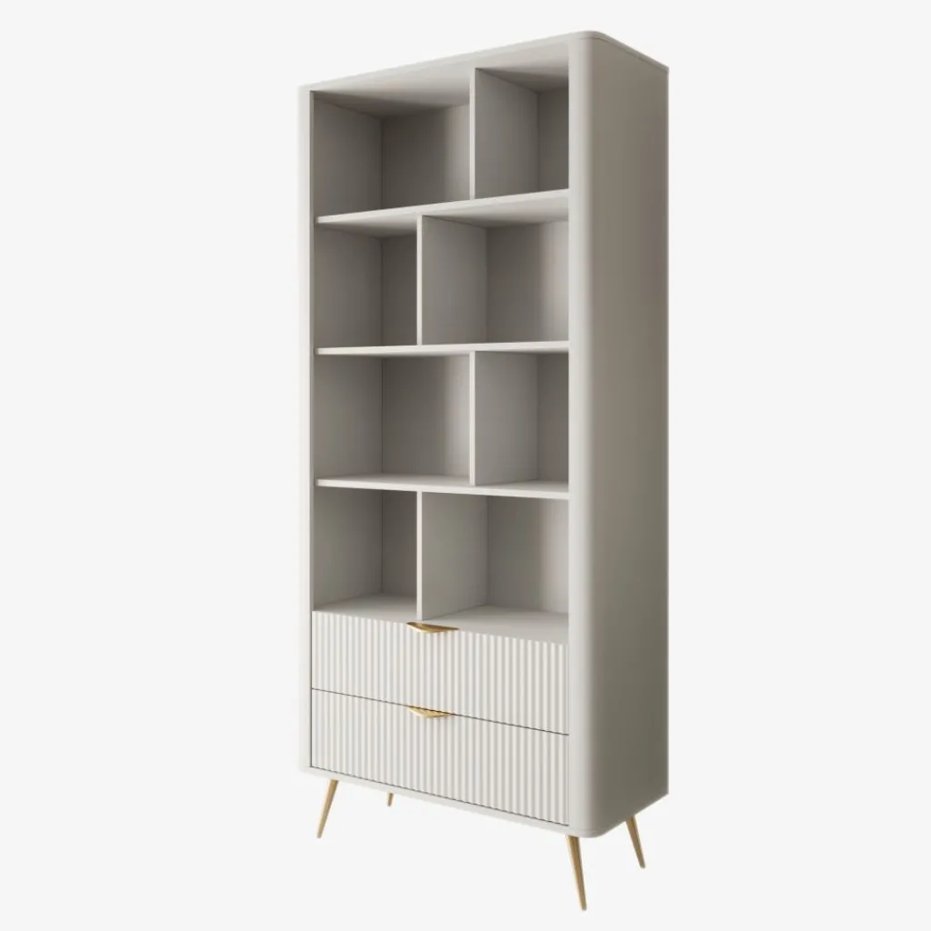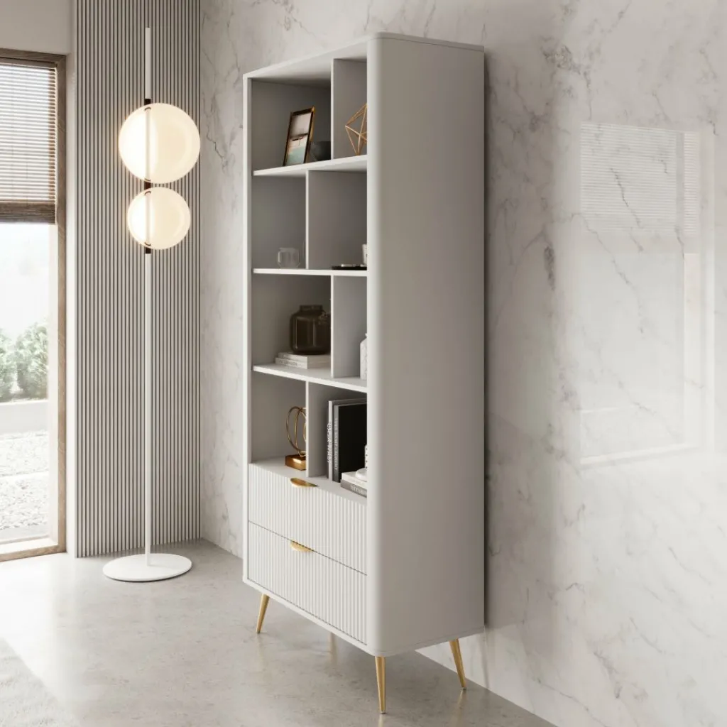 De Lima boekenkast in wit heeft een modern ontwerp met een lichte en elegante uitstraling. De afgeronde hoeken, verticale lijnen op de lades en goudkleurige accenten zorgen voor een verfijnde afwerking.