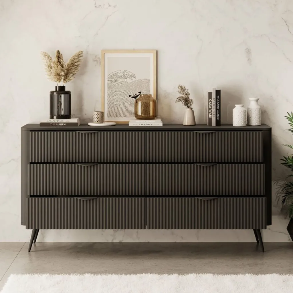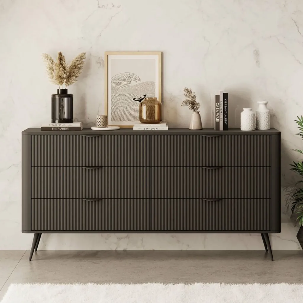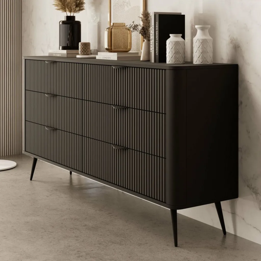 Ladekast Lima is een opbergkast in een hotel chique stijl. Het dressoir staat op metalen poten. De kast beschikt over 6 lades die openen met zwarte handgrepen. De voorkant heeft een latten patroon wat de kast een unieke uitstraling geeft.