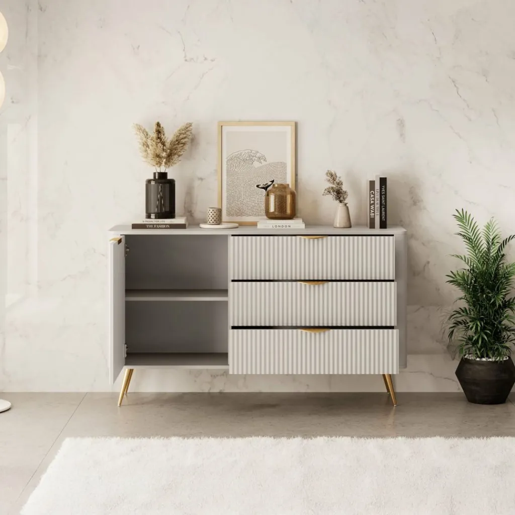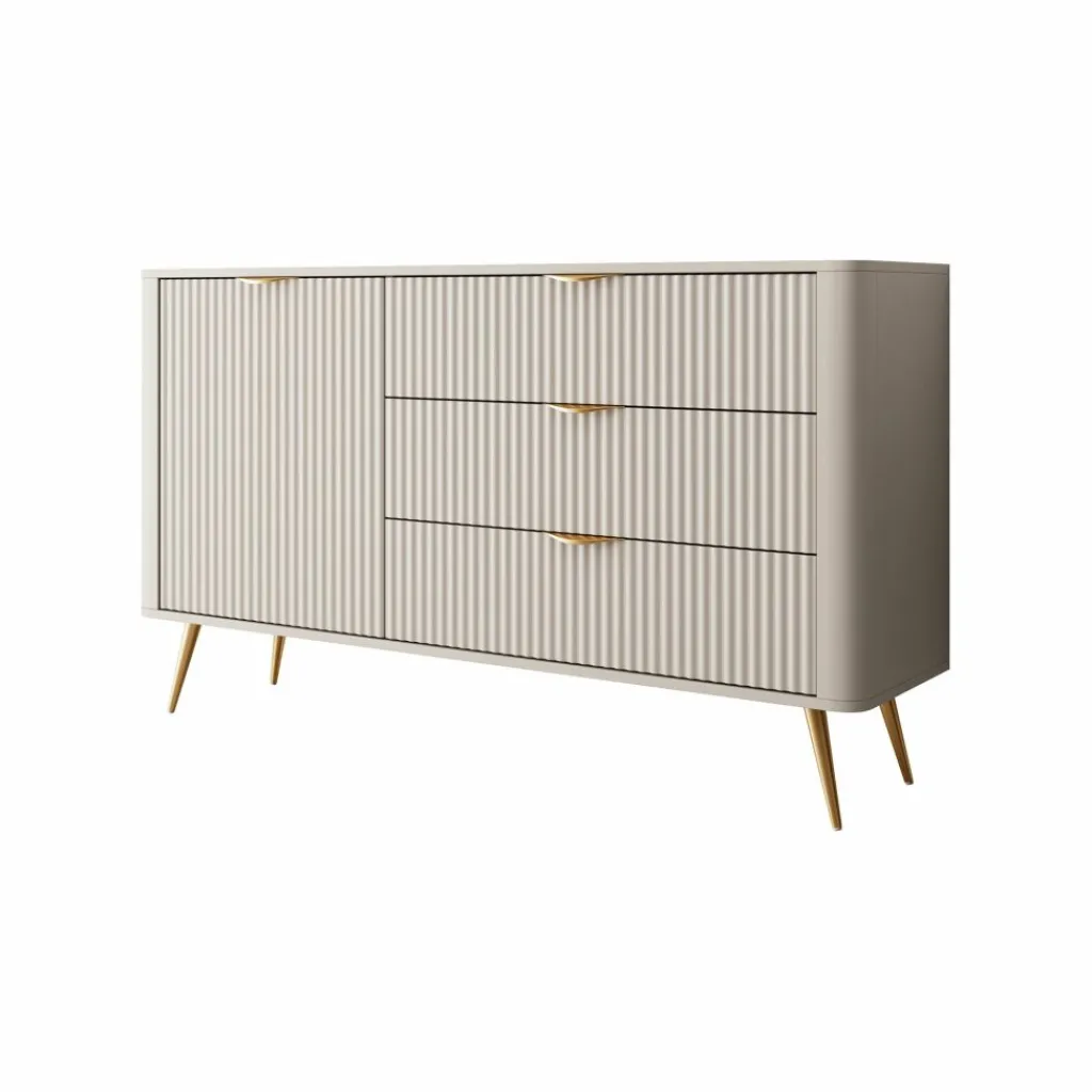 Dressoir Lima is een opbergkast in een hotel chique stijl. Het dressoir staat op metalen poten in de kleur goud. De kast heeft 3 lades en 1 deur die openen met goudkleurige handgrepen. Achter het deurtje bevinden zich 2 opbergvakken. De voorkant heeft een latten patroon wat de kast een unieke uitstraling geeft.