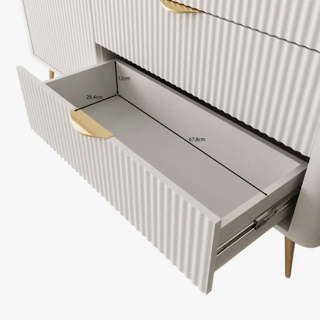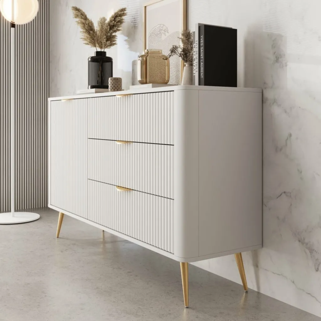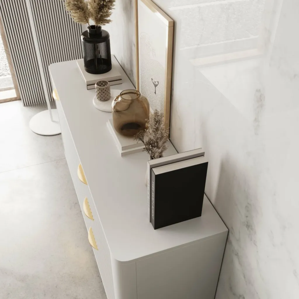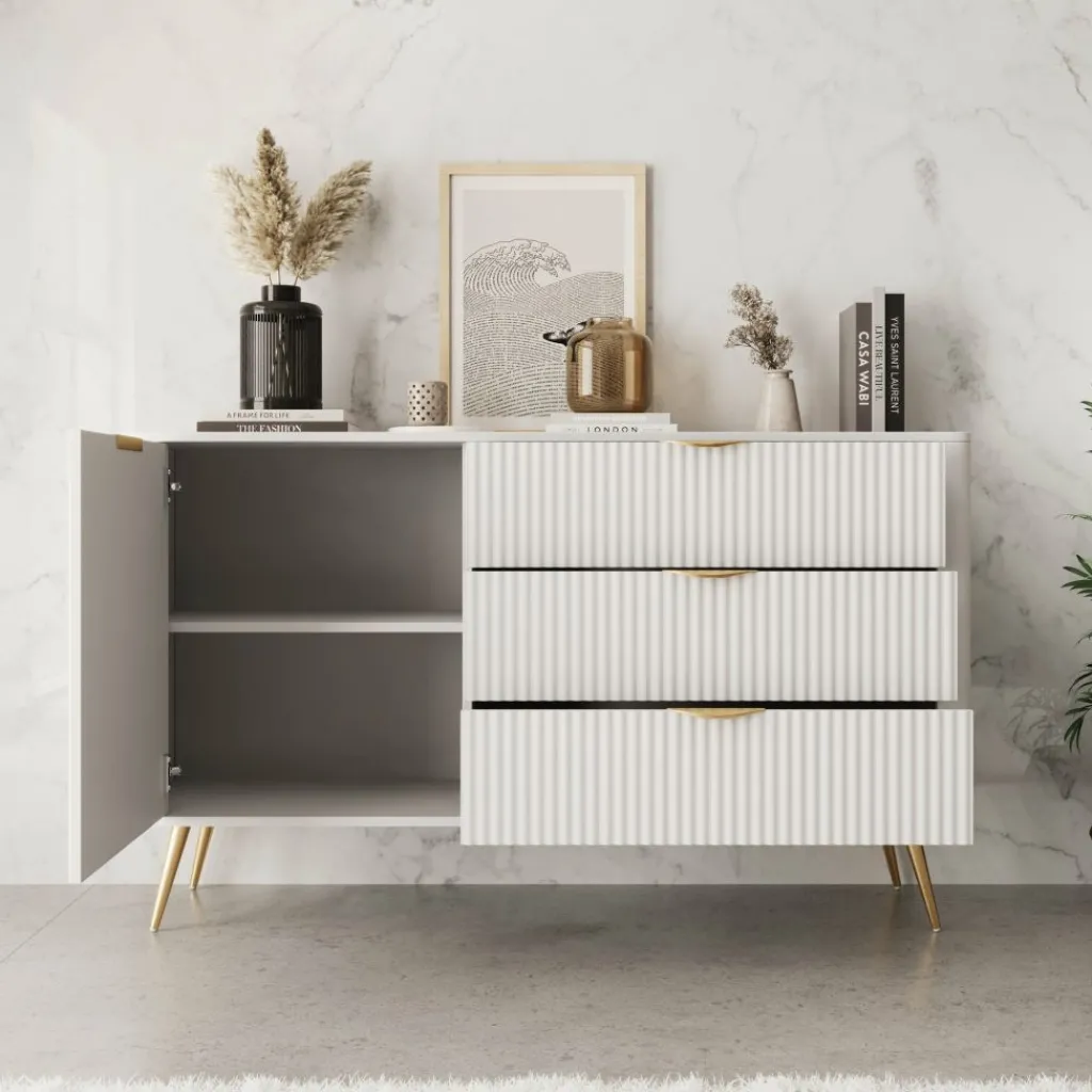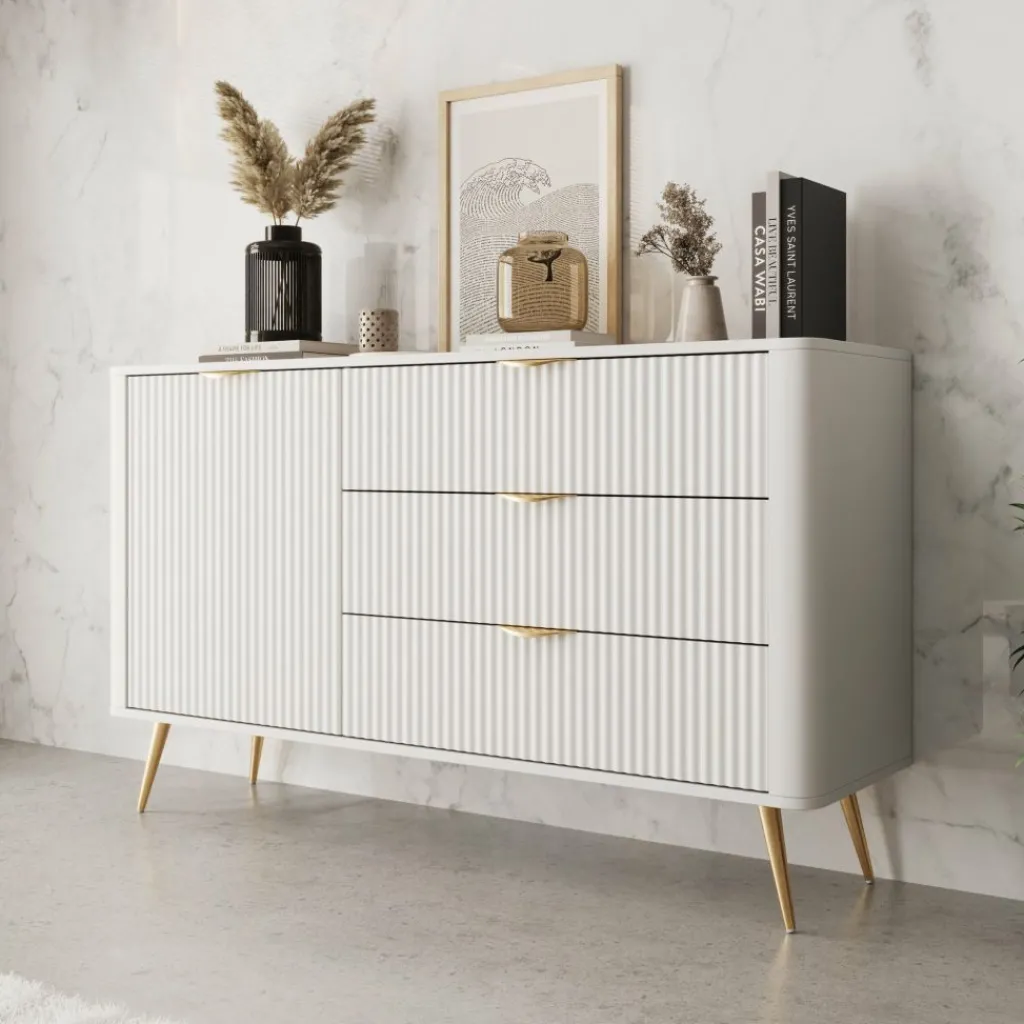 Het Lima dressoir in wit heeft een strak en modern ontwerp met verfijnde details. De verticale lijnen in het front, afgeronde hoeken en goudkleurige accenten zorgen voor een stijlvolle afwerking.