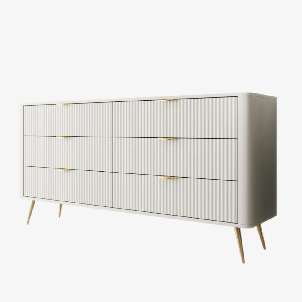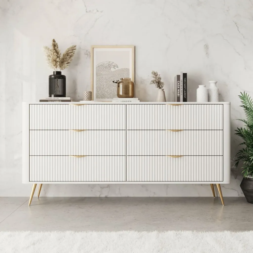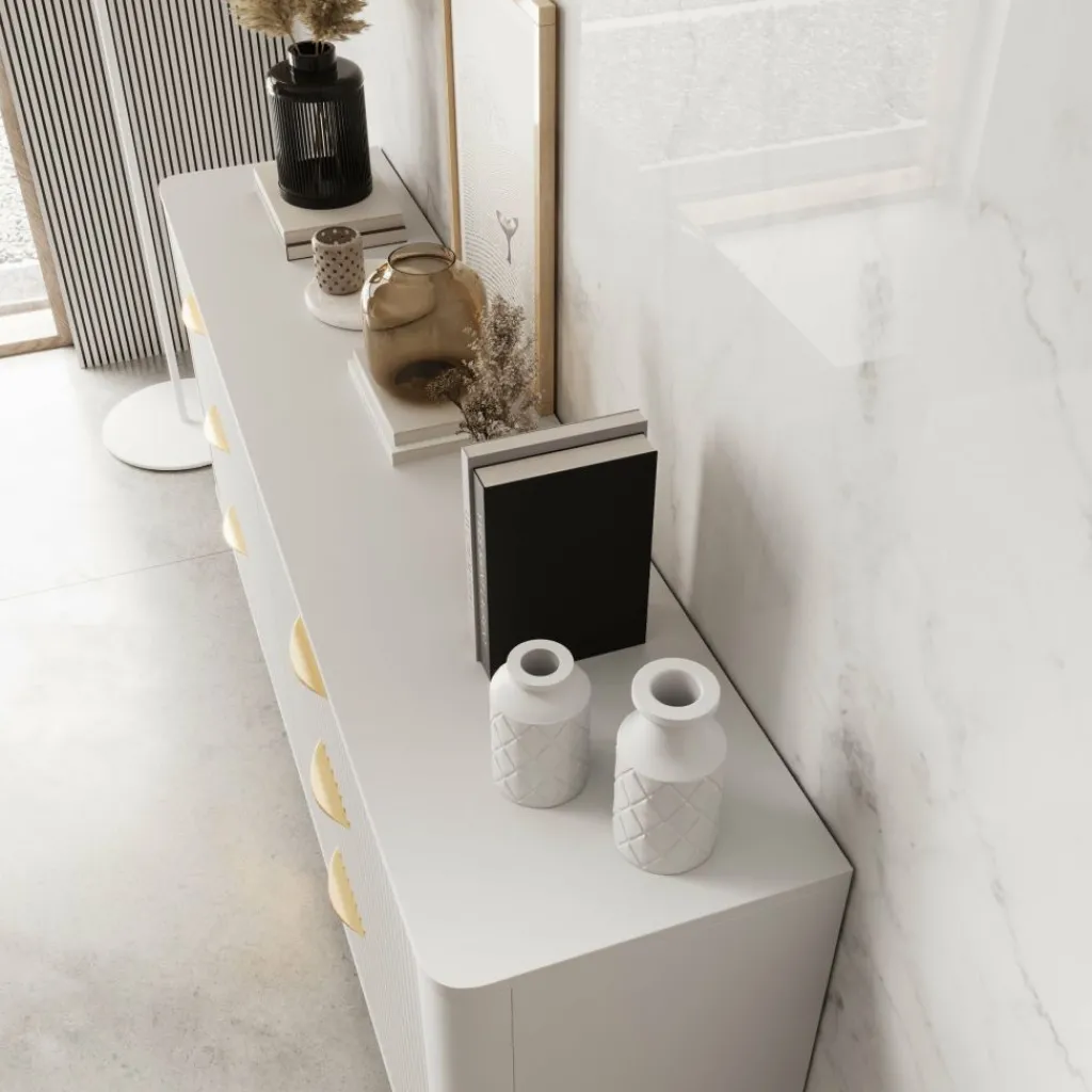 De Lima ladekast in wit heeft een strak en modern ontwerp met subtiele, elegante details. De verticale lijnen in het front, afgeronde hoeken en goudkleurige grepen en poten geven het meubel een luxe uitstraling zonder overdreven te zijn.