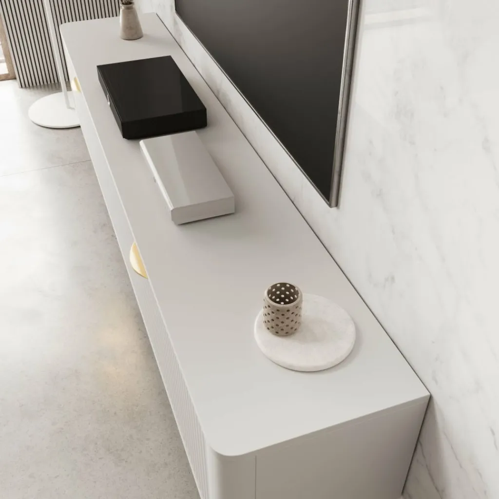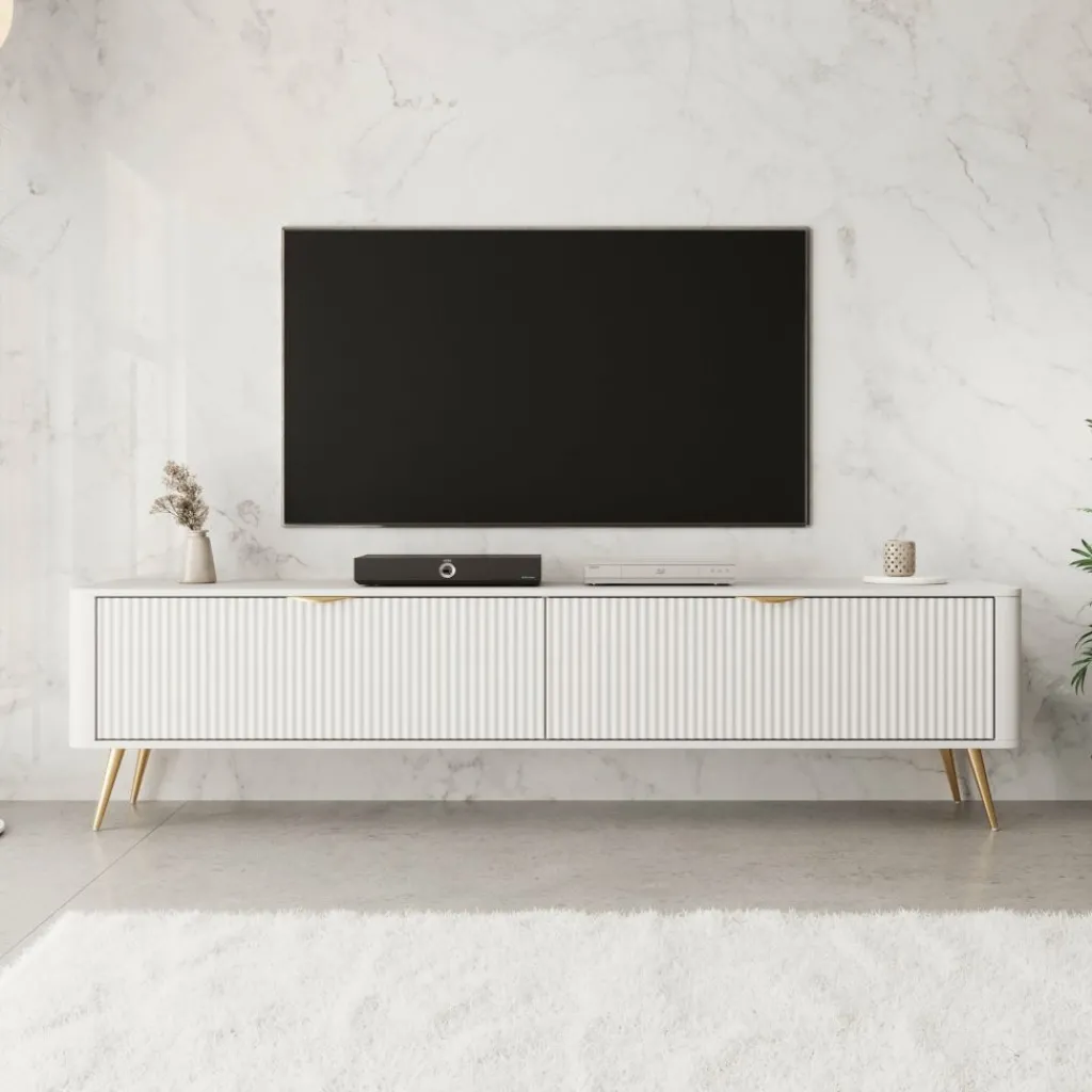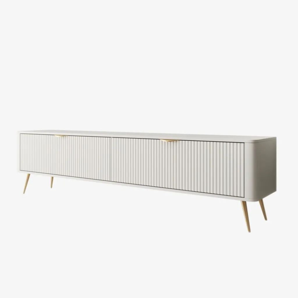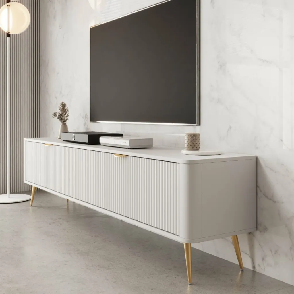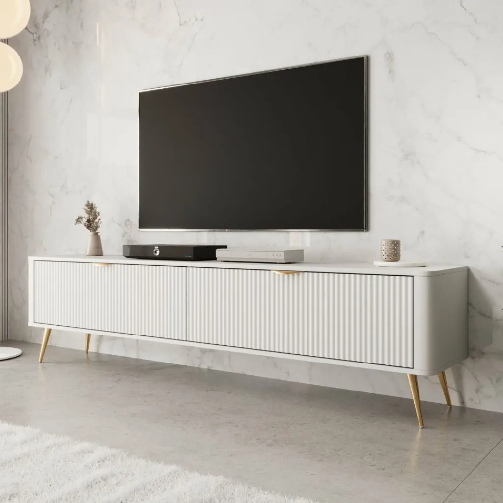 Het Lima TV-meubel in wit heeft een modern ontwerp met verfijnde details. De verticale lijnen op de fronten, afgeronde hoeken en goudkleurige grepen en poten geven het meubel een stijlvolle uitstraling.