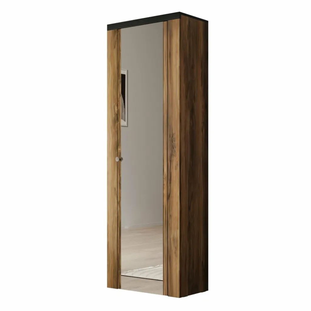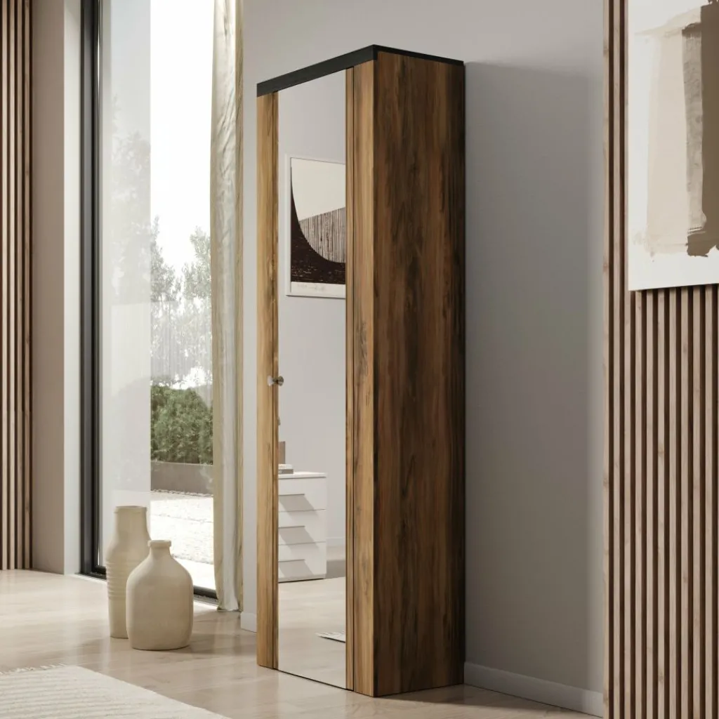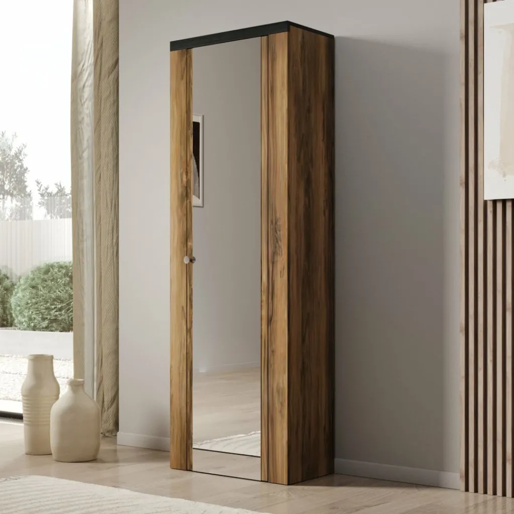 Schoenenkast Linford is een compacte kast met spiegeldeur en biedt ruimte aan meerdere paren schoenen. De kast is uitgevoerd in donker eiken met een zwarte bovenrand en heeft een moderne, rustige uitstraling.