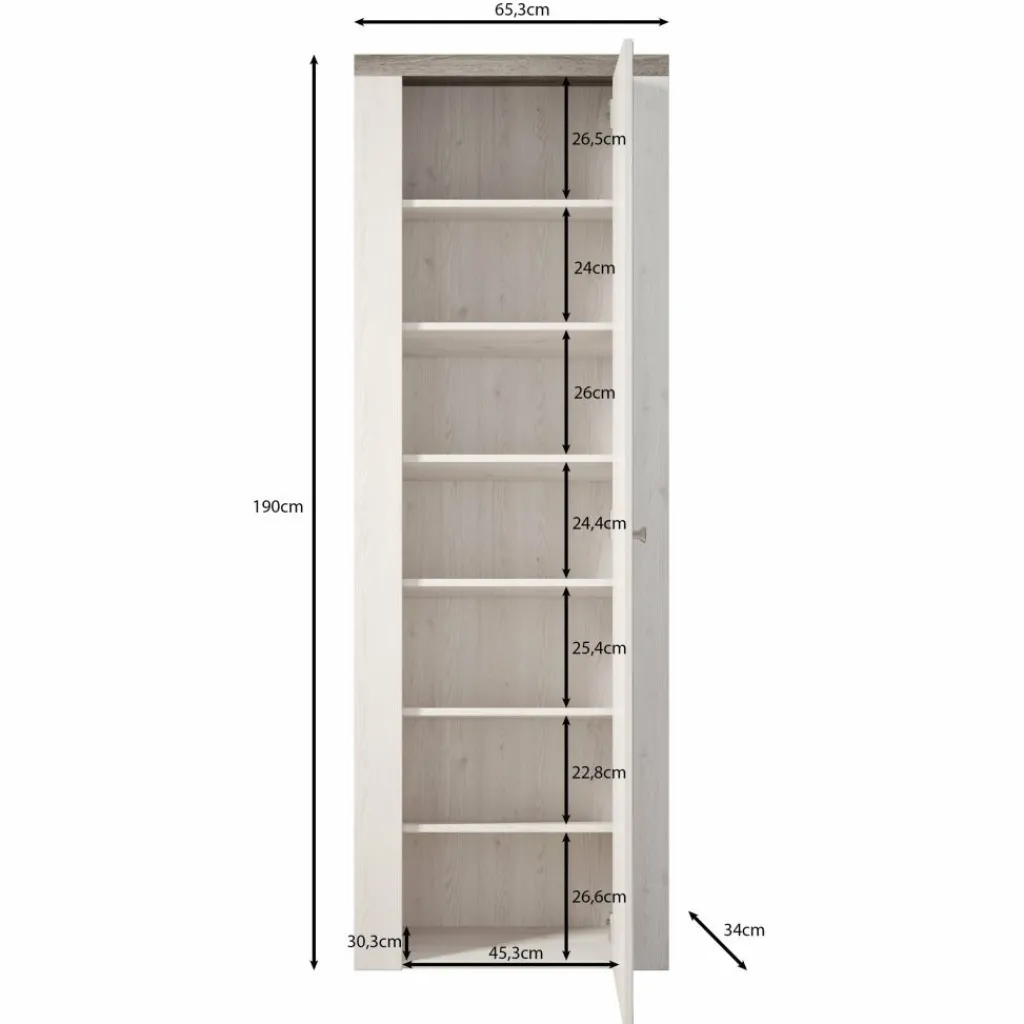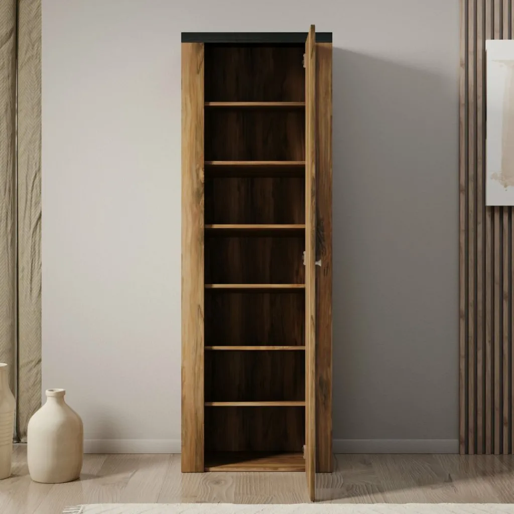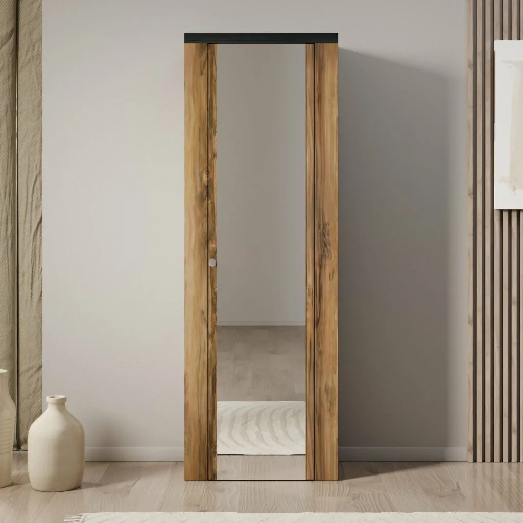 Achter de scharnierdeur bevinden zich zeven legplanken met verschillende hoogtes, ideaal voor het overzichtelijk opbergen van schoenen, laarzen of accessoires. De spiegel aan de voorkant maakt de kast extra functioneel, vooral voor in de hal of slaapkamer.