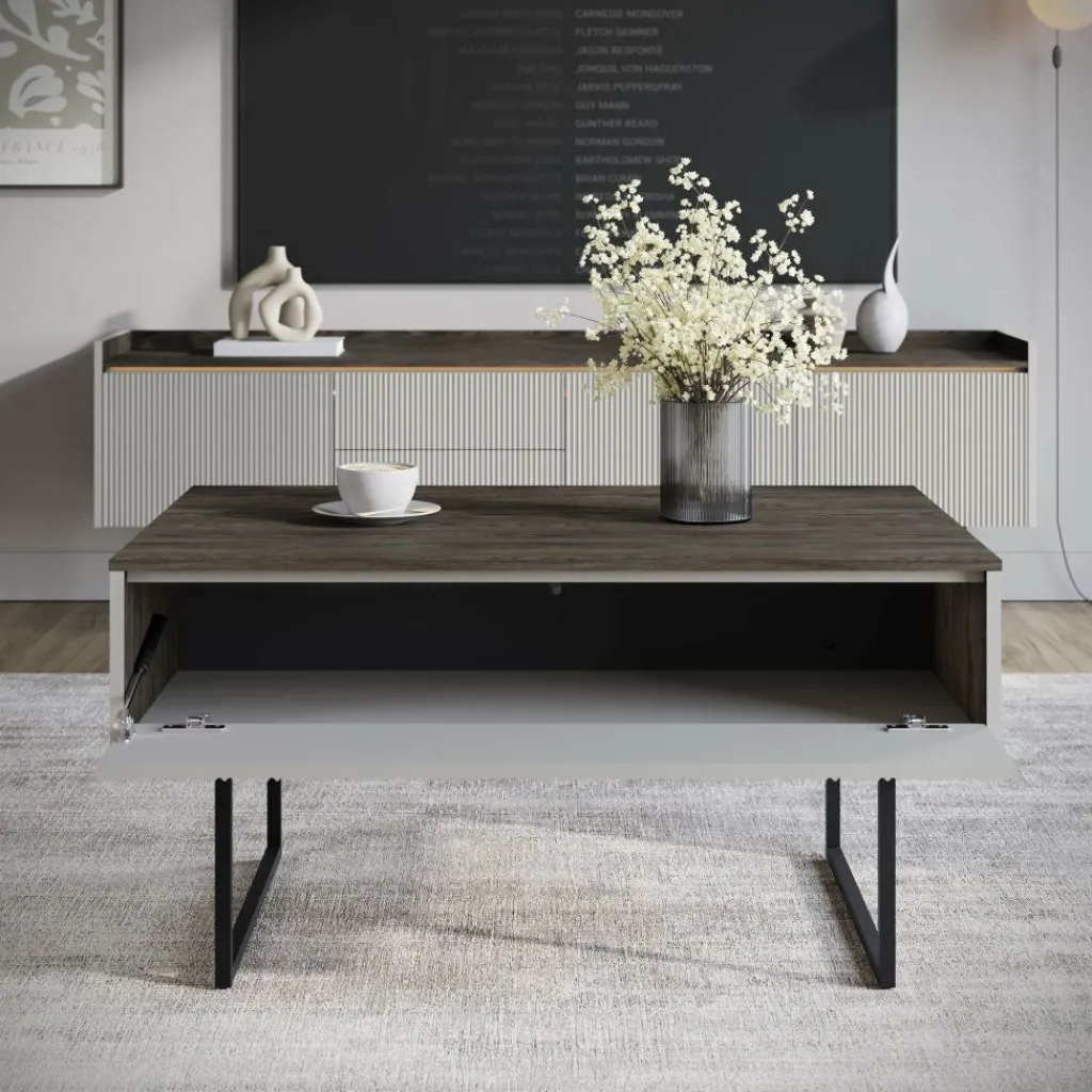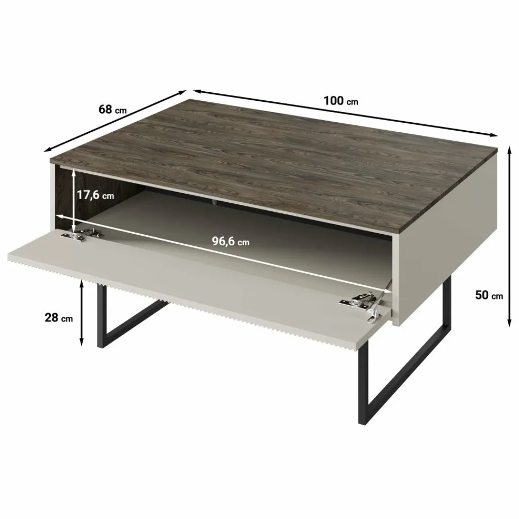 Salontafel Linq is een salontafel met een moderne uitstraling. De tafel beschikt over een klep onder het blad. Deze is greeploos en te openen met het push to open systeem. Op de voorkant van de klep zit een lattenpatroon. Aan de andere kant zit nog een open vak. De salontafel is uitgevoerd in een beige kleur met donker eiken blad. Het onderstel is in de kleur zwart en gemaakt van metaal.