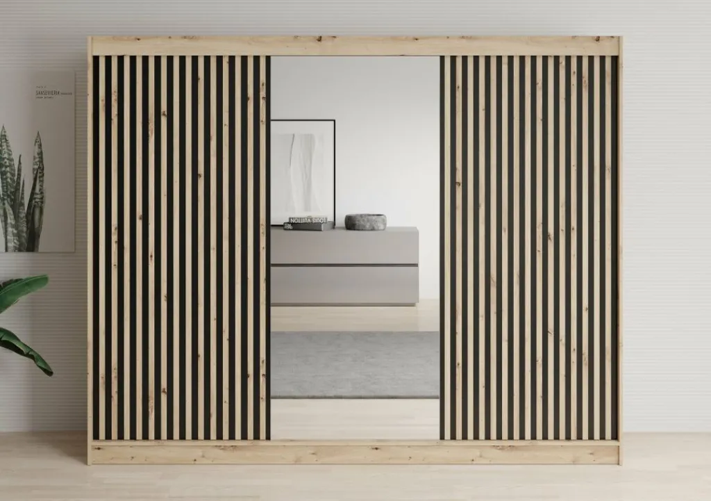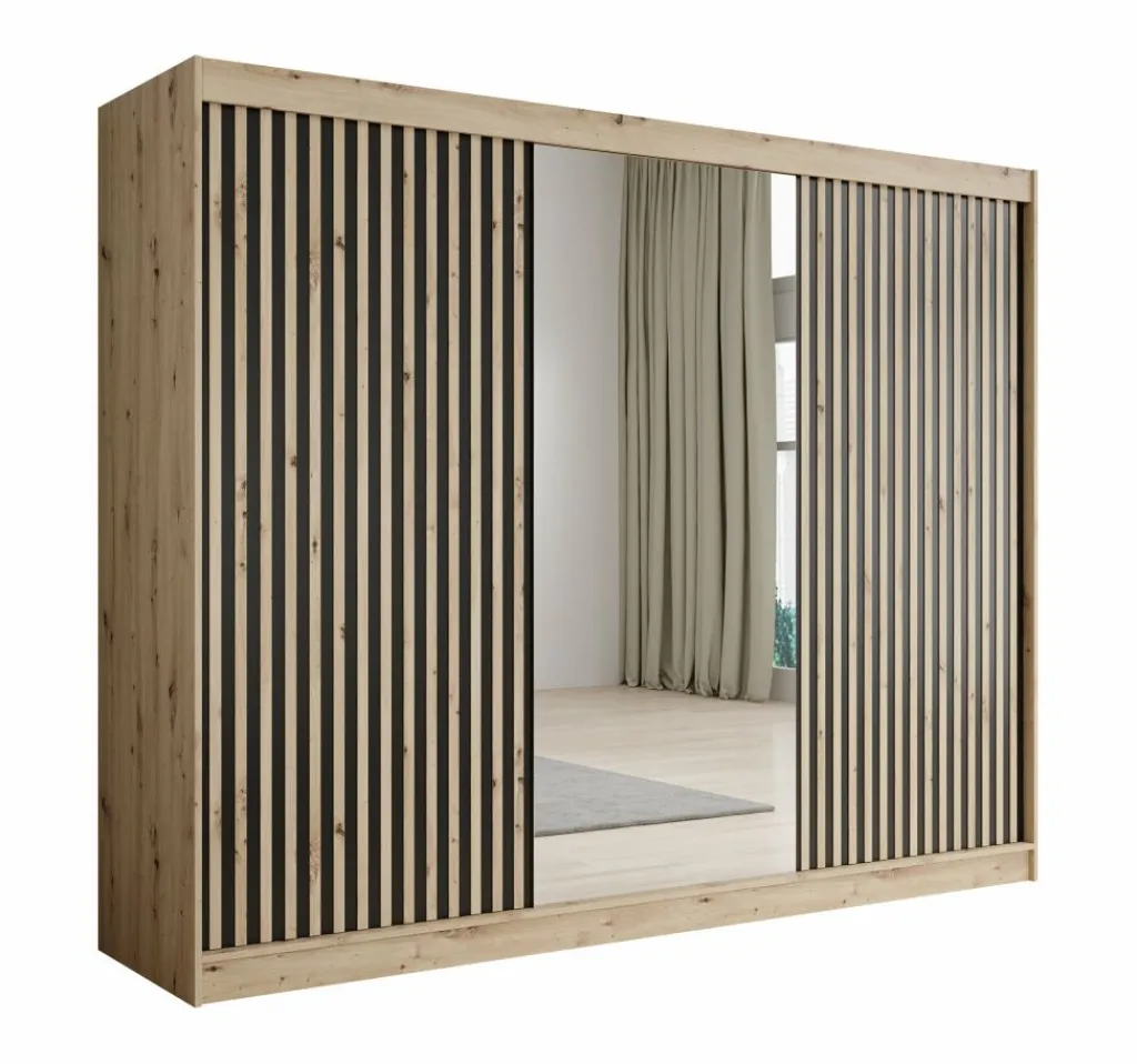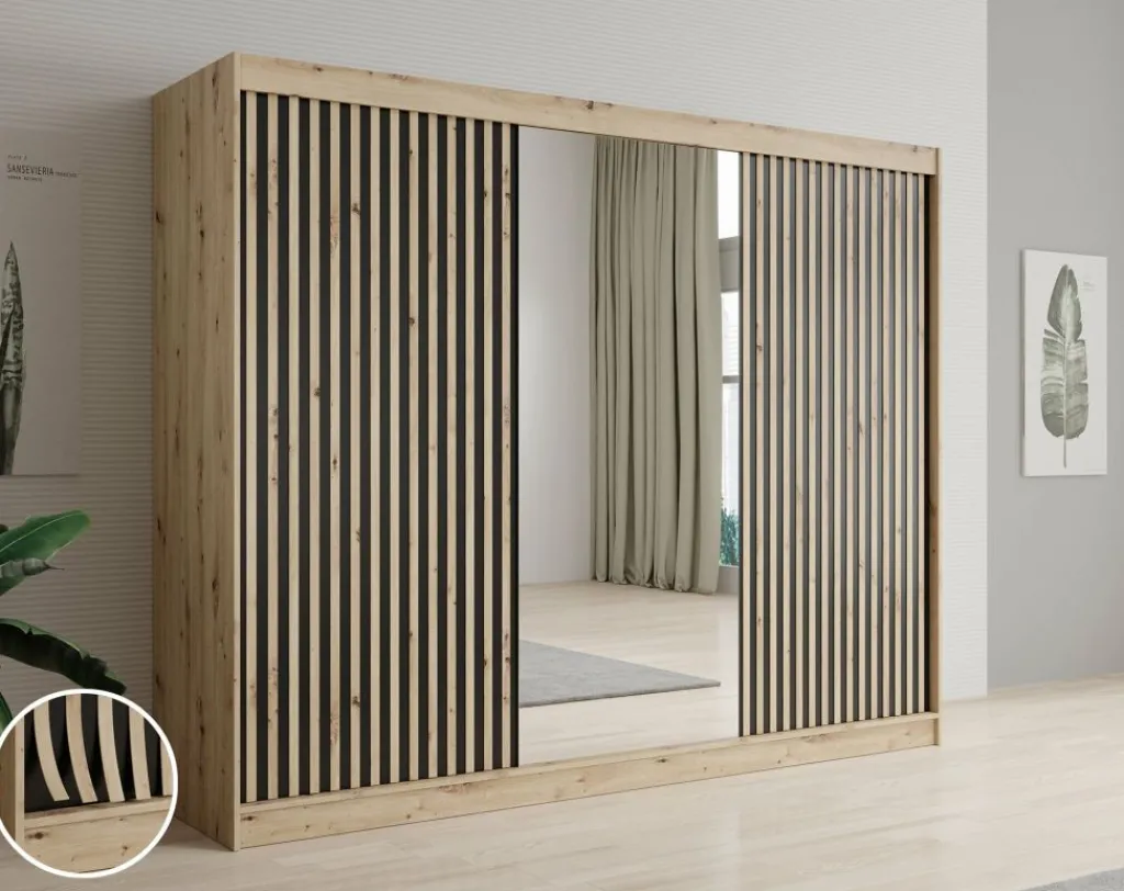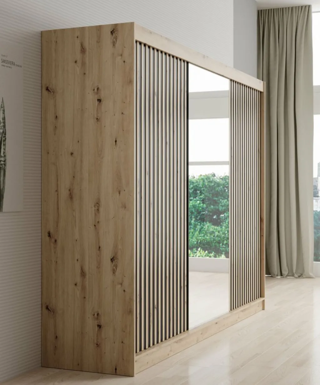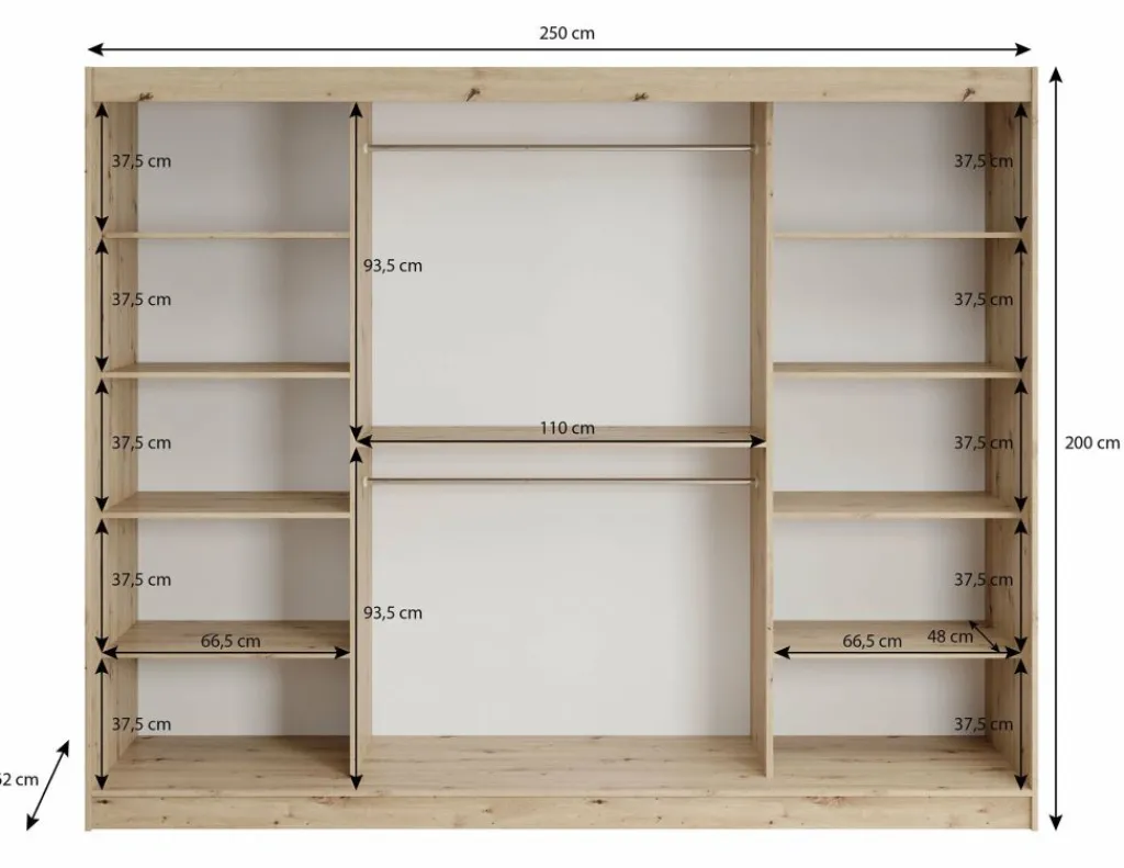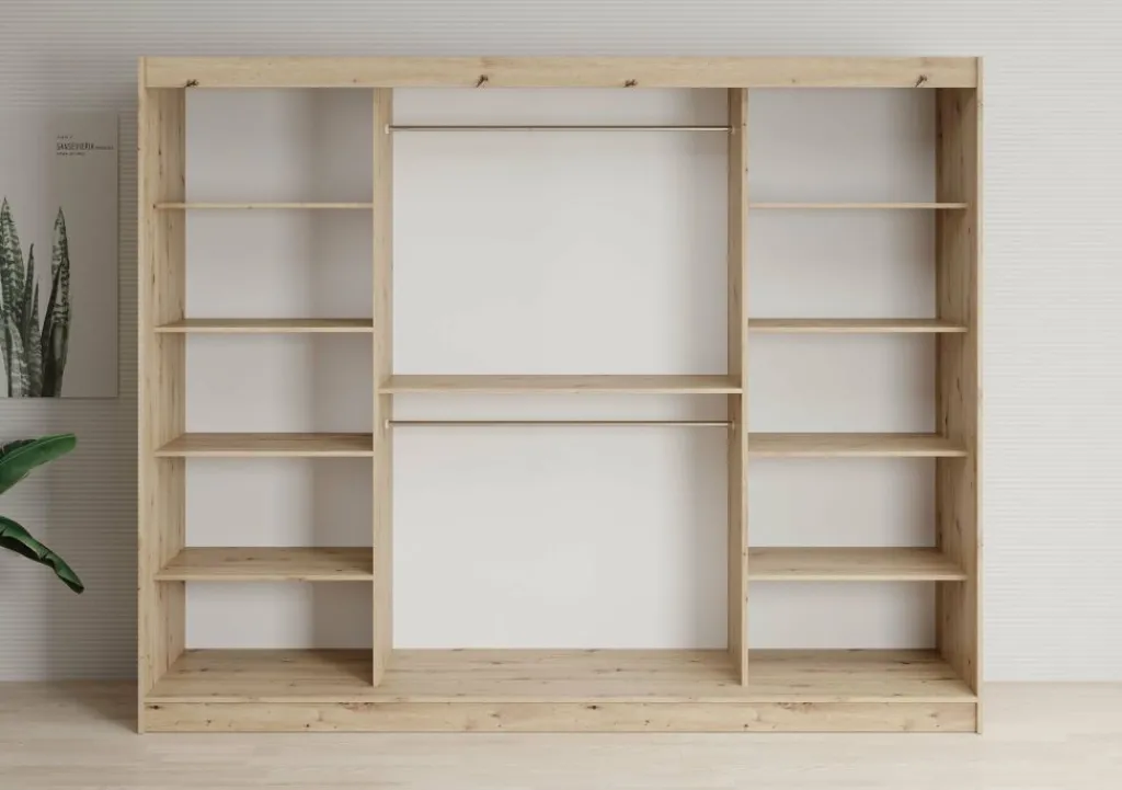 Kledingkast Lisbon is een garderobekast met ruime opbergmogelijkheden. Dit model is voorzien van 3 schuifdeuren. Het binnenwerk bestaat uit 10 open schappen. In het midden van de kast is er een mogelijkheid om kleding op te hangen op de daarvoor bestemde kledingstangen. Dit model is afgewerkt in eiken kleur met mat zwarte details.