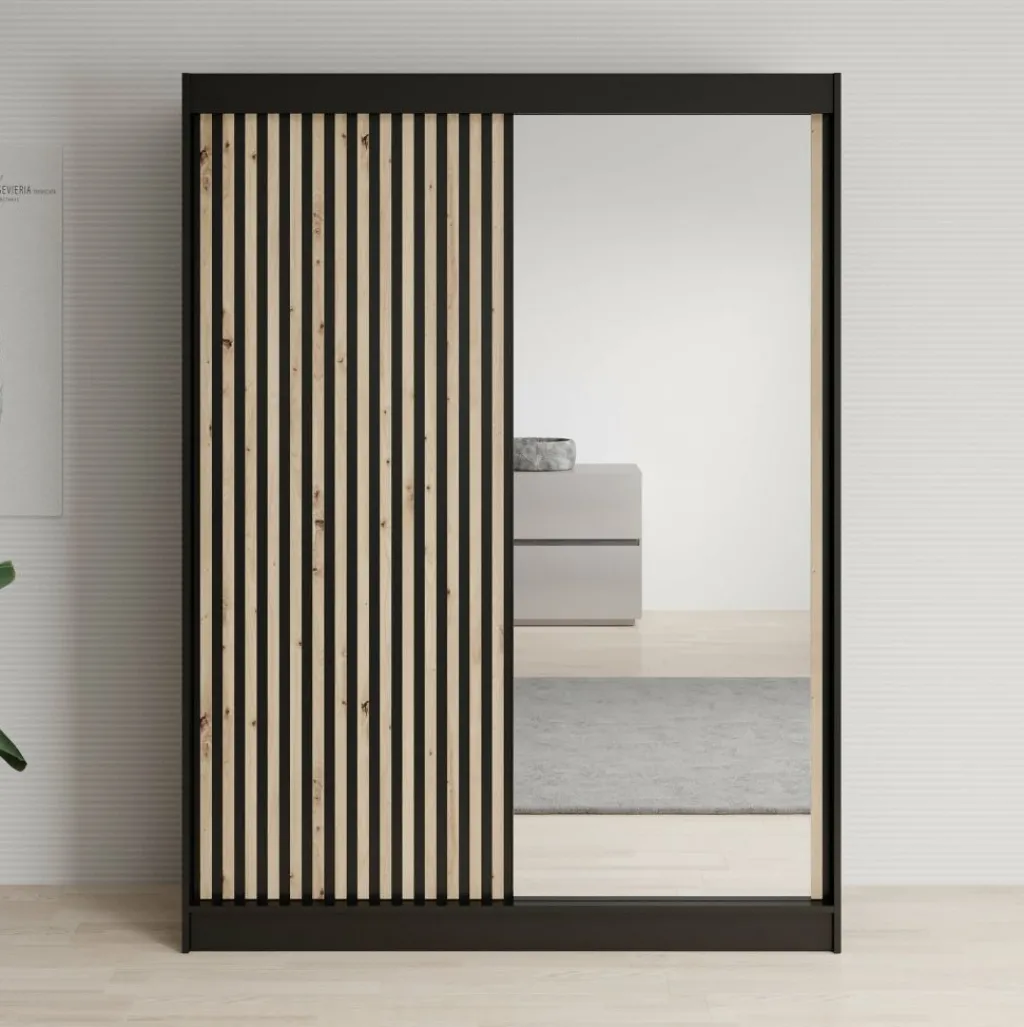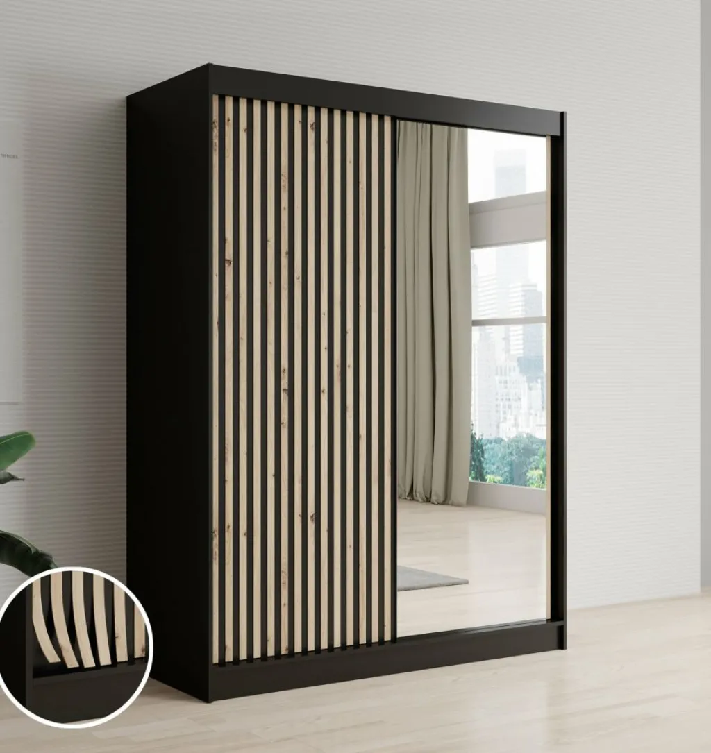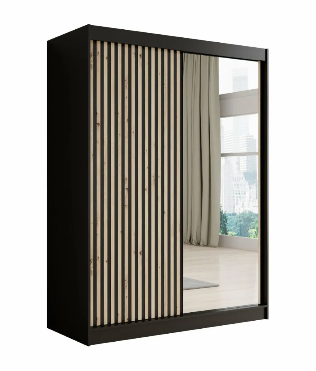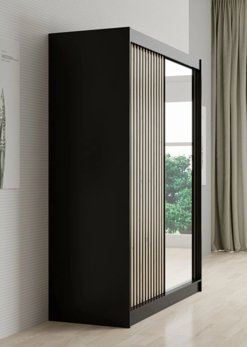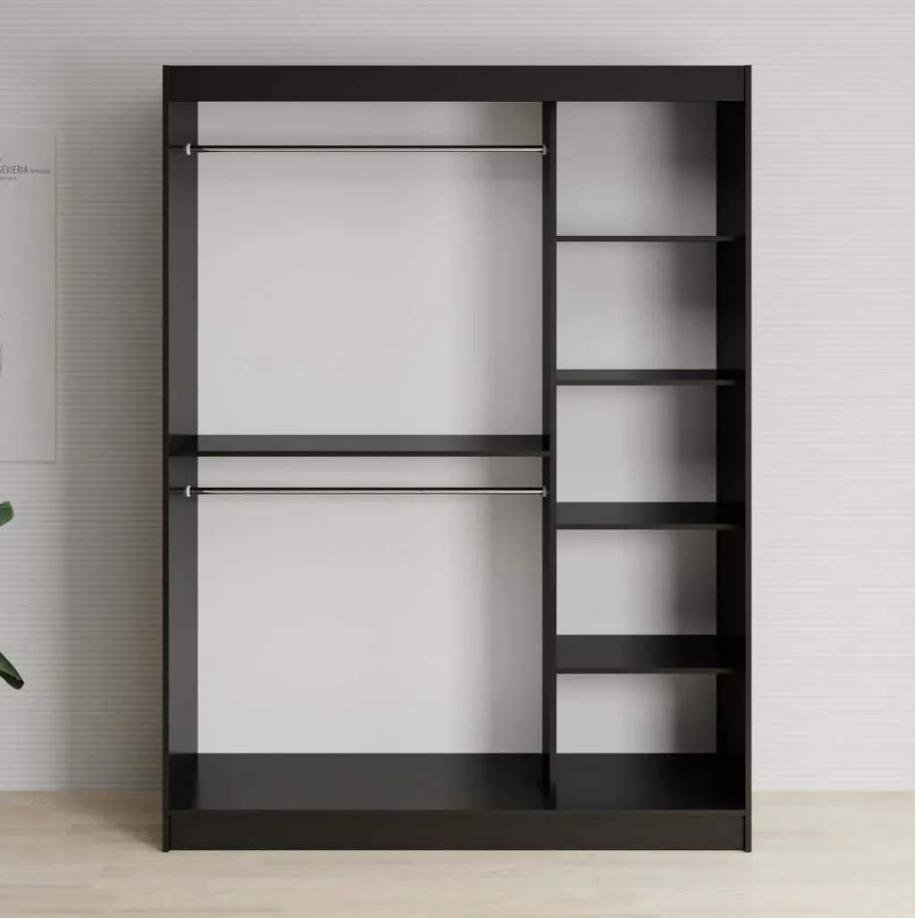 Kledingkast Lisbon is een garderobekast met ruime opbergmogelijkheden. Dit model is voorzien van 2 schuifdeuren. Op de rechterdeur bevindt zich een grote spiegel. Het binnenwerk bestaat uit 5 open schappen. Aan de linkerzijde van de kast is er een mogelijkheid om kleding op te hangen op de daarvoor bestemde kledingstangen. Dit model is afgewerkt in mat zwarte kleur met eiken kleurige details.