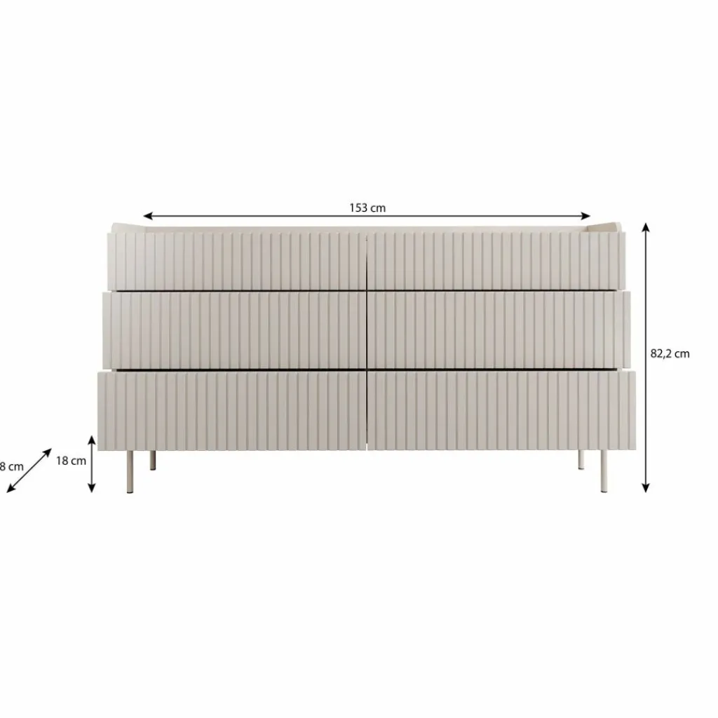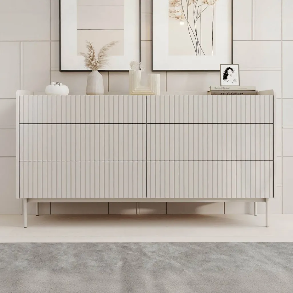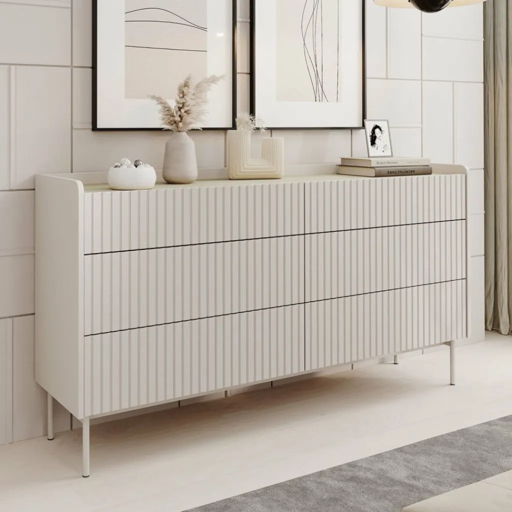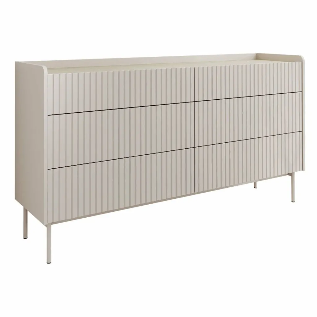 Ladekast Livako is een beige opbergkast in een moderne stijl. Het bovenblad is gemaakt in een eiken kleur. De kast beschikt over 6 lades die openen met het push to open systeem. De voorkant heeft een latten patroon wat de kast een unieke uitstraling geeft. Het dressoir staat op metalen poten.