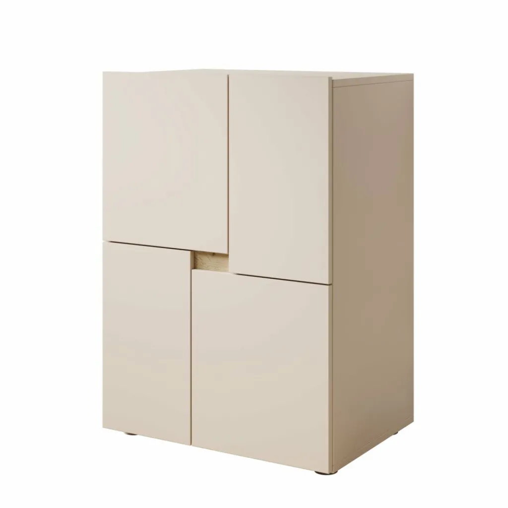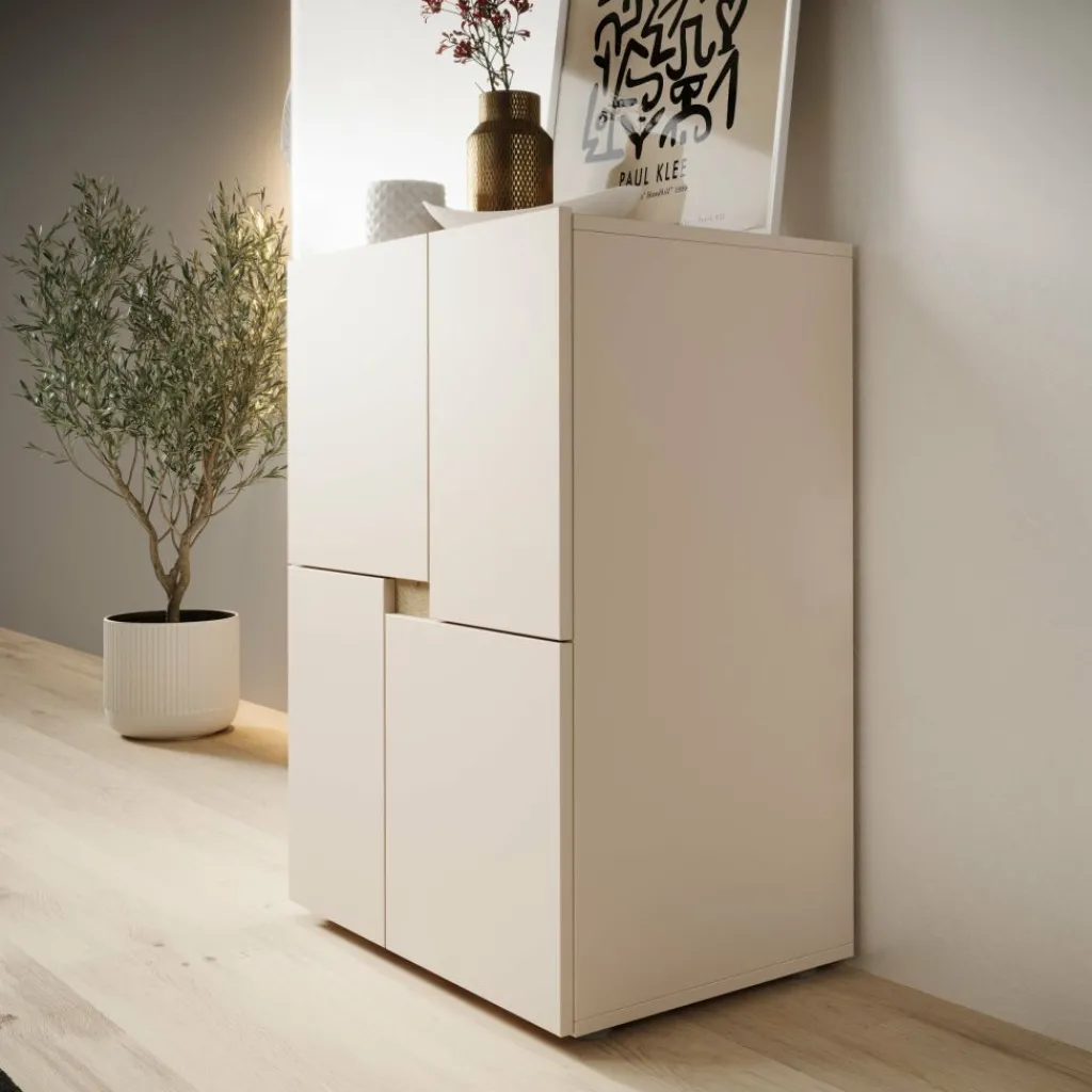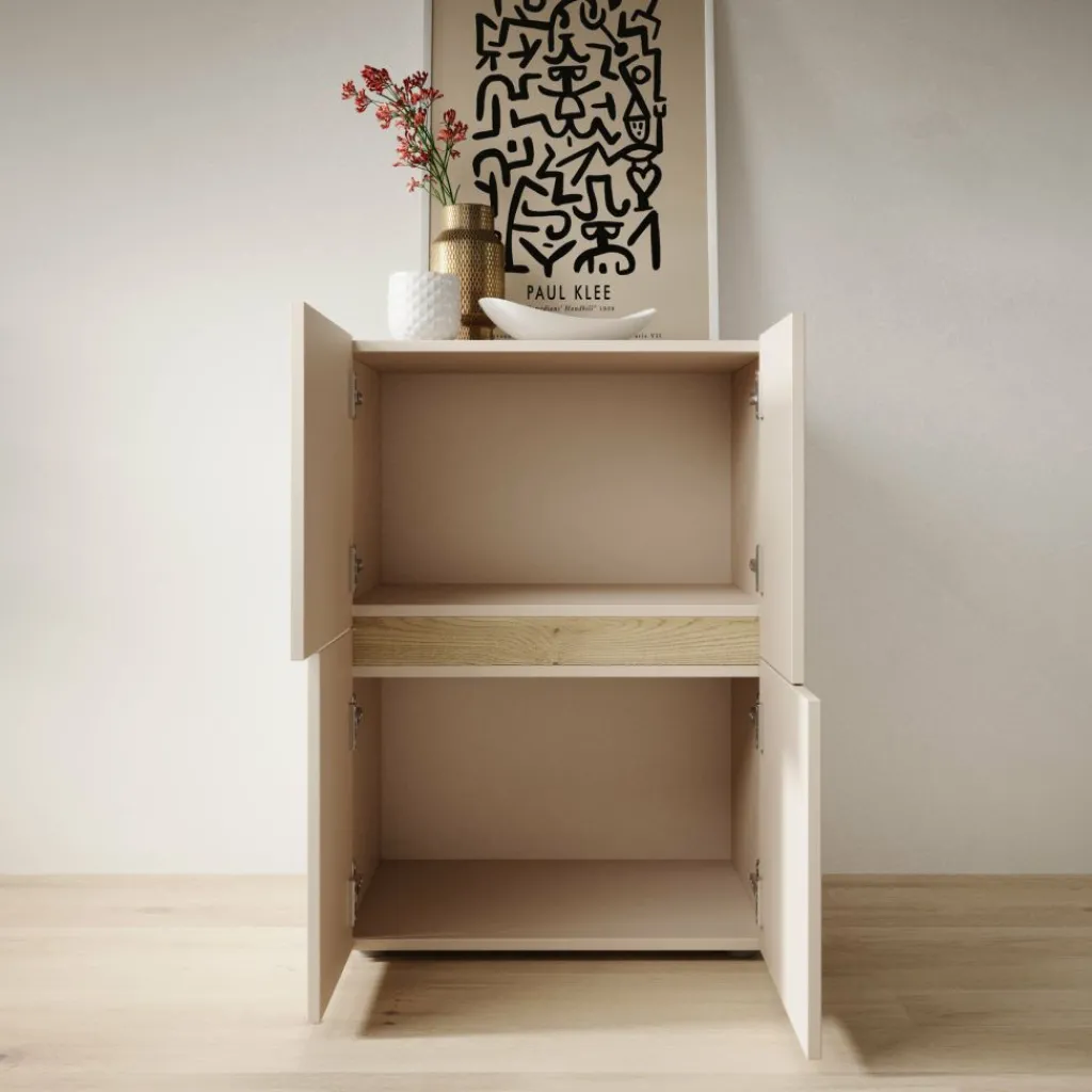 Het Lombok dressoir in beige is een compact meubel dat past in slaapkamers, woonkamers en halruimtes. De strakke vormgeving met greeploze deuren geeft een rustige en moderne uitstraling. Binnenin vind je twee ruime opbergvakken achter deuren, ideaal voor servies, linnengoed of documenten. Het bovenblad biedt ruimte voor decoratie of verlichting, waardoor het meubel zowel functioneel als sfeervol werkt in huis.