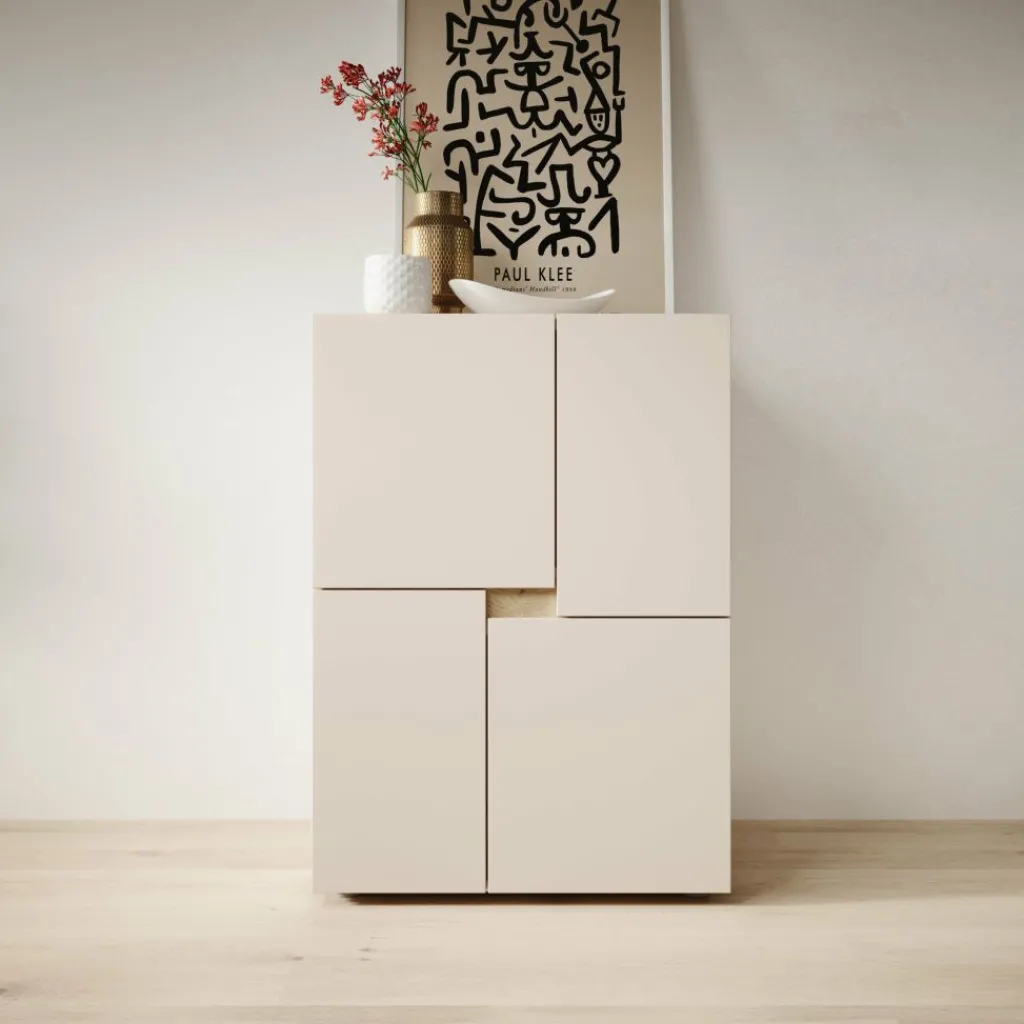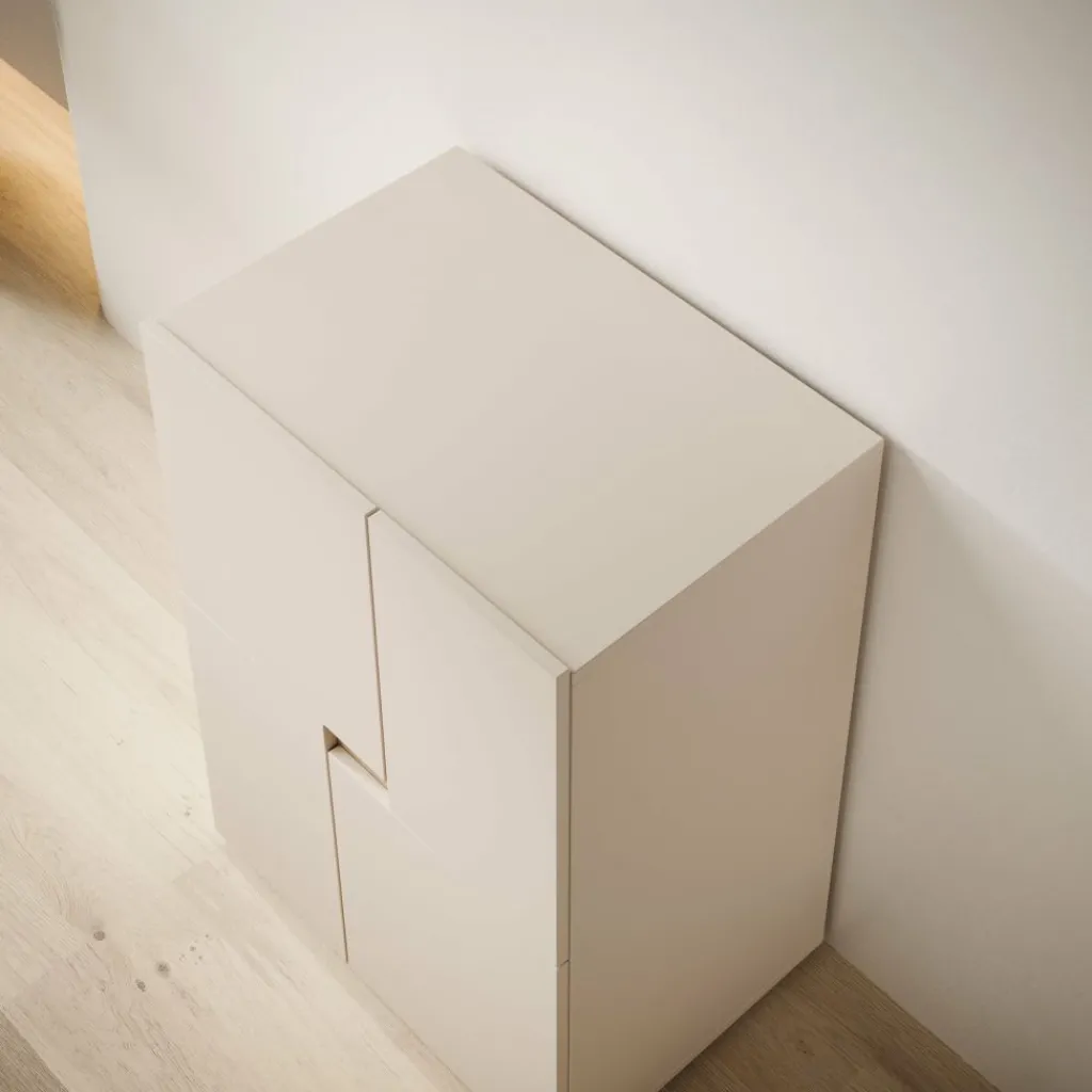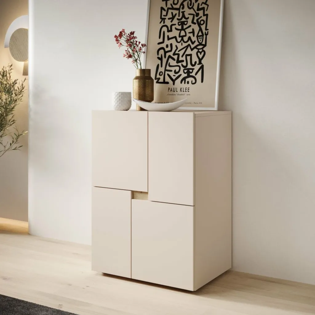 Het Lombok dressoir in beige is een compact meubel dat past in slaapkamers, woonkamers en halruimtes. De strakke vormgeving met greeploze deuren geeft een rustige en moderne uitstraling. Binnenin vind je twee ruime opbergvakken achter deuren, ideaal voor servies, linnengoed of documenten. Het bovenblad biedt ruimte voor decoratie of verlichting, waardoor het meubel zowel functioneel als sfeervol werkt in huis.